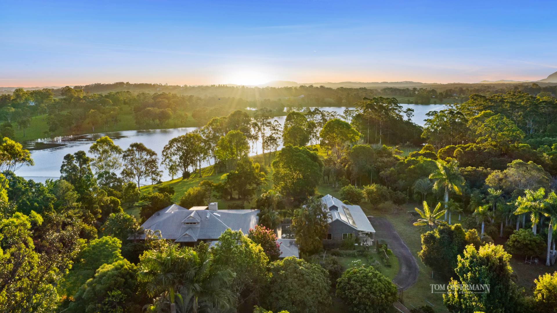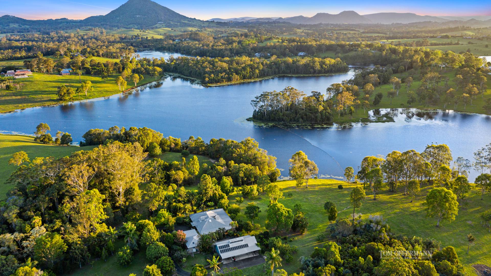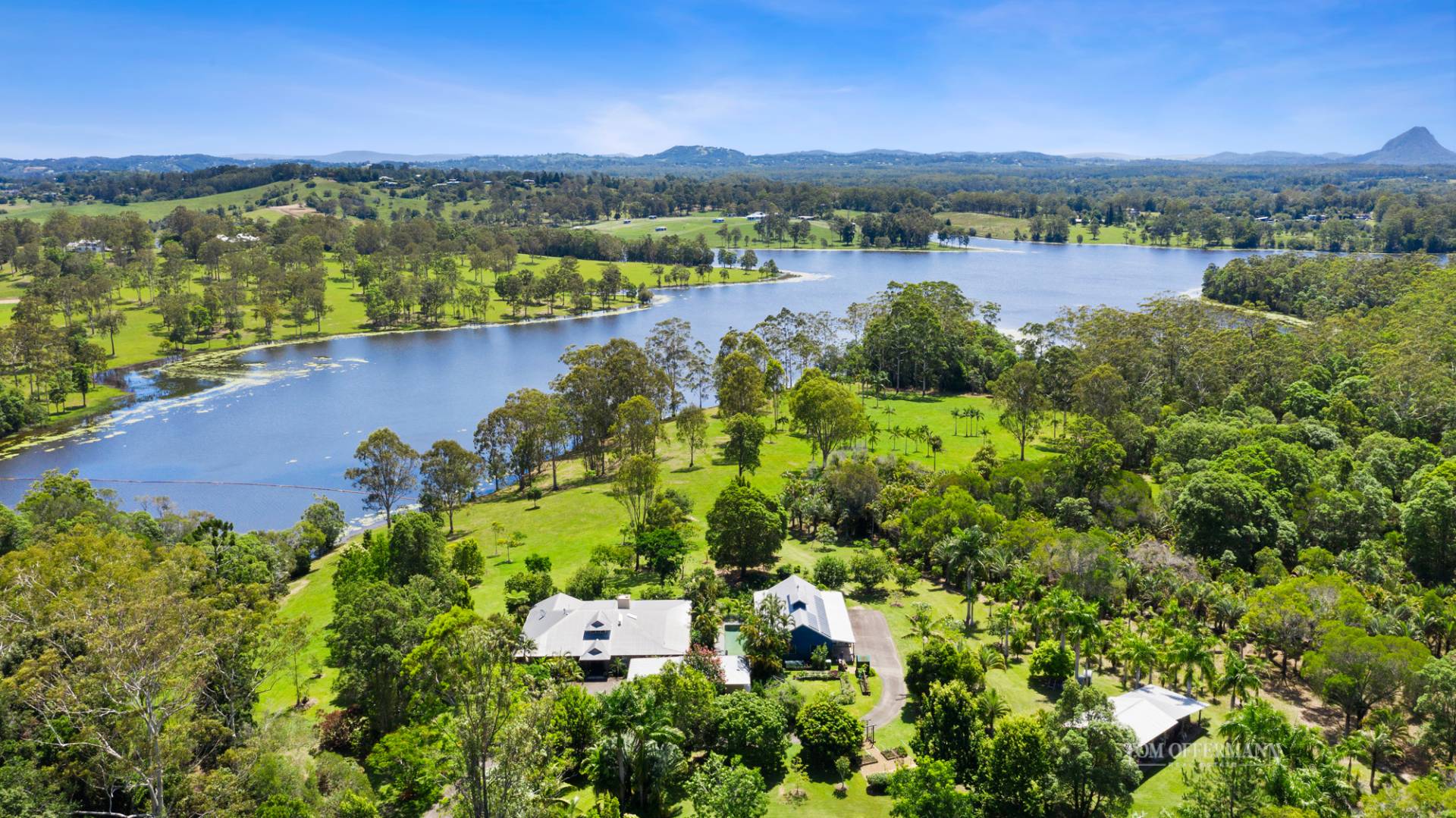 Located a scenic 10-kilometre sealed road distance from the shores of the Noosa River, this exceptional lakefront estate sits on a grassy knoll and encapsulates all that is wondrous about the Noosa Hinterland.
