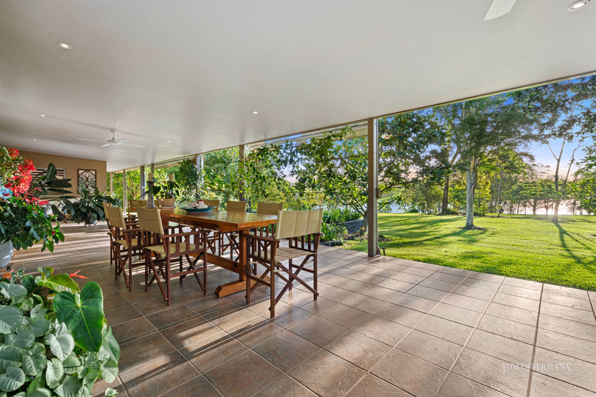 The asphalt private lane carries the name of its original owner, feeds just three other exclusive properties and culminates in a post and rail security keypad gate at 81, with just a hint of what lies ahead. The driveway rises gently along a tree lined drive of Poinciana, Frangipani and Leopard trees to deliver you into a wide forecourt approach, and the distinctive roofline of the beautiful homestead.