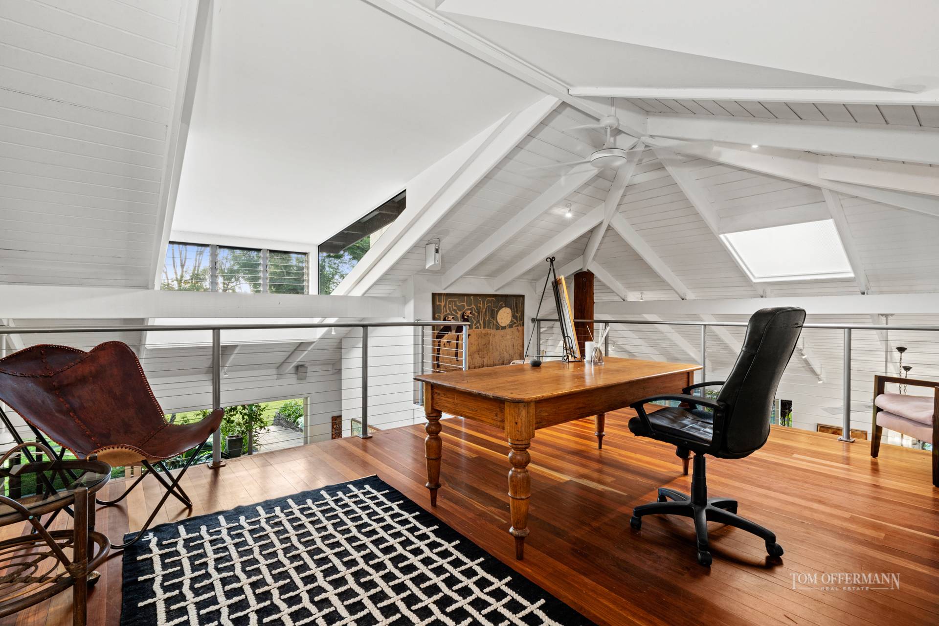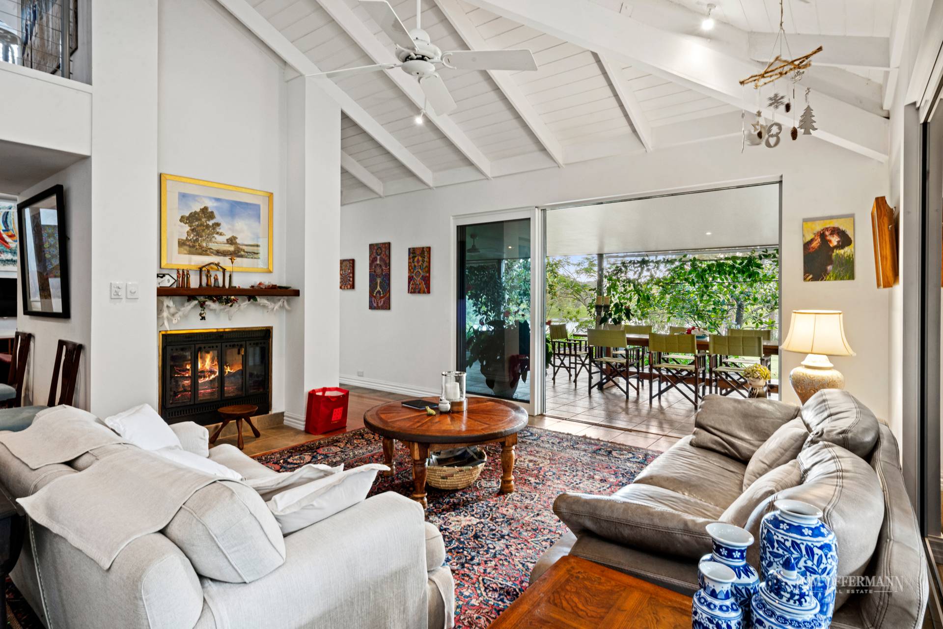 A flue climbs through the pitched ceilings, while a delightful mezzanine hovers over living rooms, and adjustable glass louvres and walls of sliding glass regulate a breeze.
