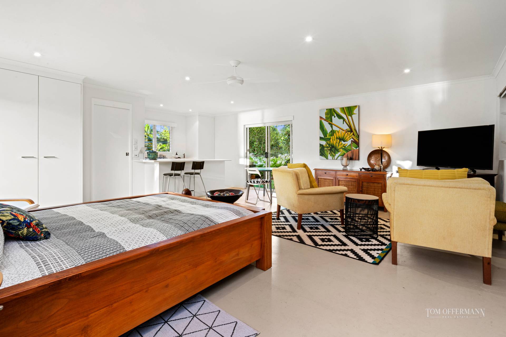 The sleekly construed galley kitchen anchors living areas, with a large walk-in pantry and a servery window linking to the poolside patio. The large pebblecrete pool is in tip top condition and what was once a large garage space, has been deftly converted into a serene self-contained guest suite privately positioned to the gardens and pool.