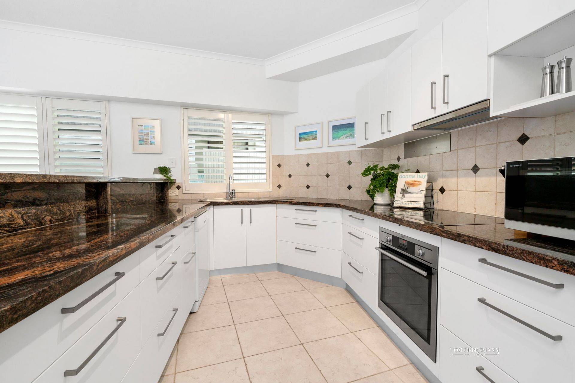 - About: north-facing; first floor walk-up apartment; tiled throughout; main bedroom w ensuite & built-in robe + access to terrace; 2 x queen-size bedrooms w built-in robes; family-size bathroom; ducted aircon/fans; inventory incl 2 TVs incl 65" smart TV - Kitchen: C-shaped, Dishlex dishwasher, microwave, electric cook-top, Fisher & Paykel French-door fridge, stone bench tops, pantry, slow cookers + all necessities for holiday rental