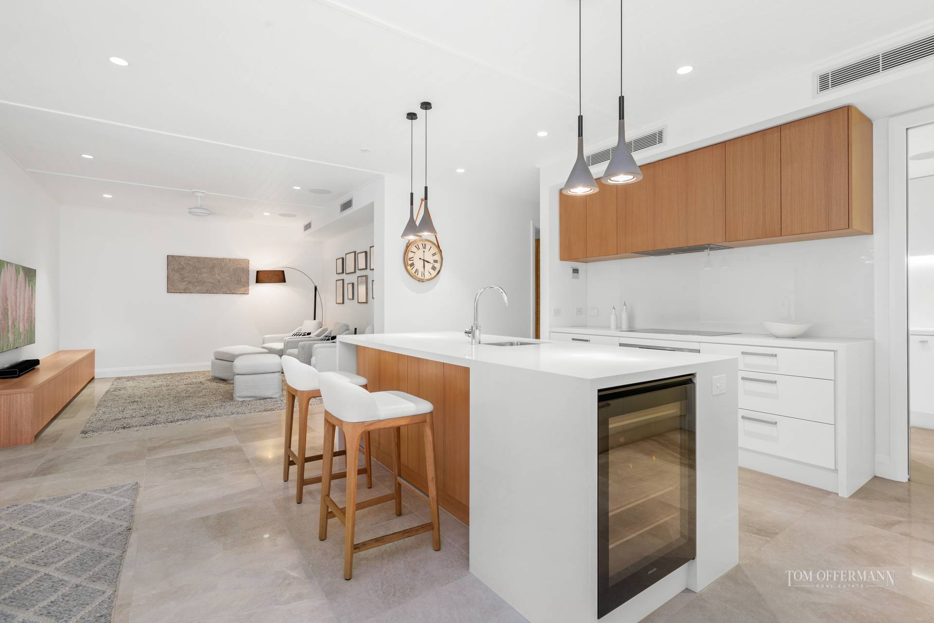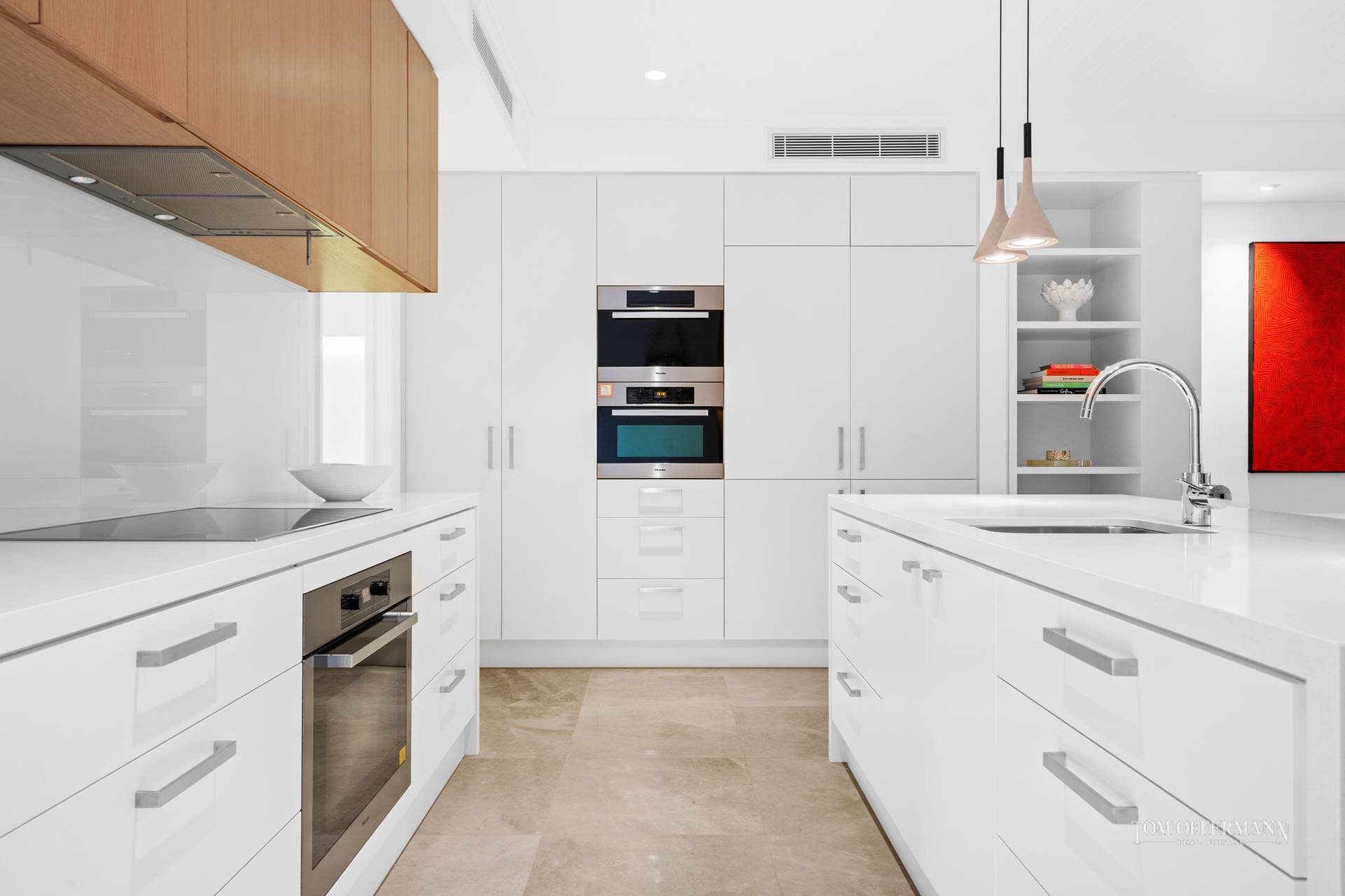 The island bench with its palette of caesar-stone, beech timber and American oak plus the on-trend Zip hydrotap is impressive, and the cabinetry's overall seamless look is attributed to integrating appliances, such as a Miele refrigerator and wine fridge.