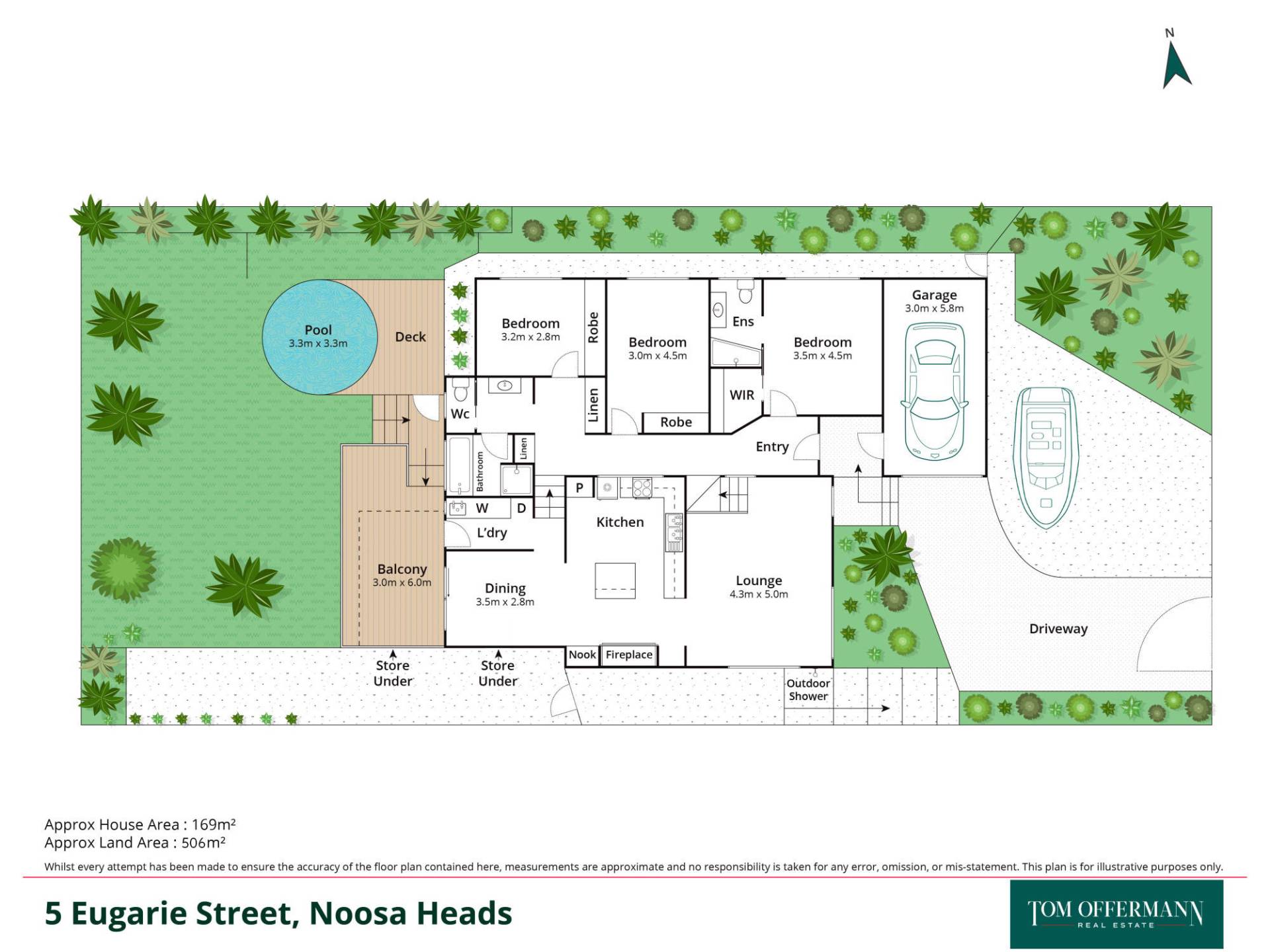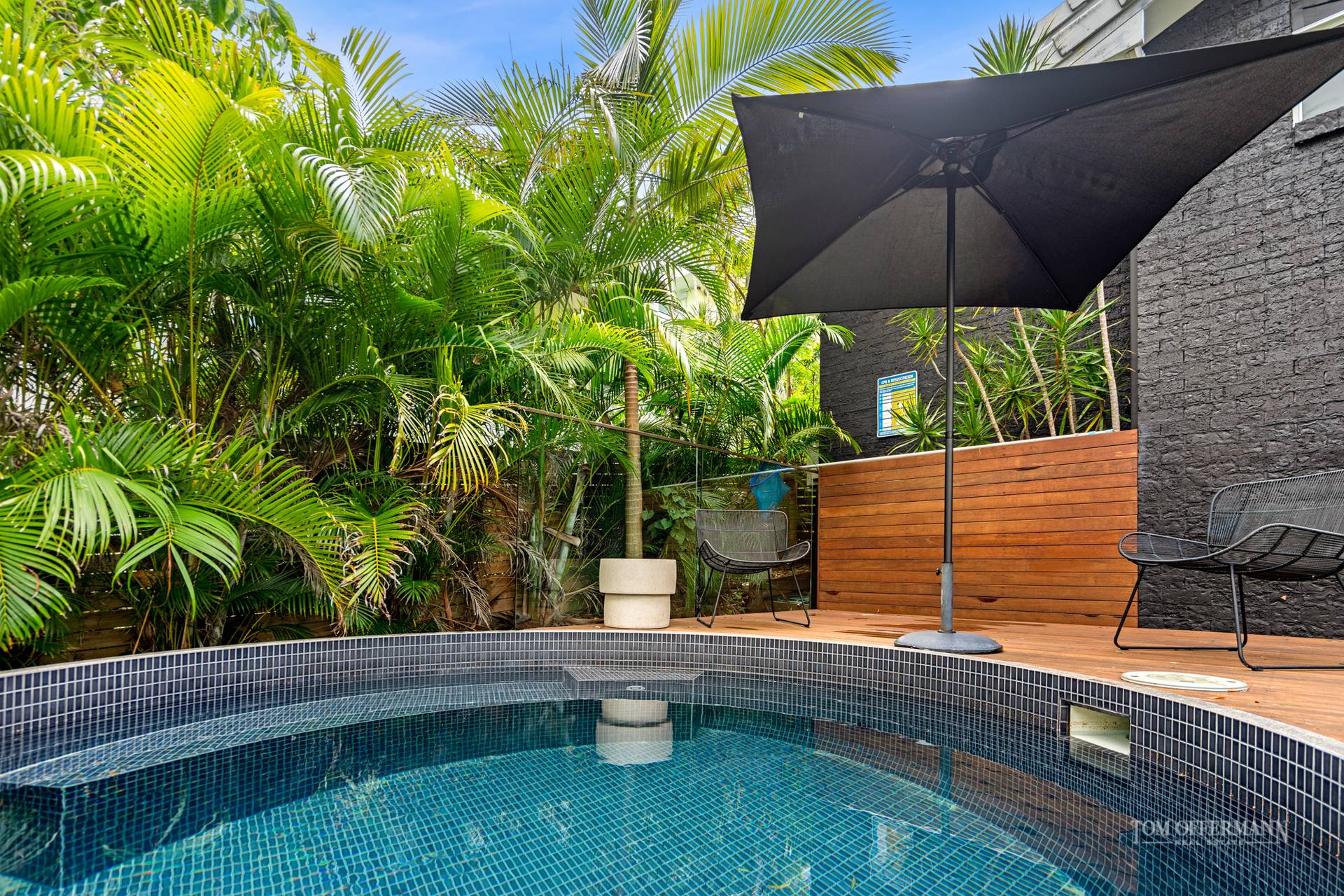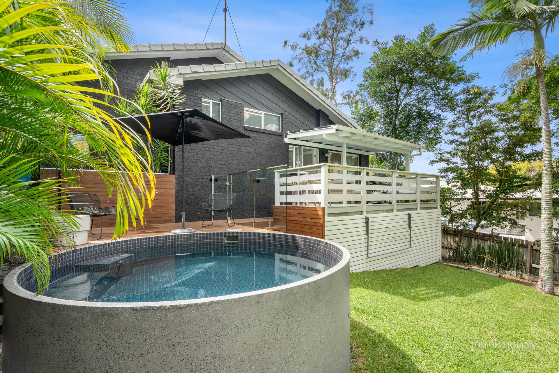 - Exterior/garden: large level grassed backyard; fully fenced, landscaped w palms; auto irrigation, tiled plunge pool with electric heat pump; dedicated storage under house; outdoor shower