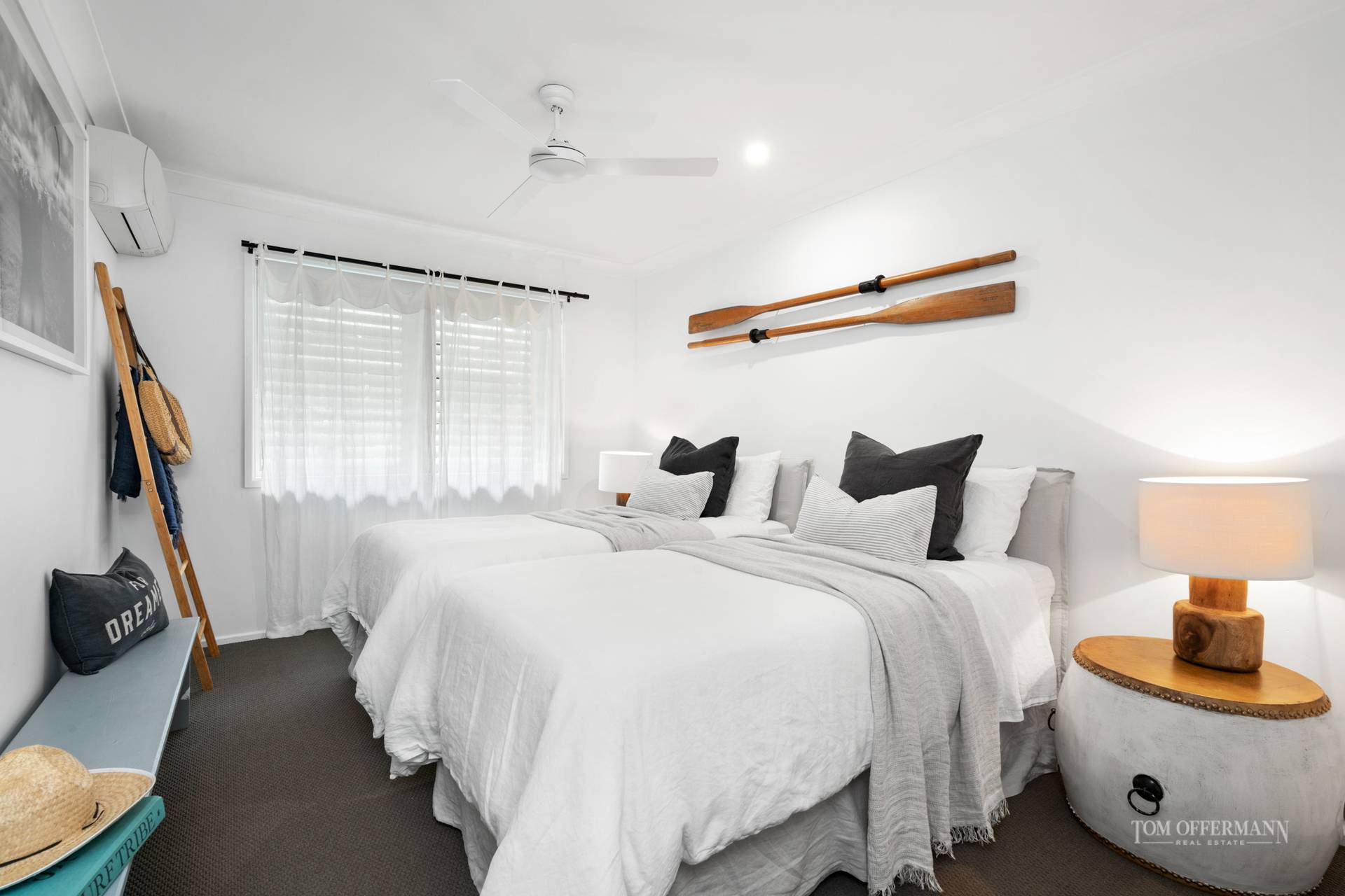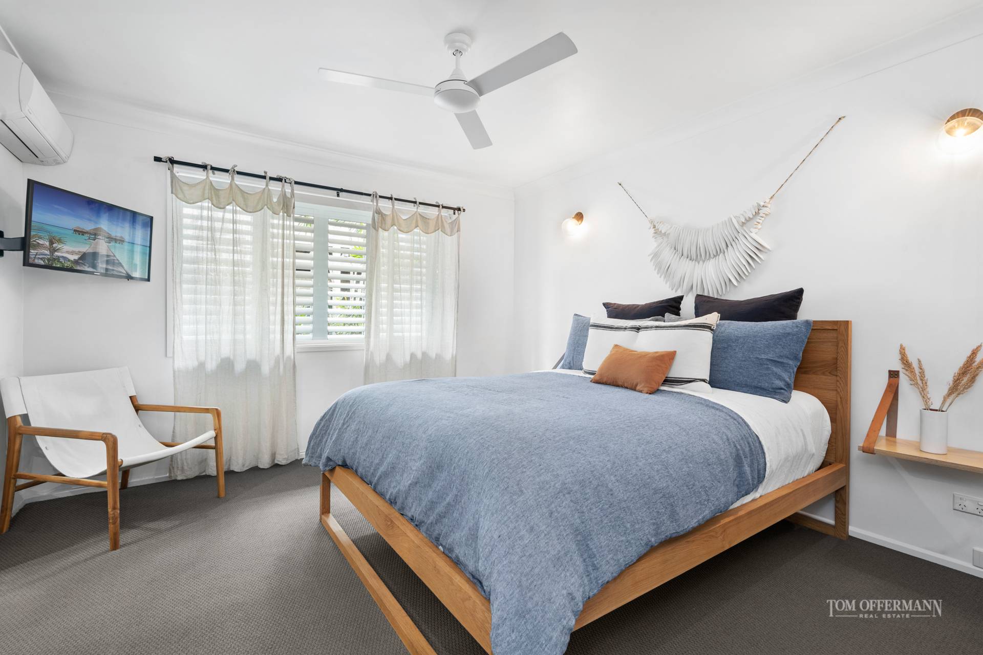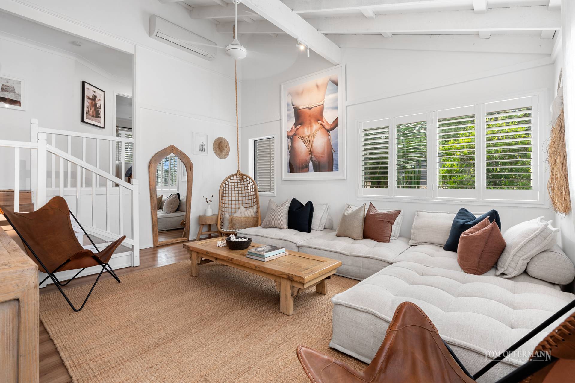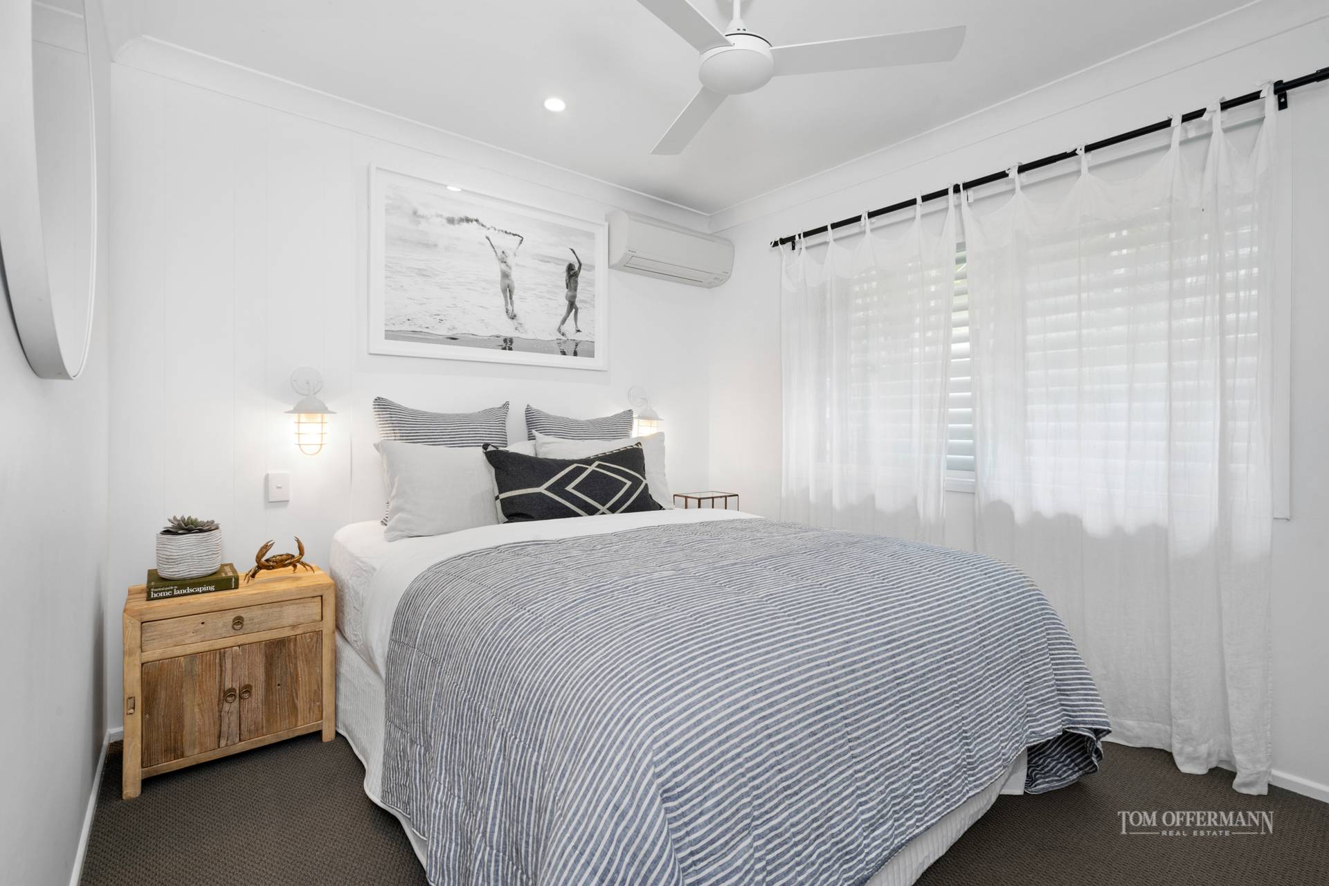 Seeing IS believing. Notice the stately Pandanas along the driveway, charcoal paintwork, pretty tiles at the front entrance, then step inside for the big reveal from the mezzanine. Oak timber flooring, pitched roof, white VJ-profile walls and plantation shutters, splashes of nautical accents, and spectacular albeit evocative limited edition prints by leading Australian photographic artists, set the scene.