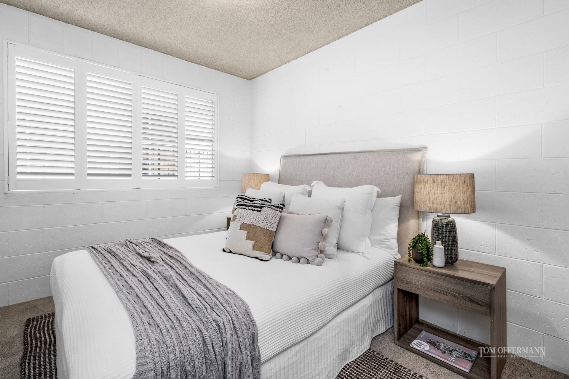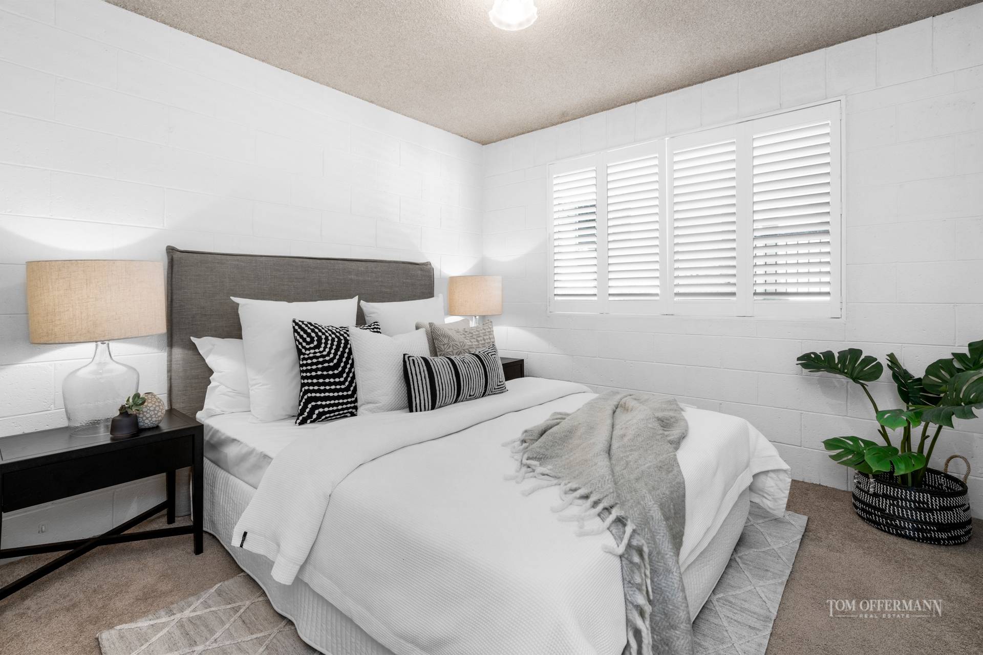 There are three bedrooms all with plantation shutters. Two queen-size bedrooms have built-in robes, the third bedroom could be a media room, and the family bathroom also has laundry appliances.