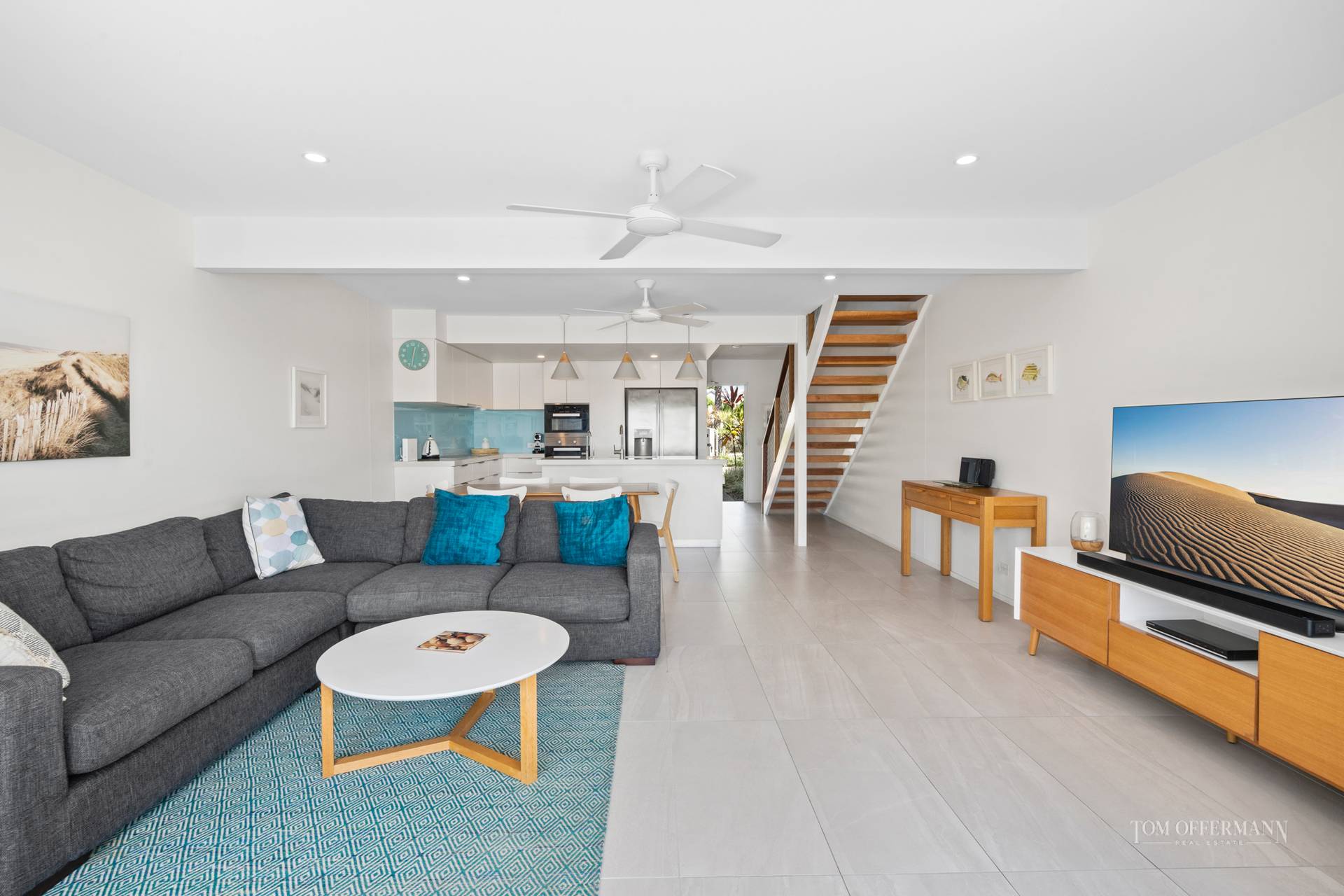- About: 2-level townhouse recently renovated throughout; 2-beds/2-baths + loft + powder room; coastal cool floor tiles; timber treads w marine-ply balustrading; carpet upstairs; aircon/fans; smart TV/soundbar; fully equipped laundry w Miele washer & Simpson dryer