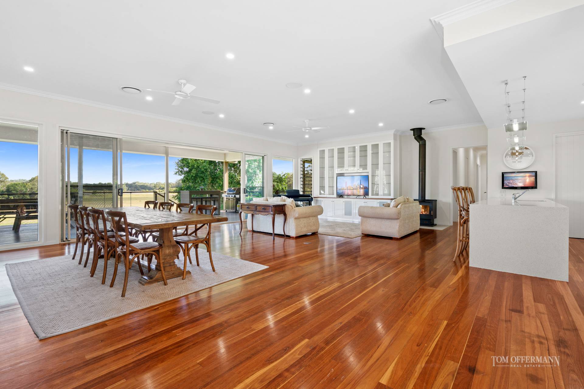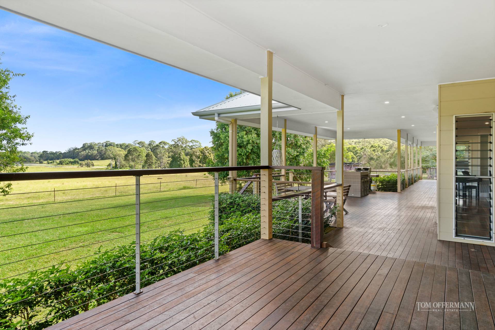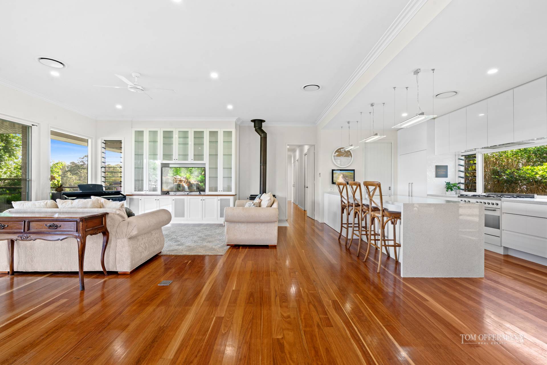 A broad roofline and deep covered verandahs set the scene for an exceptionally generous hinterland home abounds in comfort and quality appointments. Large format windows and doors accentuate livability and function, while three metre down lit ceilings catch light and spread a soft glow across wall free living and rich hardwood floors. The hub of the home is anchored by a beautifully crafted bookcase and the winter warmth of an internal combustion fireplace. A crisp white kitchen sports a Smeg white six burner gas oven, waterfall stone island bench and the luxury of a large butler's pantry with second sink and preparation bench.
