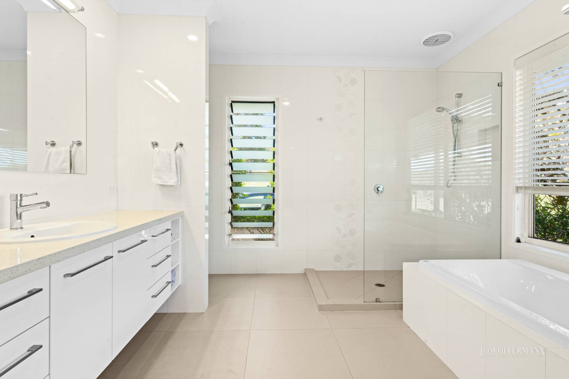 Ducted air conditioning is rarely in use given a prevailing breeze across the waters of the lake. The instantly recognised shape of Mt Cooroy stands as a sentinel in the picturesque landscape. Set privately away in the eastern wing an indulgently large main bedroom holds a massive walk- in wardrobe and sleekly styled ensuite with direct access on to the wide wrap around verandahs.