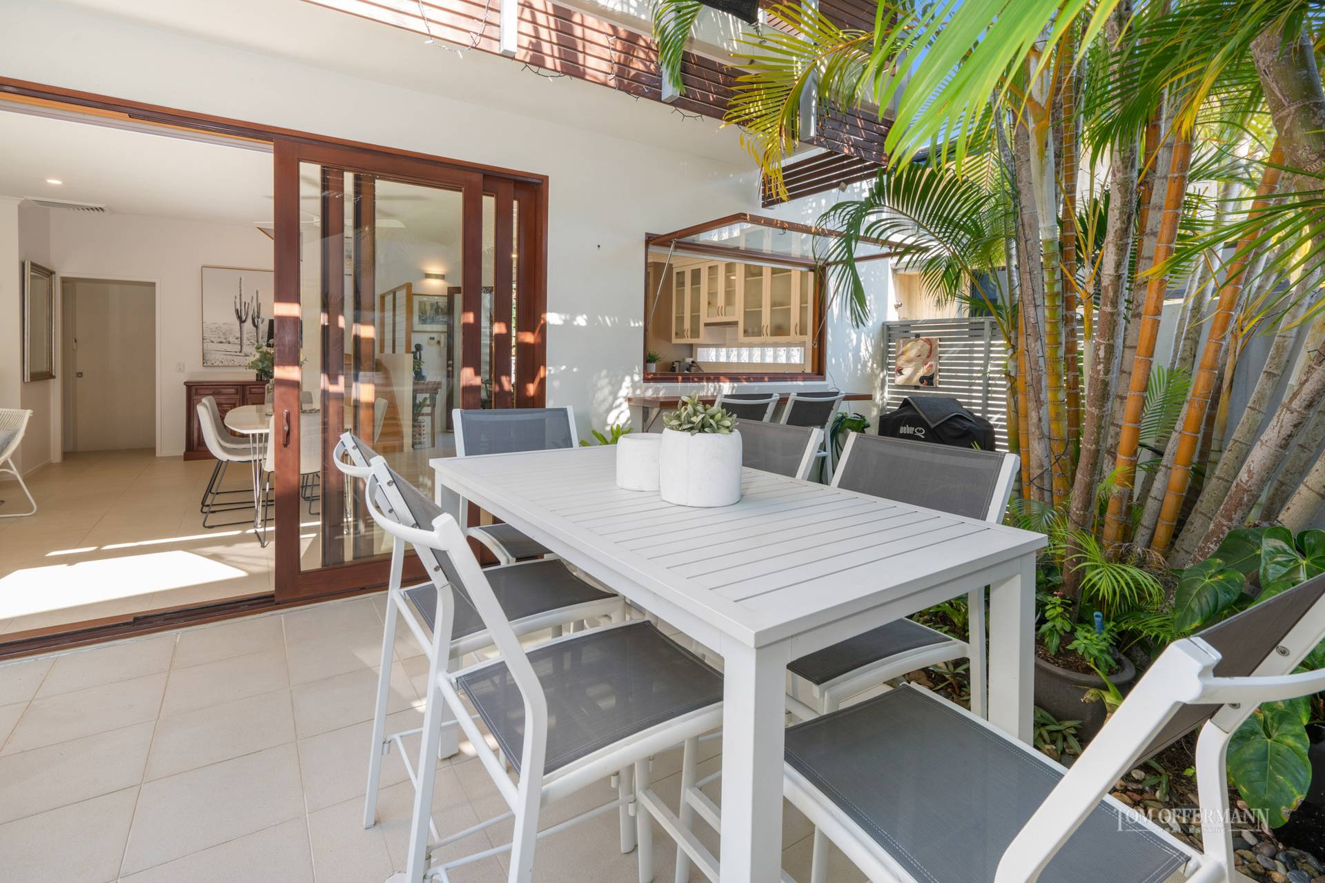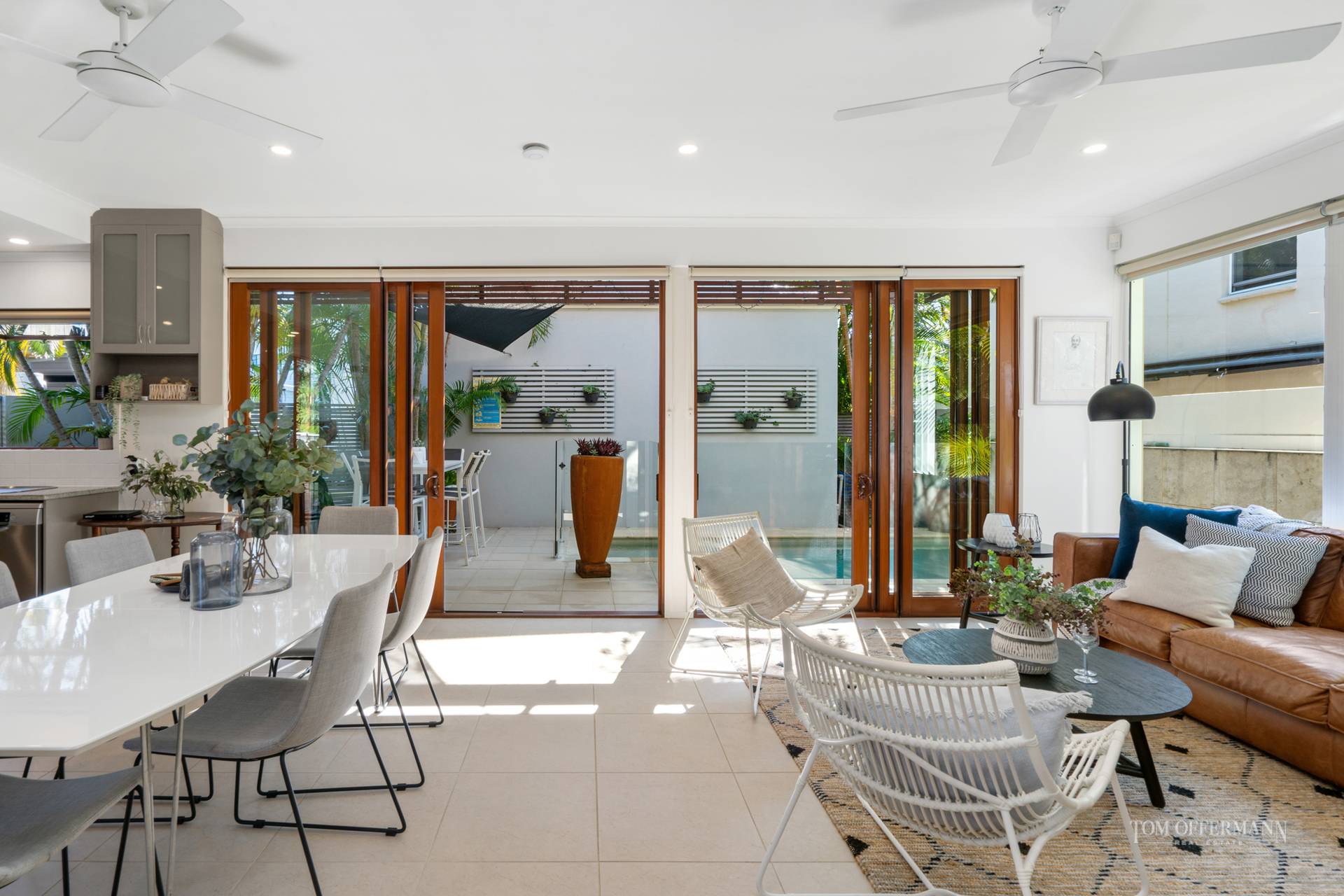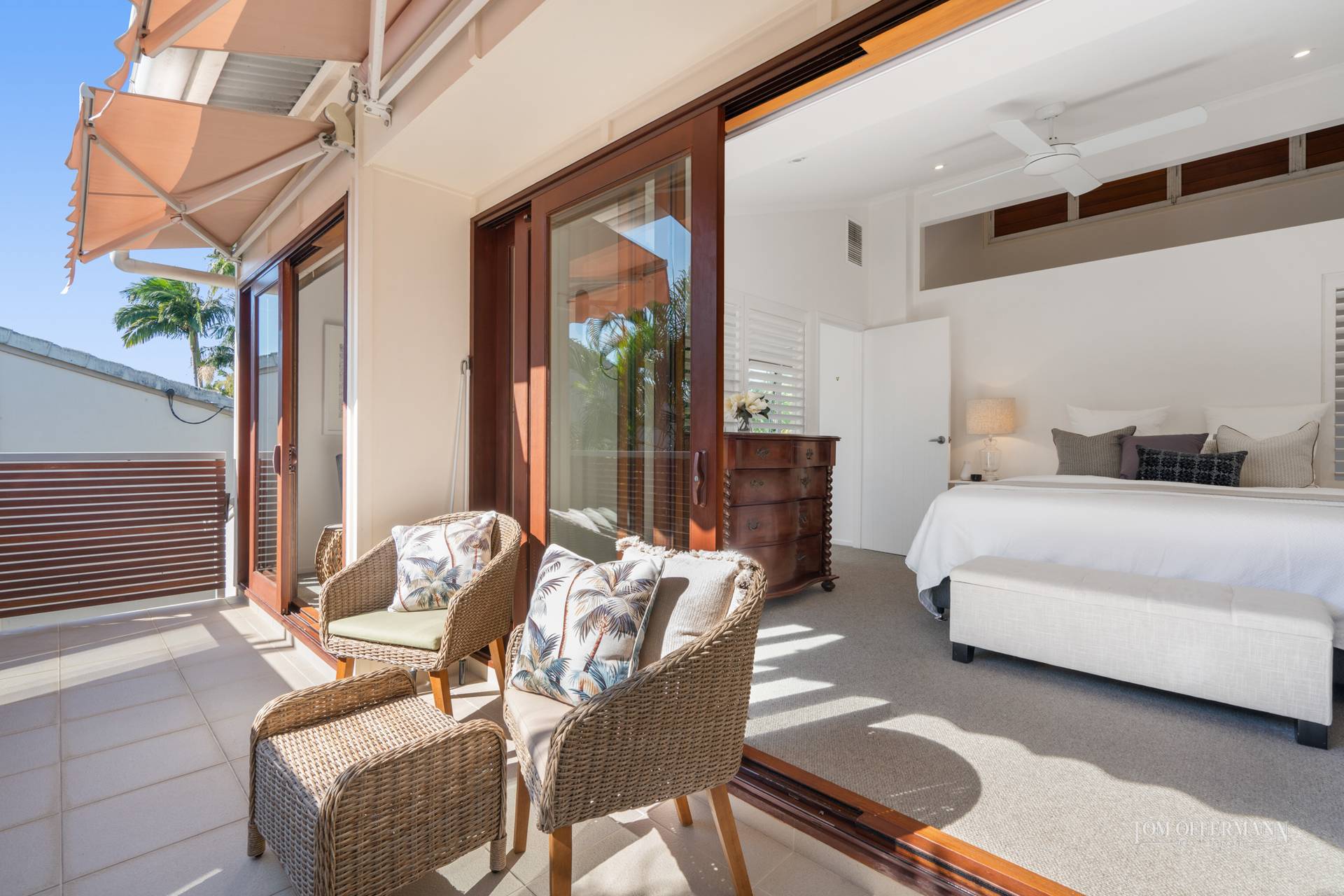 Follow the sun everywhere from inside your home. Warming north-eastern light floods the living areas, master suite, upstairs balcony and library/3rd bedroom throughout mid morning. In the afternoons, filtered western sun trickles in through the courtyards palms, lighting up the kitchen through the servery window. The plunge pool and lap lane hugs the living area, giving an open, resort villa sense of relaxation from anywhere in the living room.
