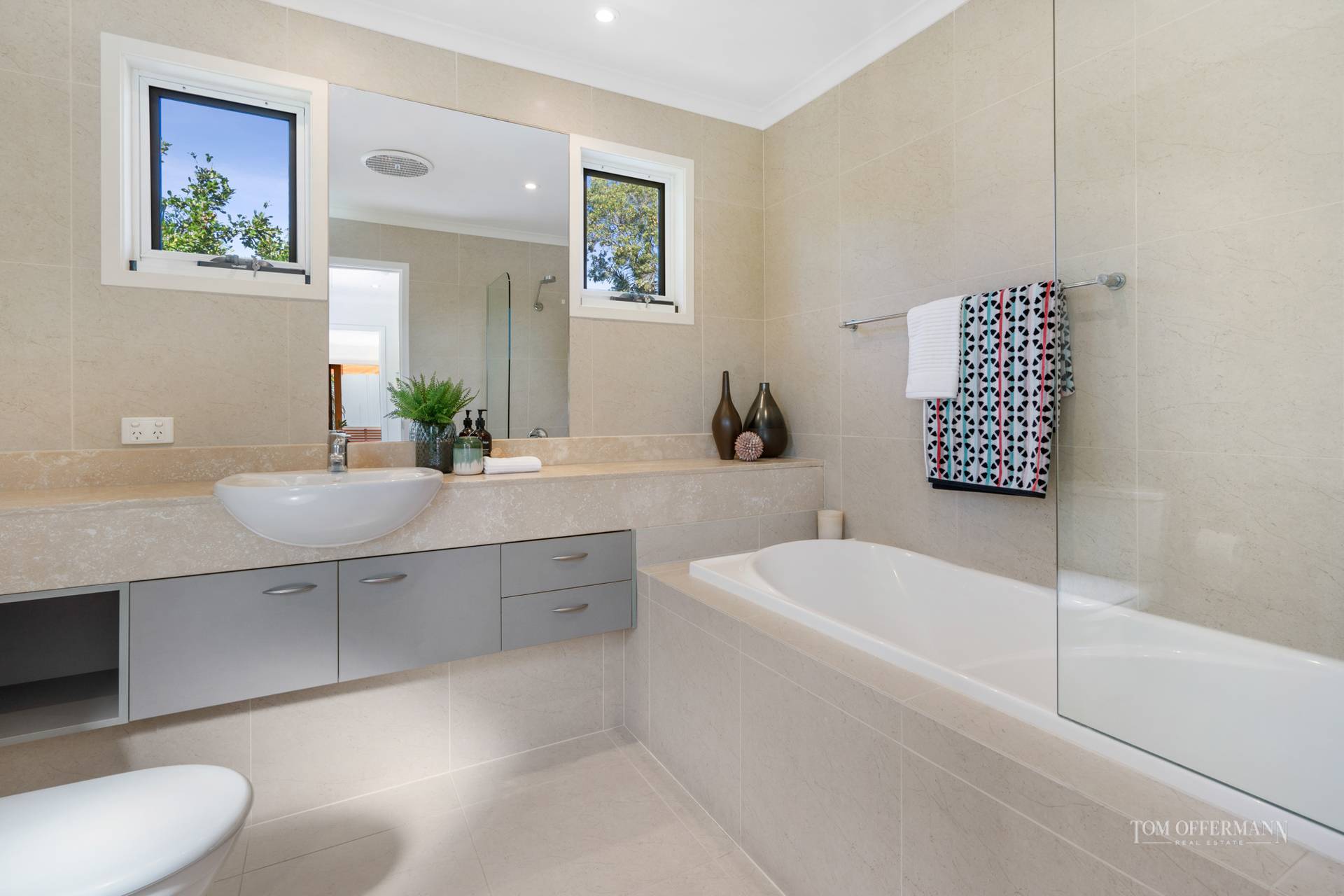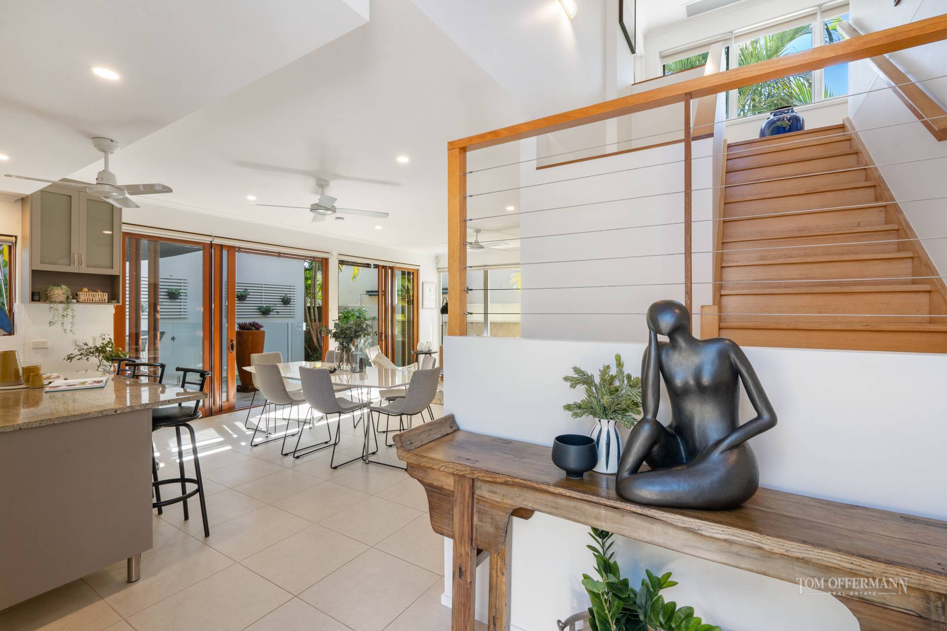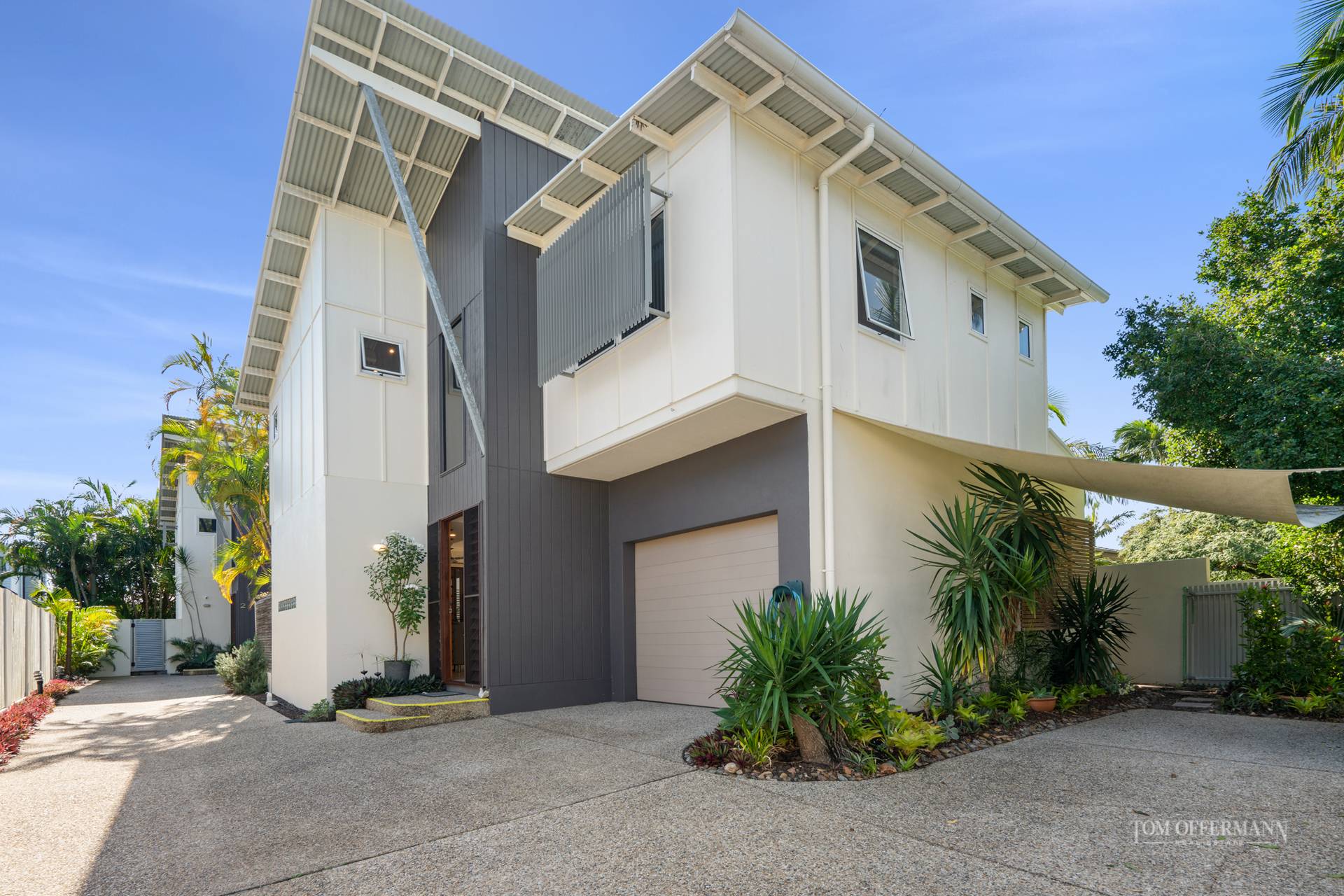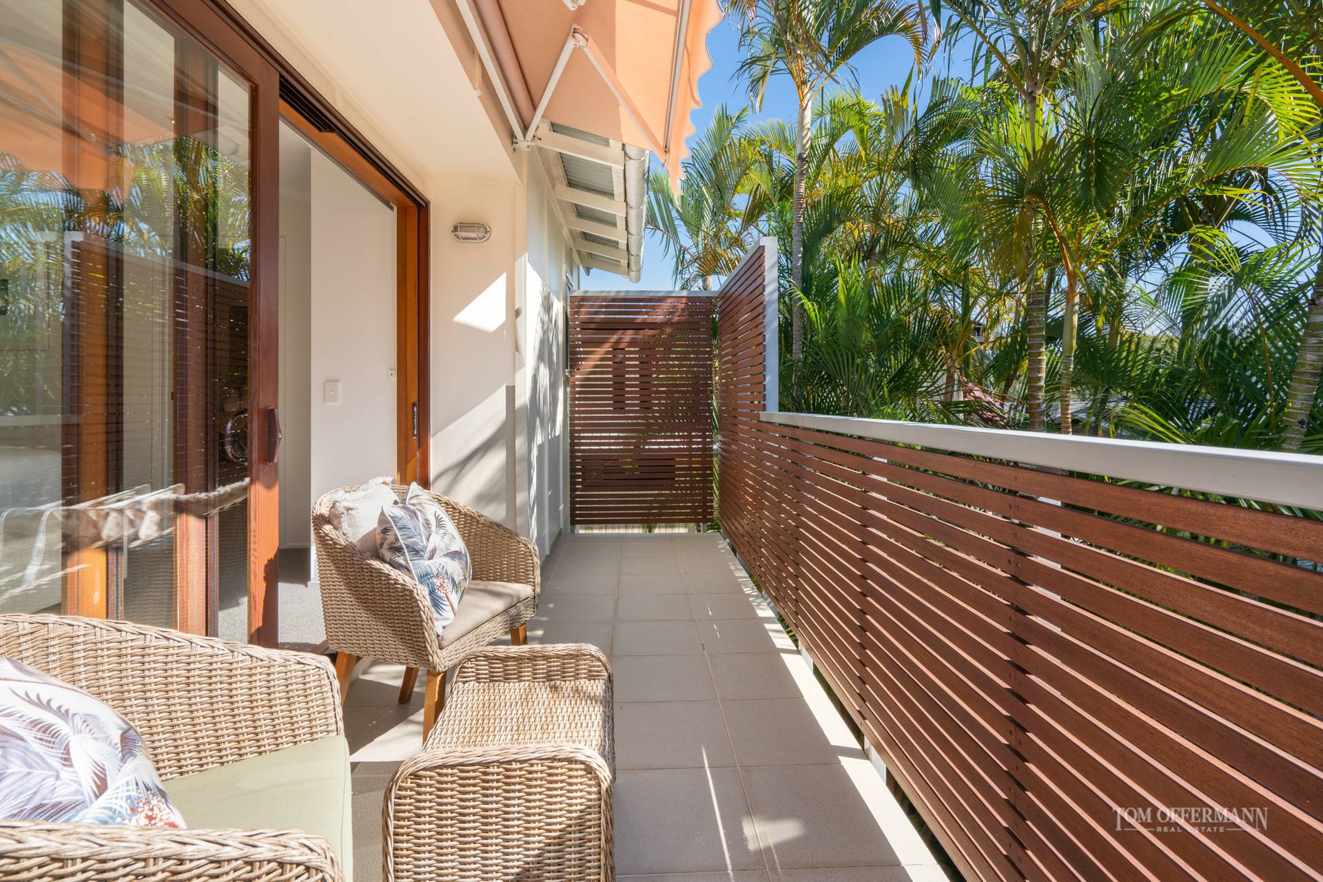 Follow the sun everywhere from inside your home. Warming north-eastern light floods the living areas, master suite, upstairs balcony and library/3rd bedroom throughout mid morning. In the afternoons, filtered western sun trickles in through the courtyards palms, lighting up the kitchen through the servery window. The plunge pool and lap lane hugs the living area, giving an open, resort villa sense of relaxation from anywhere in the living room.