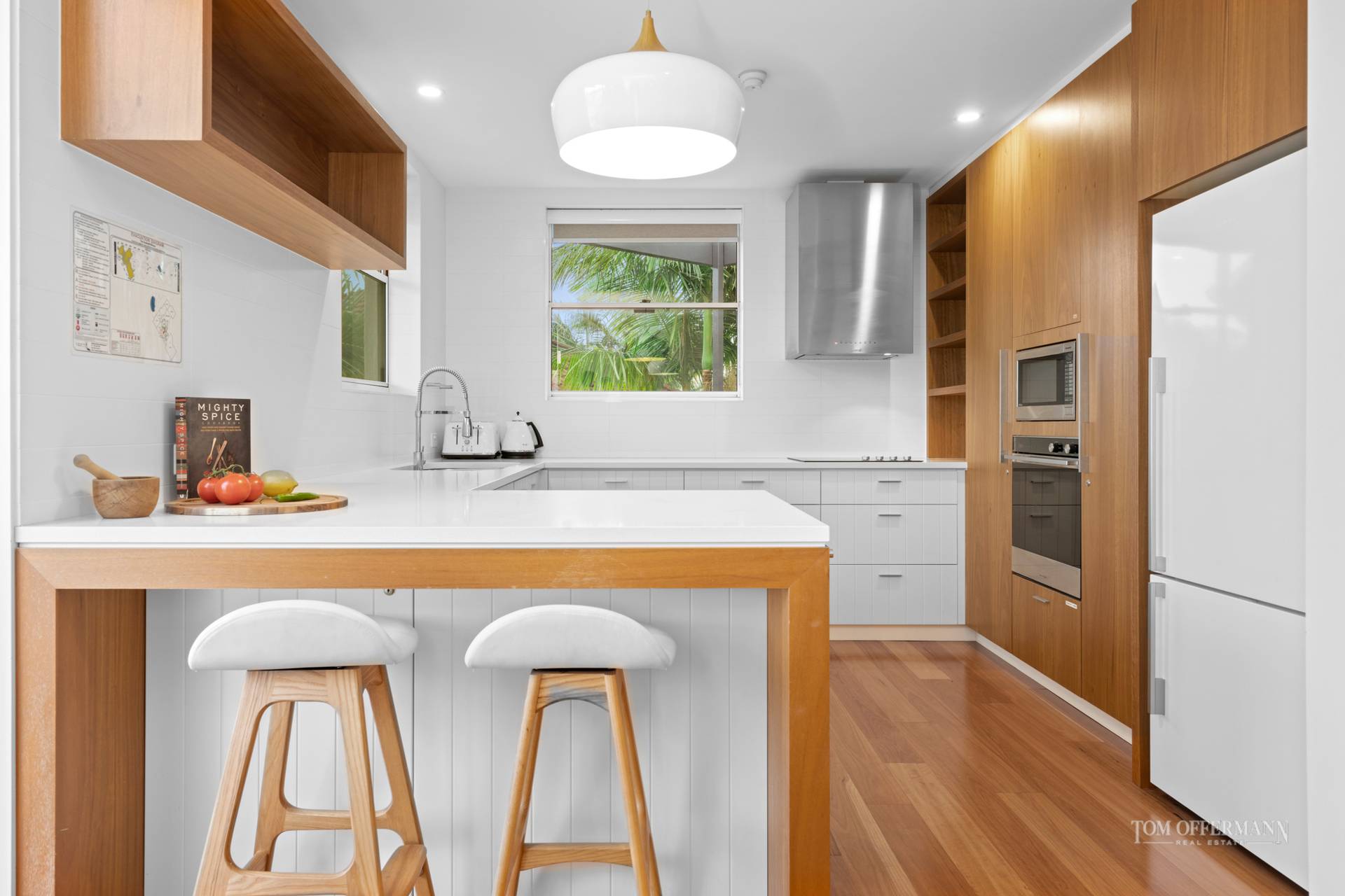 Welcoming the home chefs, a glamorous white and golden oak hued, fully equipped kitchen with neutral stone bench tops further complement the aesthetics. Seamlessly connecting with the dining and alfresco terrace, the complete configuration is ideal for enjoyable entertaining on those gorgeous Noosa days, poolside.