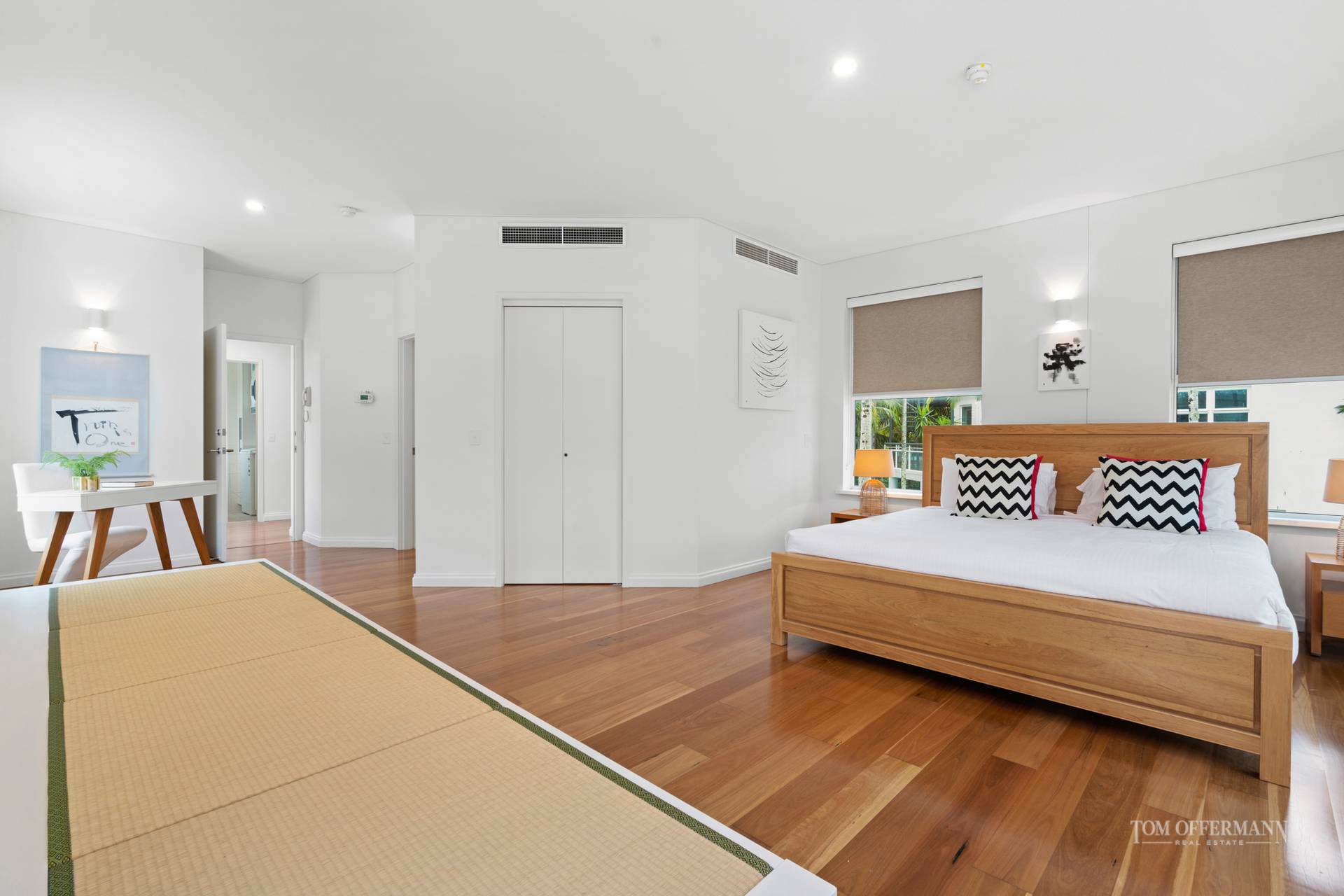 Elevator access straight from the secure carpark into the heart of the apartment is a fitting feature for The Royal Penthouse and the master suite is enormous, hosting a king size bed, two desks and grand Tatami style day bed with ease. An adjoining walk-in robe and luxuriously appointed bathroom with skylights add further attraction and opulence to the space.
