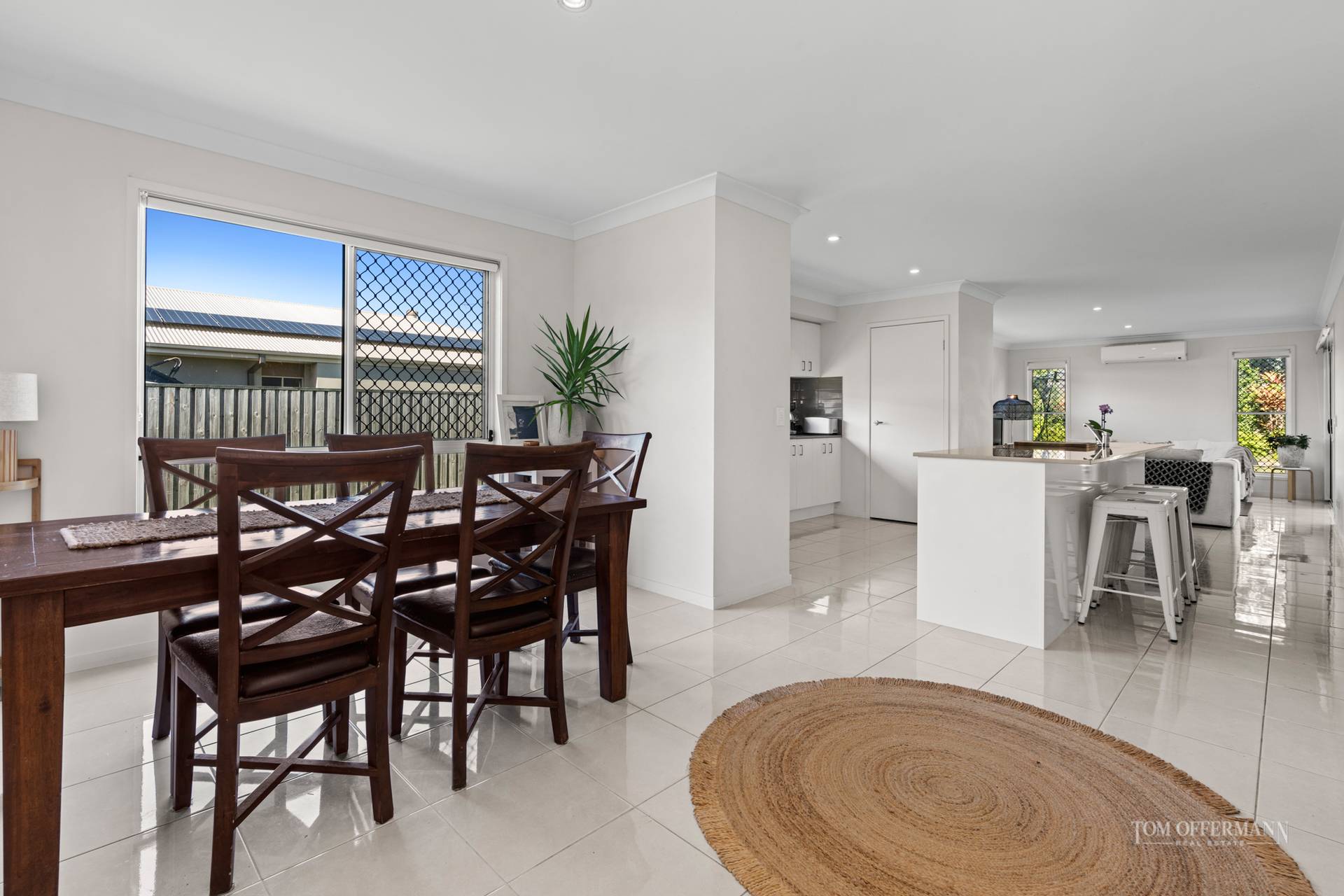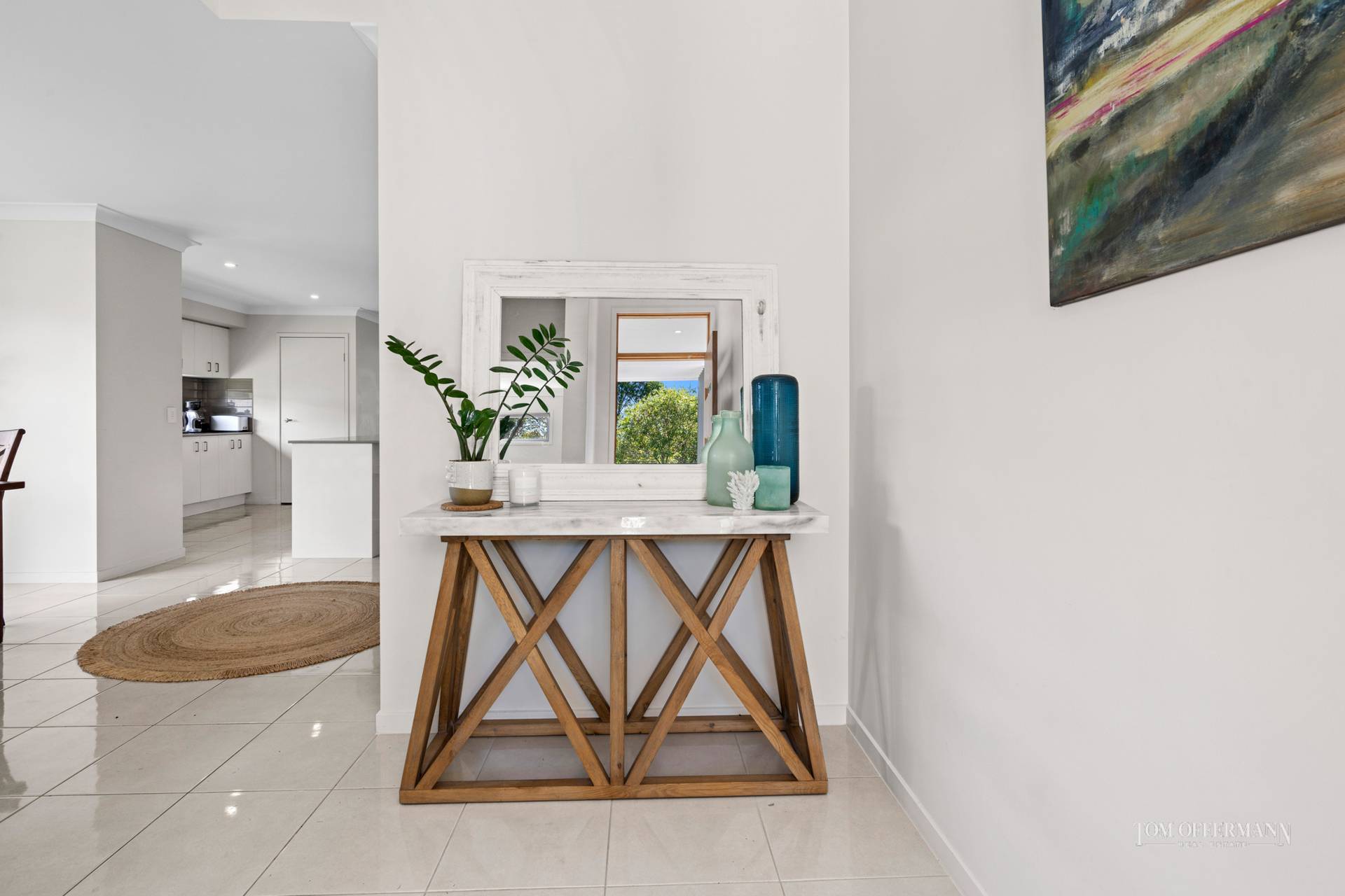 Look along the cool, white-tiled hallway, but first be enticed by the master suite on the left. It looks out to the front garden and has a walk-in robe plus ensuite.
