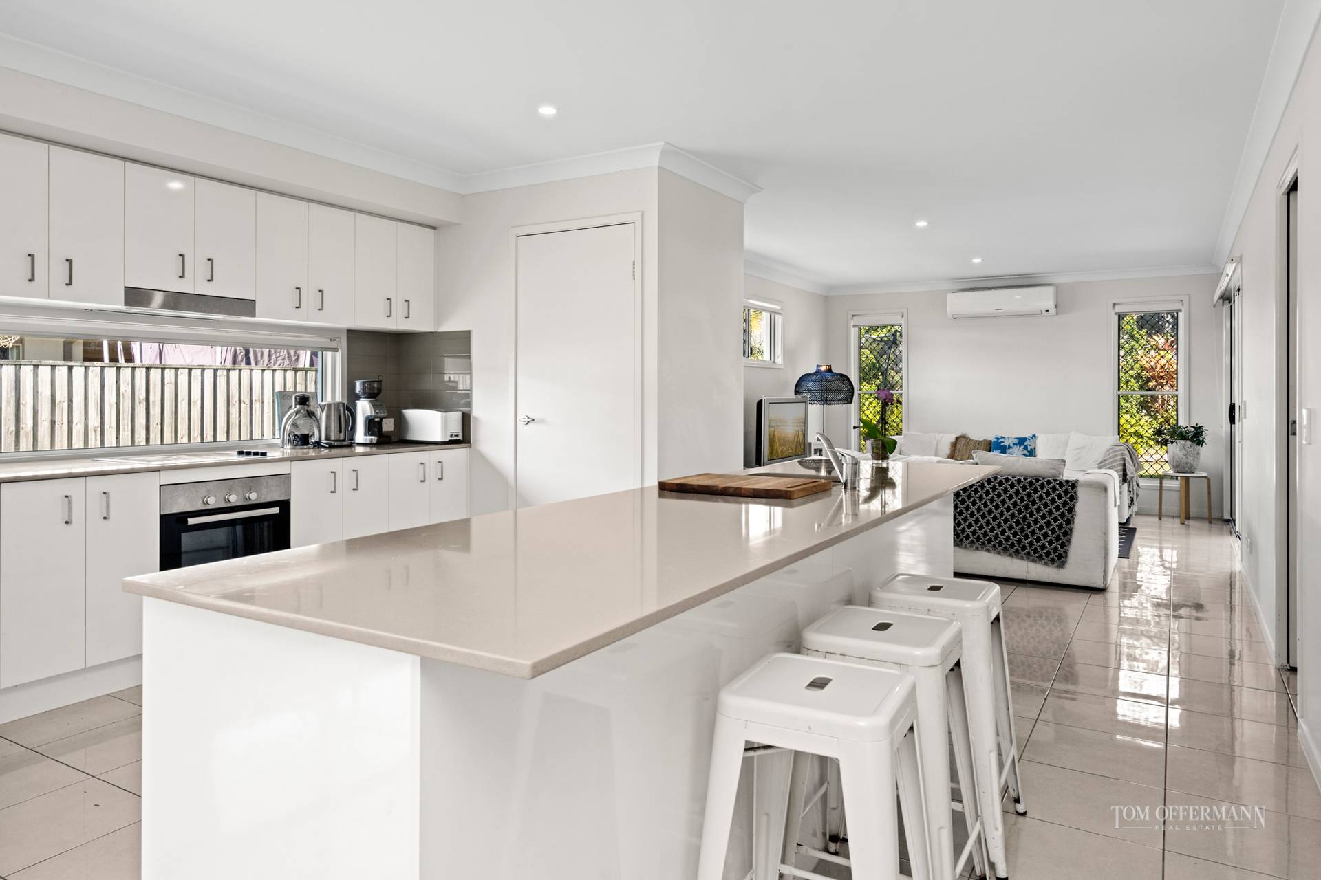 A very generous open plan area with easterly orientation stretches via the family meals area, and dedicated study space, to the main living area. In-between is the hub of the home, where entertaining is a breeze in the C-shaped kitchen with its picture window, white cabinetry, stone-topped island/breakfast bar, walk-in pantry plus the latest appliances.