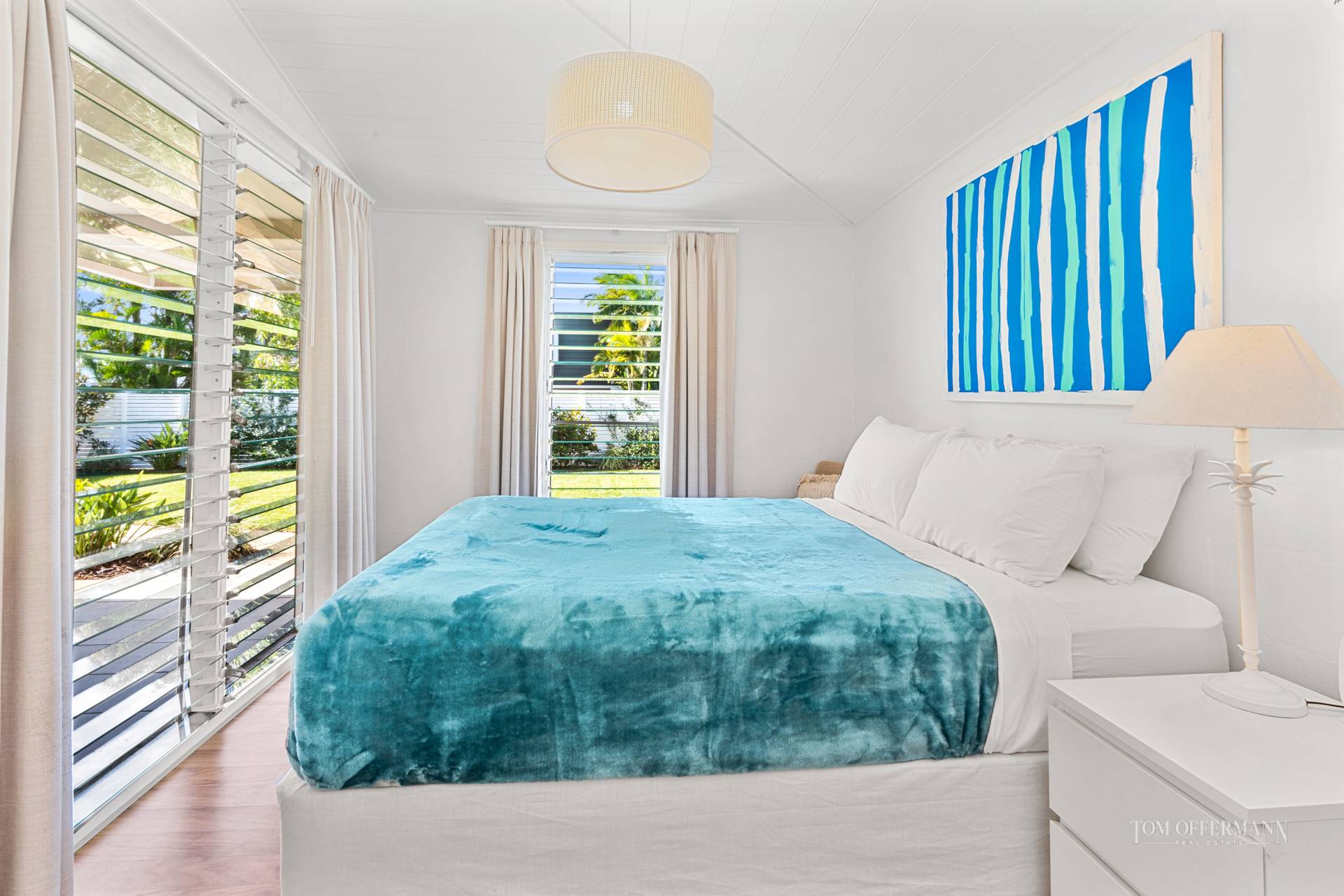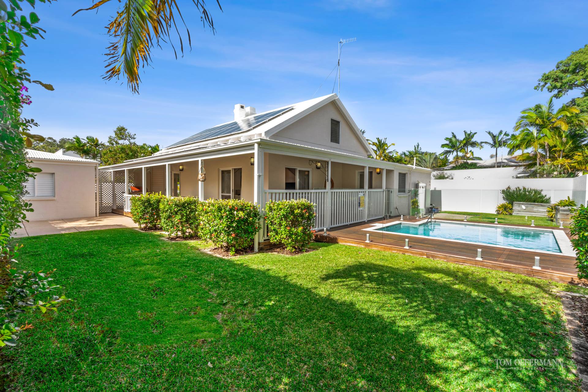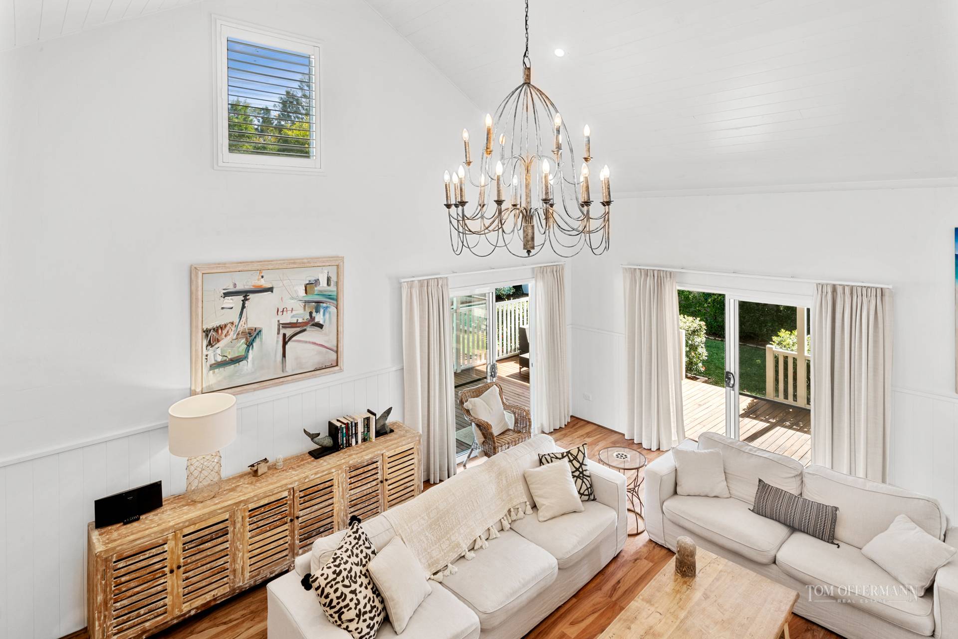 The glistening white exterior and turquoise front door are accentuated by the sun's bright rays; the front lawn is fringed with strelitzias and sub-tropical natives; and wonderfully wide verandahs, the obvious domain for year-round alfresco living and casual dining, not only wrap the north and western sides but they also overlook the dazzling pool, sun terrace and garden.