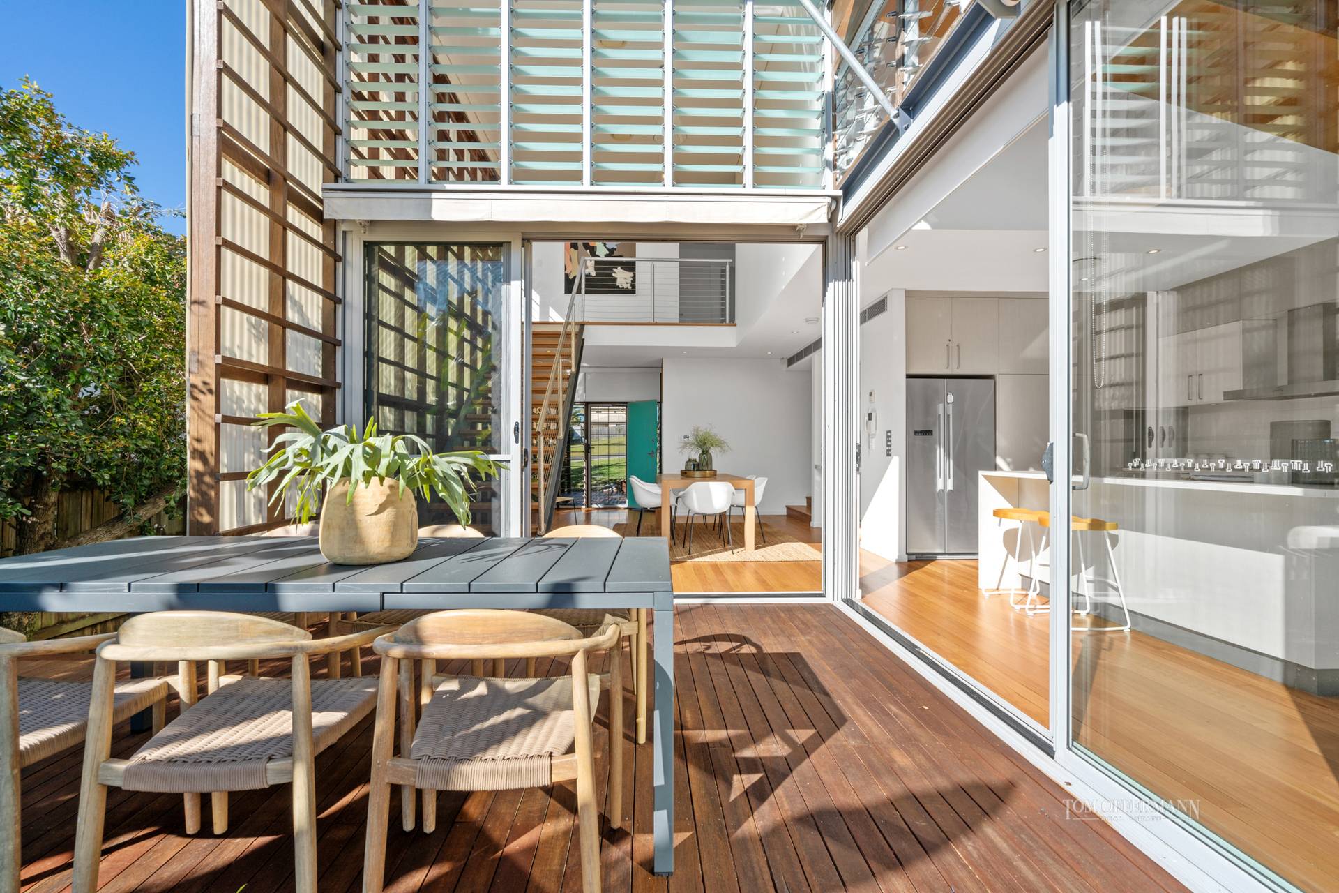 From the street, the façade is undeniably understated, perhaps a nod to the vogue industrial look. Open the turquoise-hued front door and prepare to be even more impressed, by the extraordinary double-height, timber-lined ceiling of the over-generous open plan living/dining space, with beautiful brushbox flooring. Add glass louvres, panes and an opaque corrugated wall which fends off UV rays, and many might think famed architect, the late Gabriel Poole, had a say in the contemporary design.