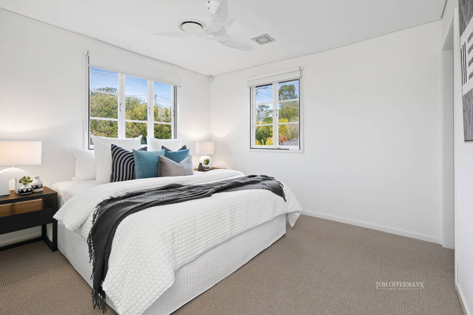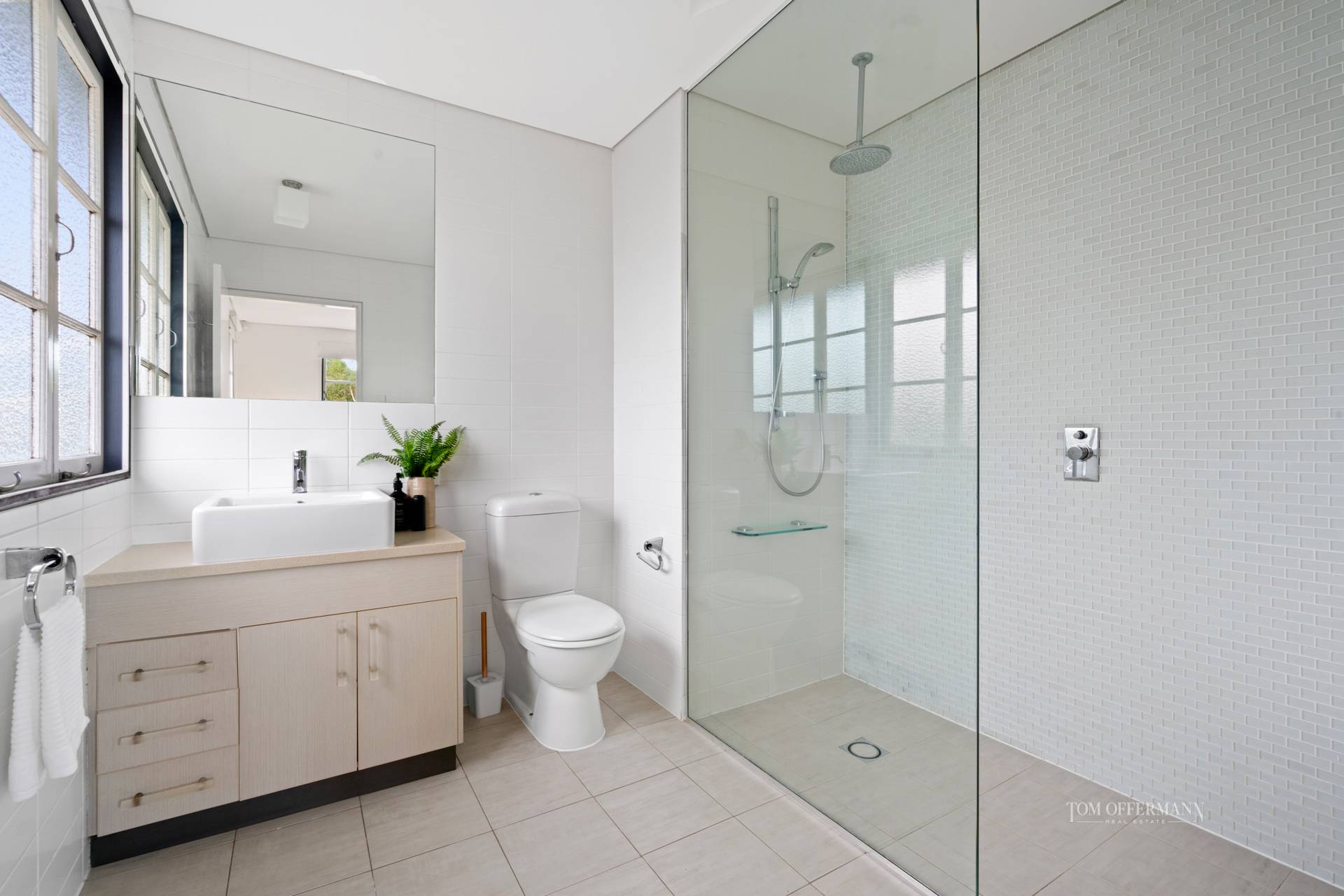 Glass pendants make a statement in the void. The four bedrooms have green outlooks, are drenched with natural light, and have built-in robes. The master bedroom has an ensuite, while the other three share a family-size bathroom.