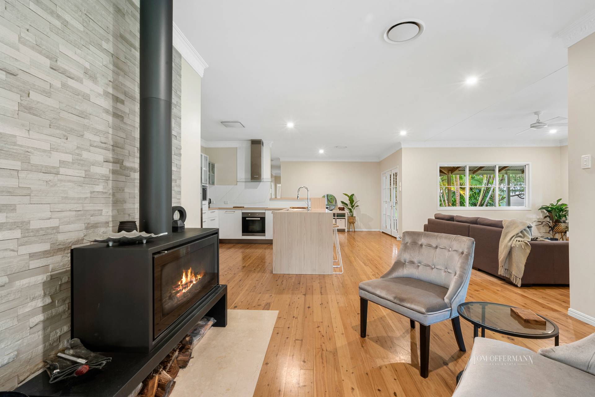 The glow of a generous combustion fireplace warms the interior during the short winters, and dappled sunlight streams onto the verandas all year round, offering plentiful spots for a quiet retreat or comfortable entertaining.
