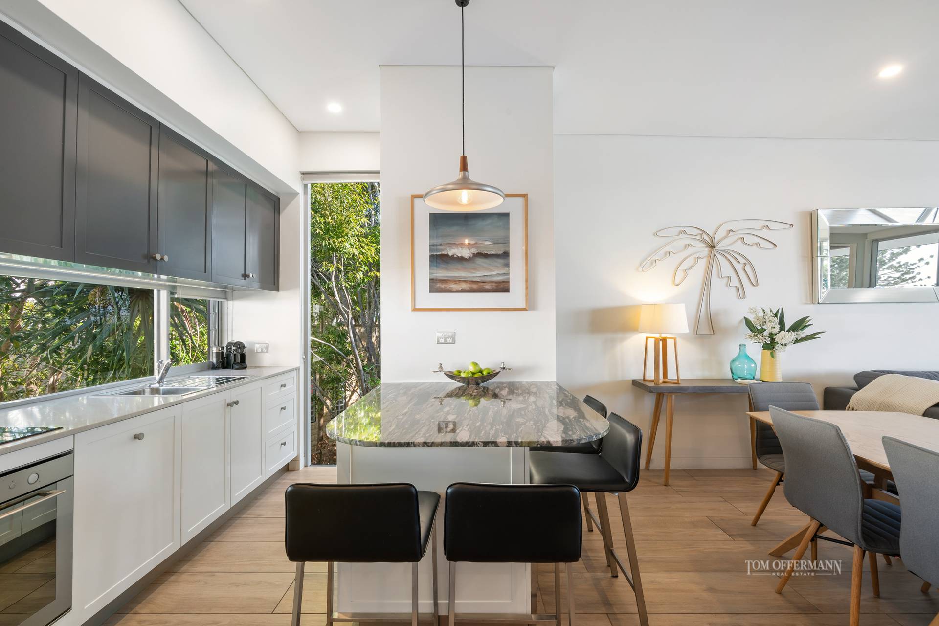 The kitchen is commensurate, with its white 2-pac Hampton's-style cabinetry, grey stone-topped benches and breakfast bar, floor-to-ceiling window looking out to greenery and every accoutrement needed to create dishes from breakfast to dinner time.