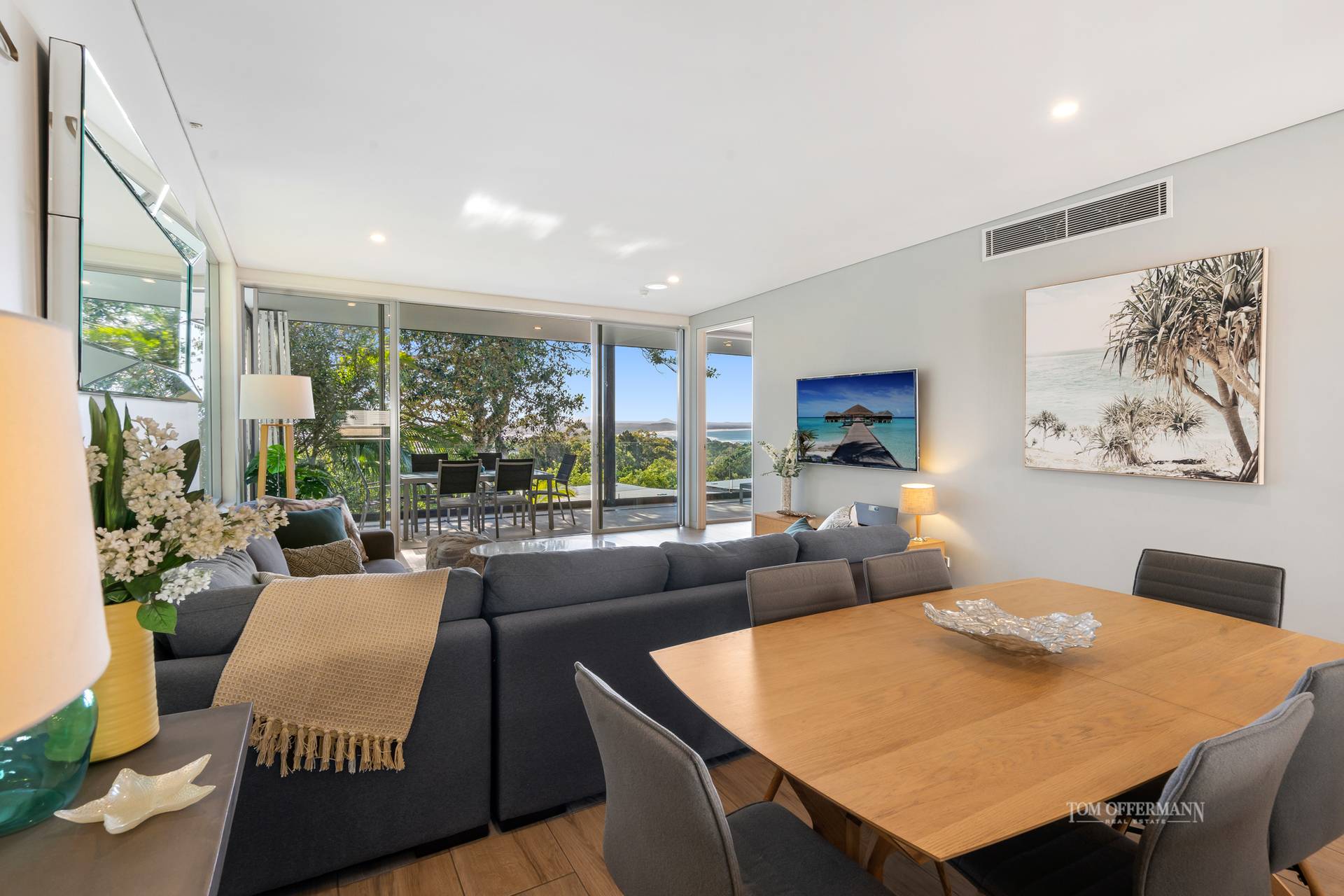It's all about the views wherever you go. They're a backdrop to the waterfalls cascading through the centre of the resort and when you open the front door eyes are immediately drawn to the high-ceilinged open plan living and dining area's seamless connection via glass sliders, to the wide covered terrace, with slide-away plantation shutters on either side.
