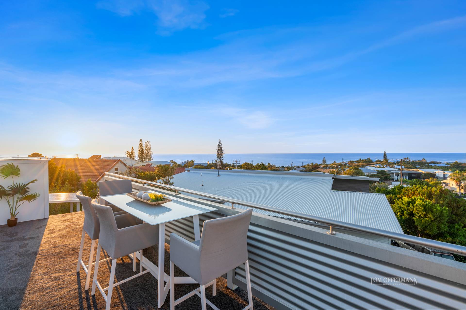 Upstairs polished hardwood features on the treads and it flows through the generous open-plan living/dining space and adjoining dedicated office space with built-in desk. Wide sunset views of the Noosa Hinterland are on offer while on the East-side doors open seamlessly to an expansive covered deck which stretches almost the length of the house. With its integrated premium barbeque facilities, fridge, salt-tinged air and superb ocean views, alfresco entertaining is next level.