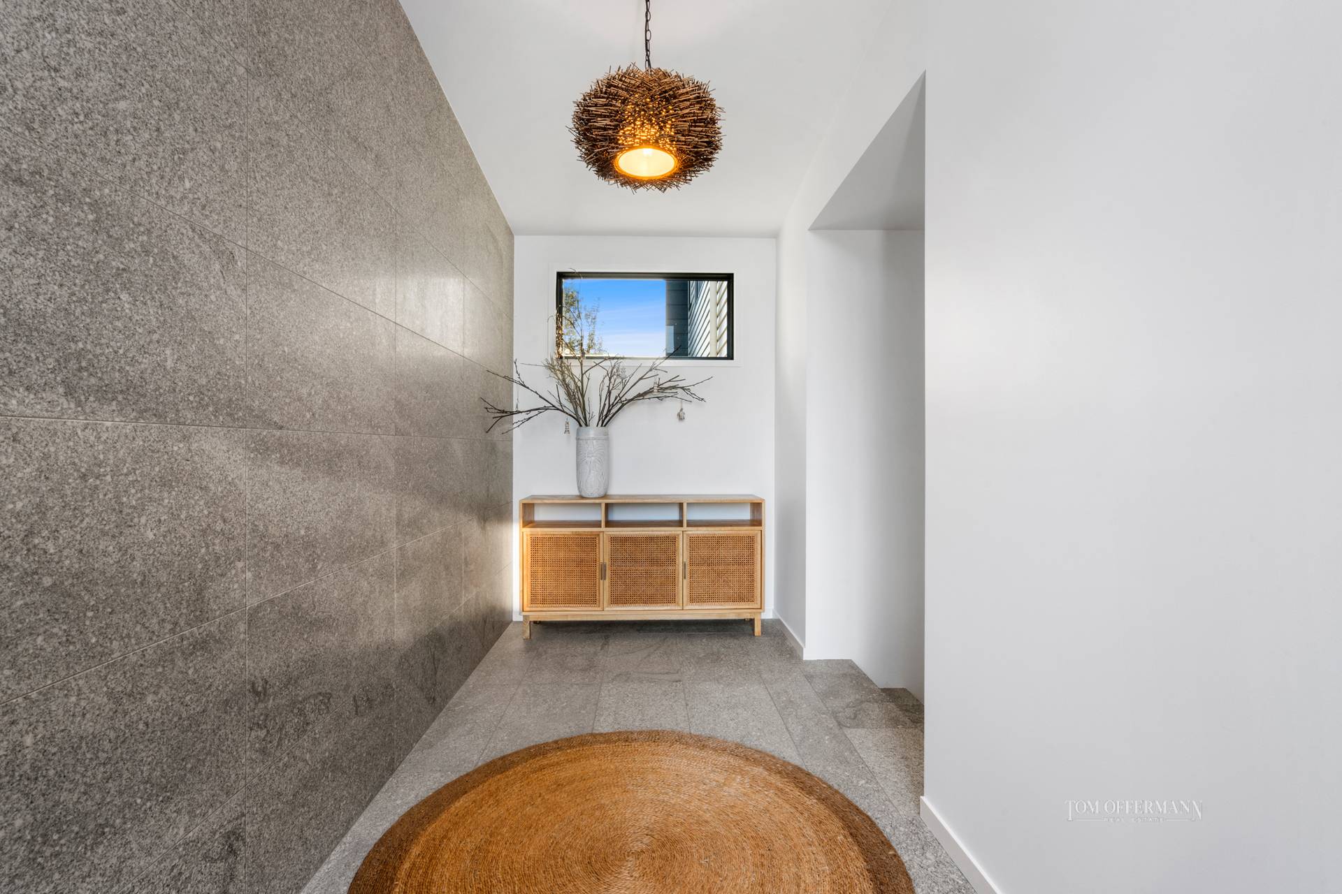 Artwork and a standout pendant in the entrance foyer set the mood as does the on-trend grey, white, and timber coastal palette. These factors continue throughout so no matter the lighting or season, each high-ceilinged space feels special.