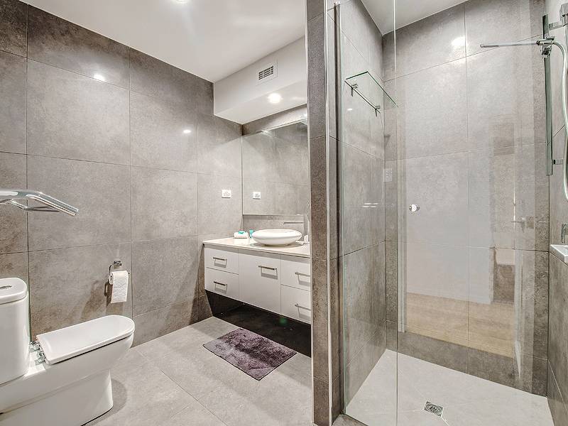 Two bedrooms, one a queen size with WC and the other with twin beds, and both with built-in robes are in latte and white tones, similar to the