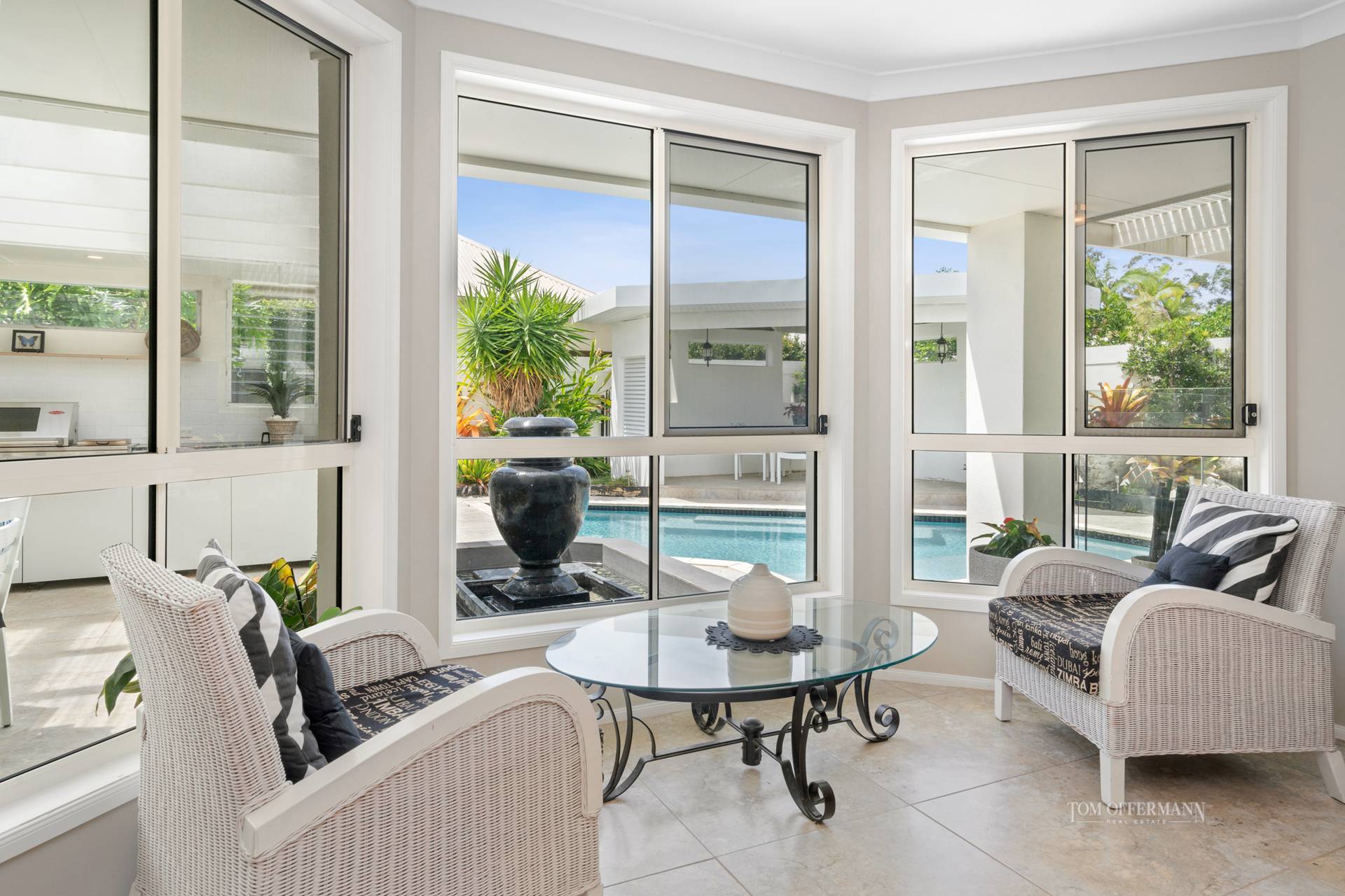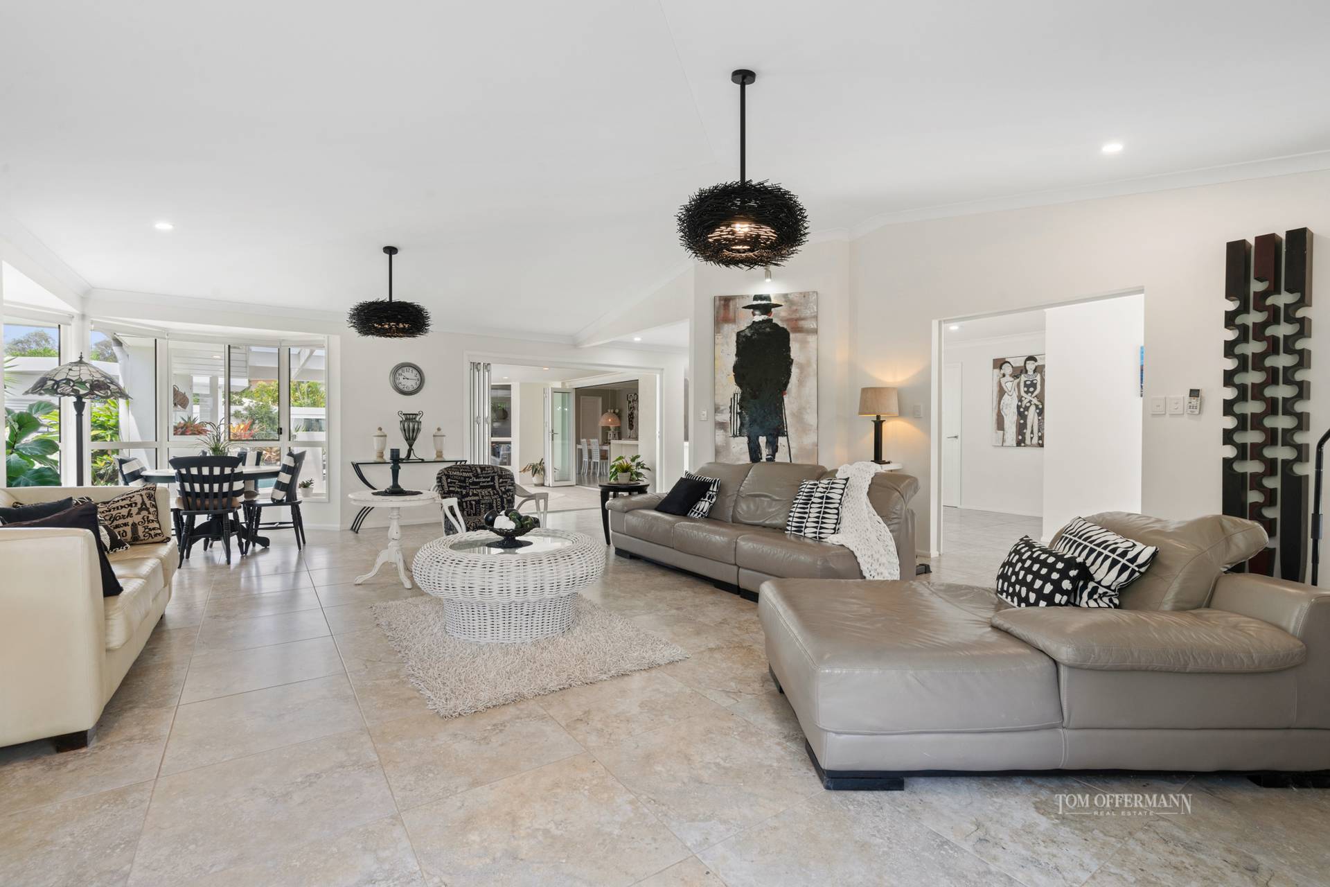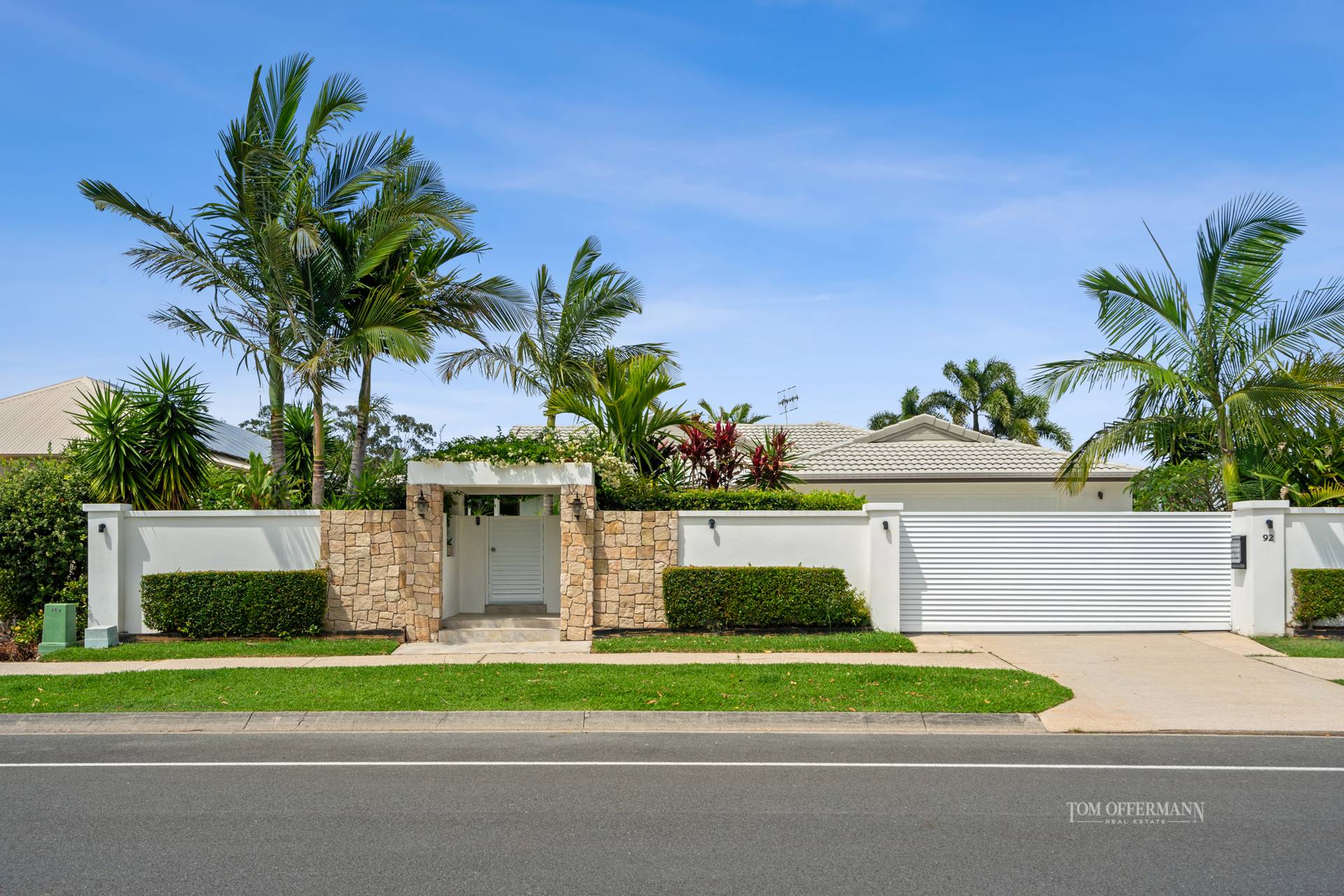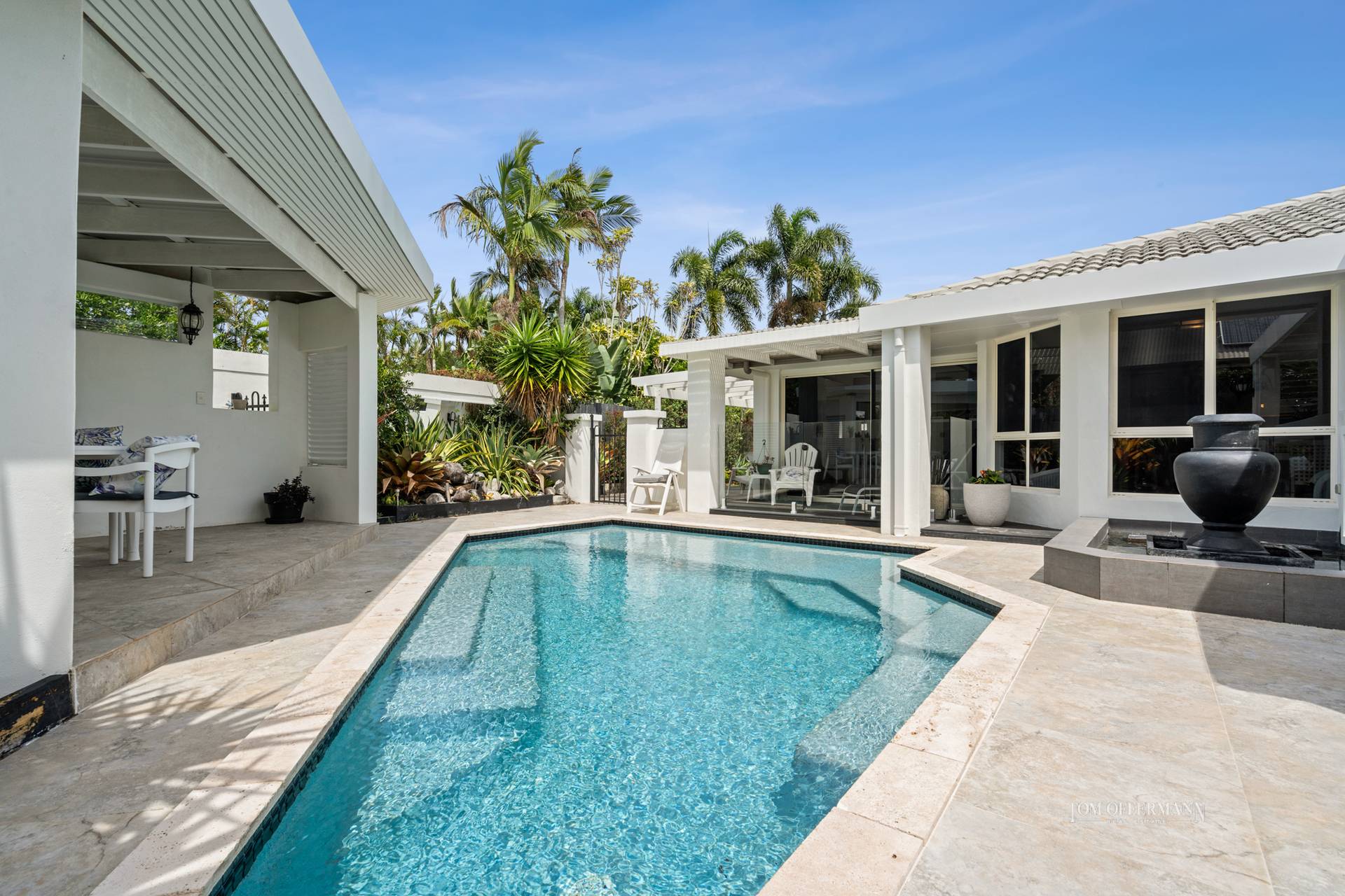 Hidden behind a striking sandstone feature wall, fresh white entry gates and blossoming boganvillas, this single level residence meets every level of expectation, and sits right in the heart of the highly prized Noosa Waters Estate.