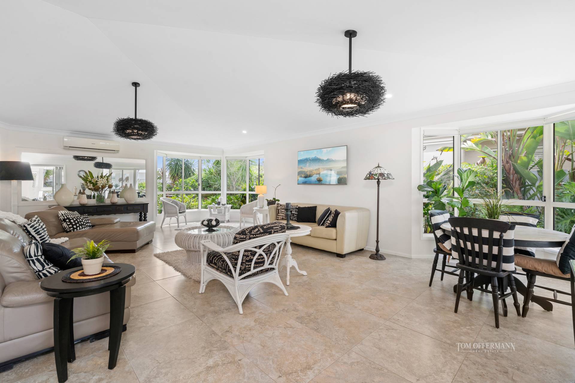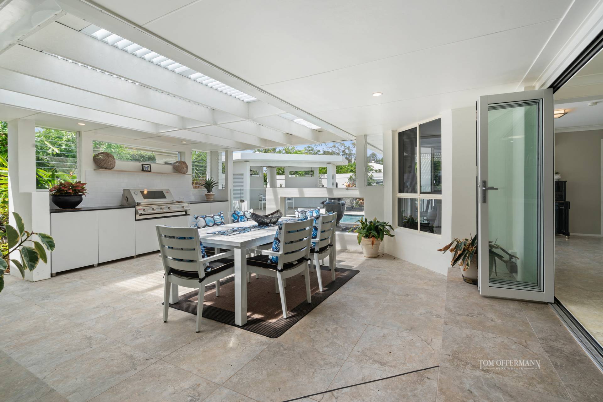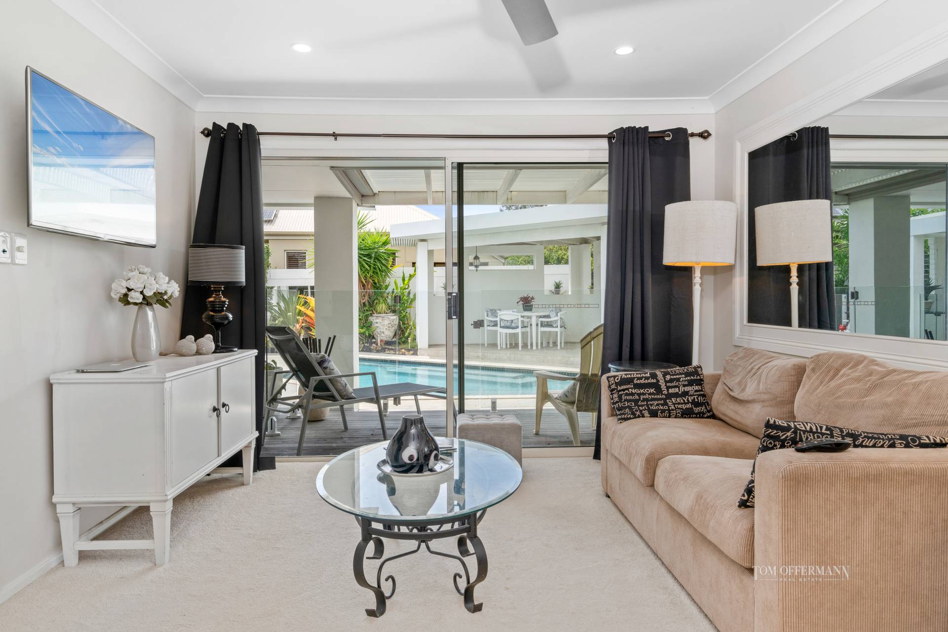 Hidden behind a striking sandstone feature wall, fresh white entry gates and blossoming boganvillas, this single level residence meets every level of expectation, and sits right in the heart of the highly prized Noosa Waters Estate.
