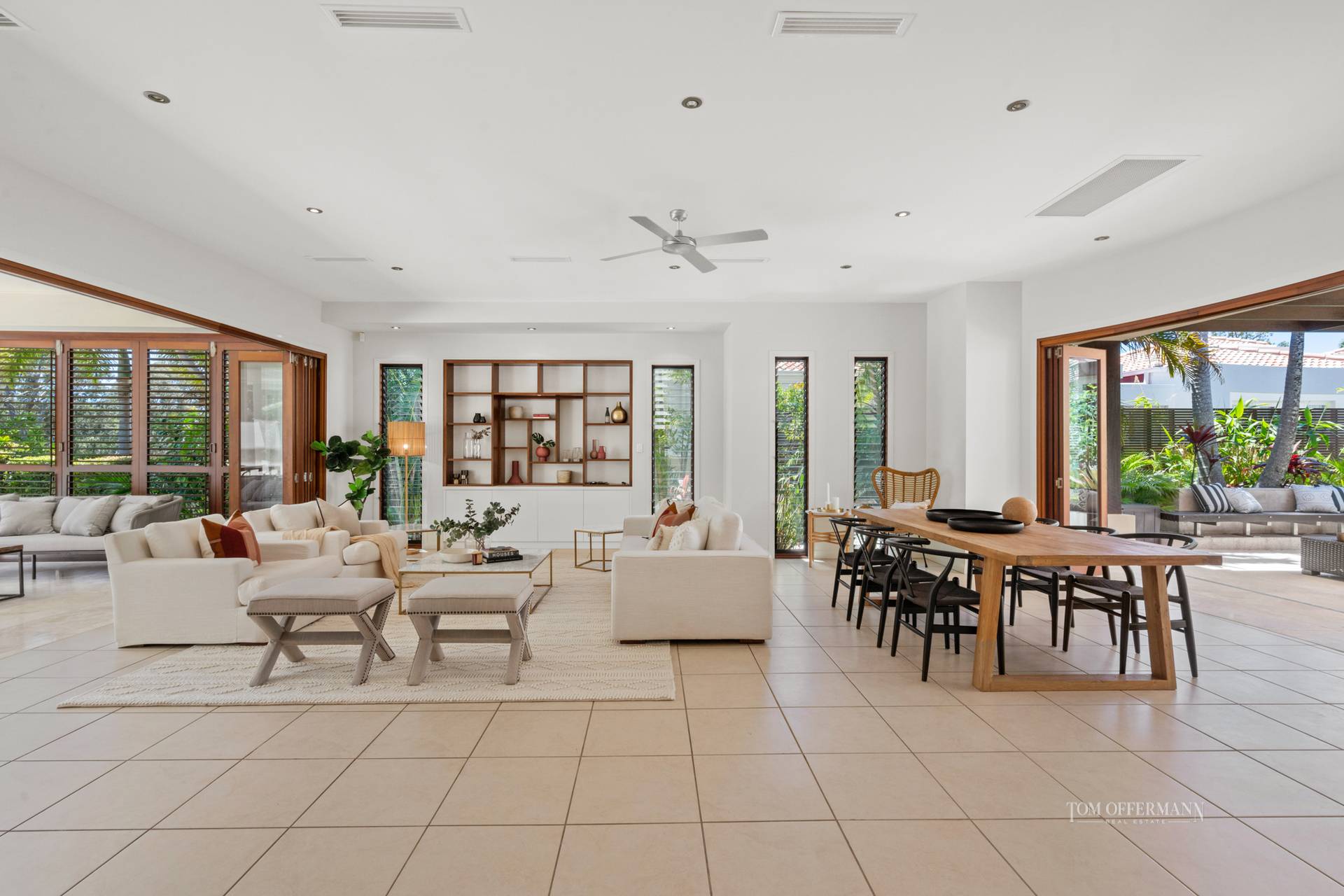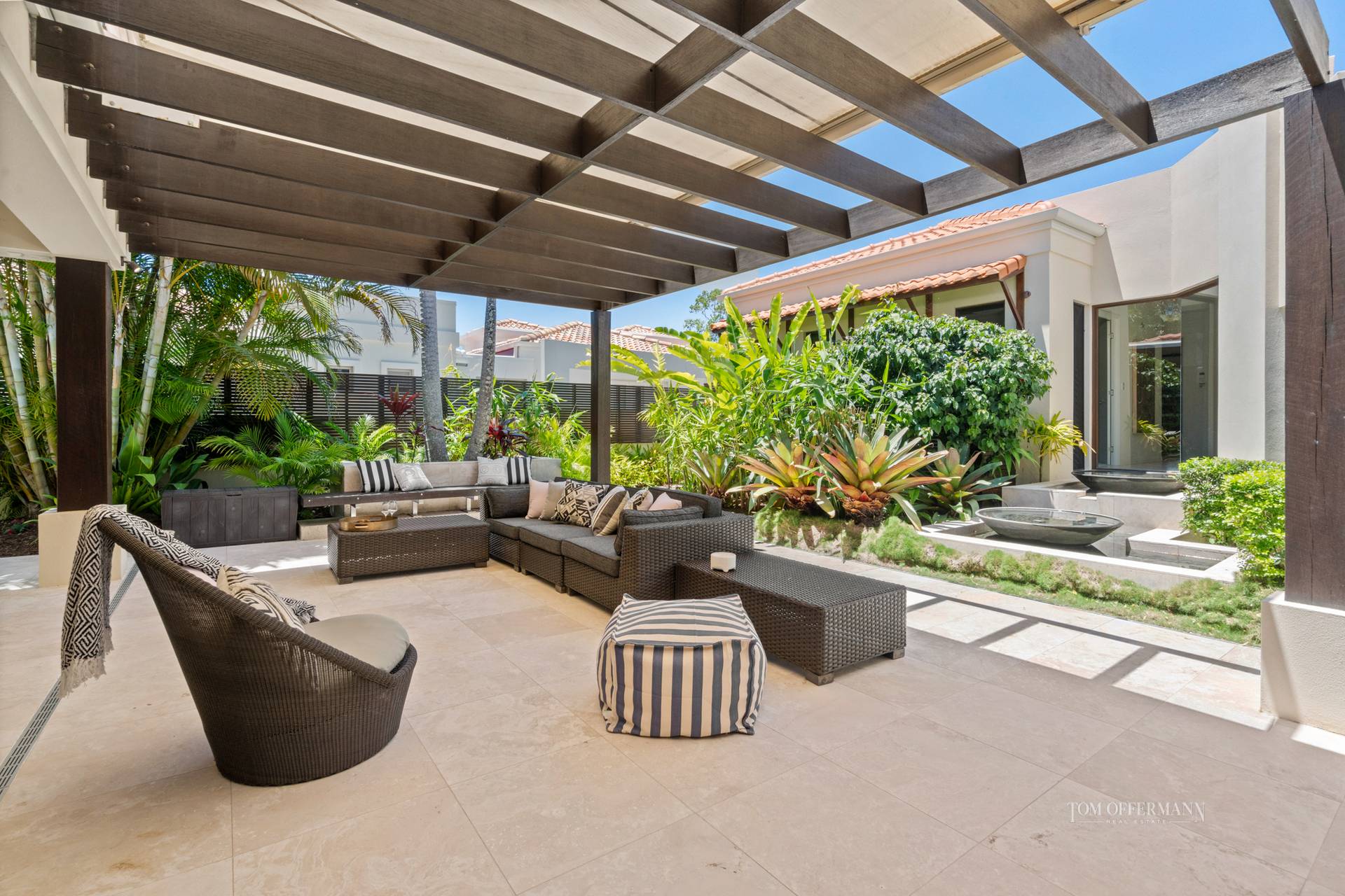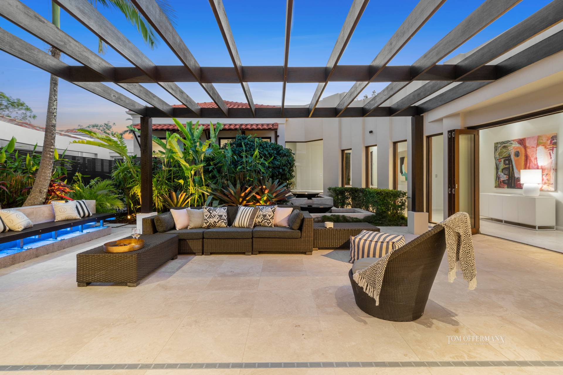 On one side, a wall of floor-to-ceiling fold-away glass doors open to a vast Mediterranean-inspired courtyard with pergola, edged with lush gardens, giant bromeliads, and timber seating, while a double water feature adds tranquil Zen character.