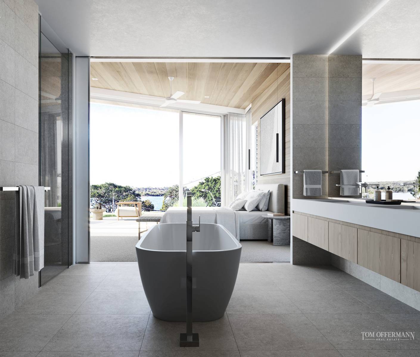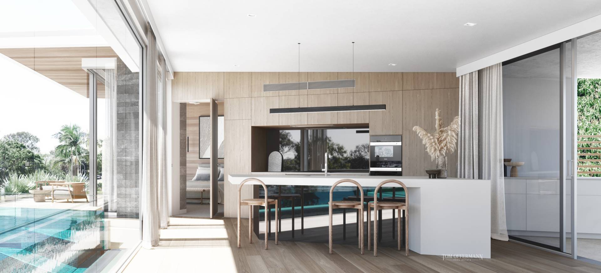 "The design from north to south as well as the ability to completely open-up the centre section, gives exemplary natural cross ventilation. The northerly orientation and tall ceilings allow drenching of natural light, whilst large eaves especially over the wrap-around terraces, provide protection during the hotter months."