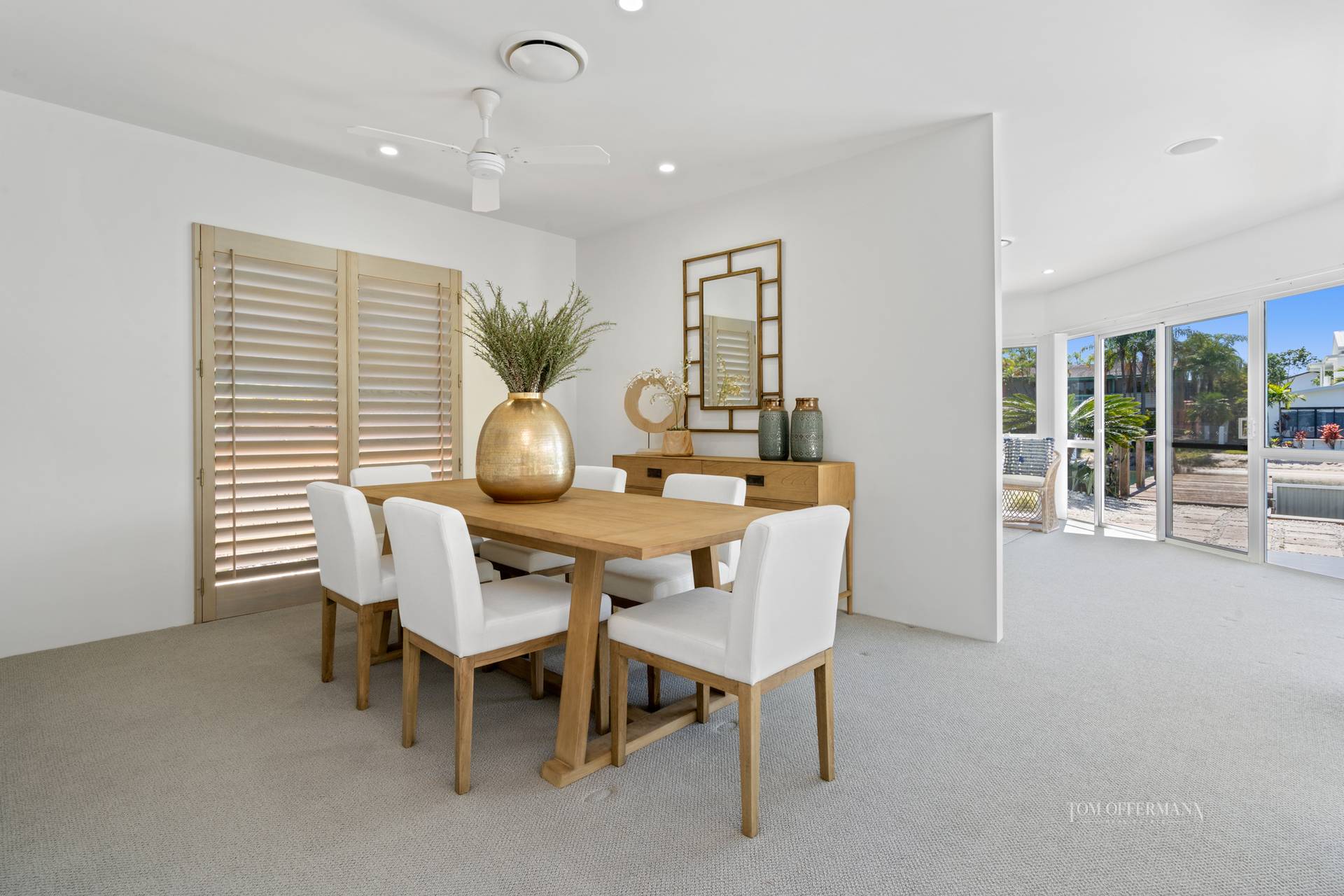 On the northward side opening to the pool terrace is the dining room with plantation shutters, as does the lounge room, which has the added advantage of waterway, beach, and jetty views.