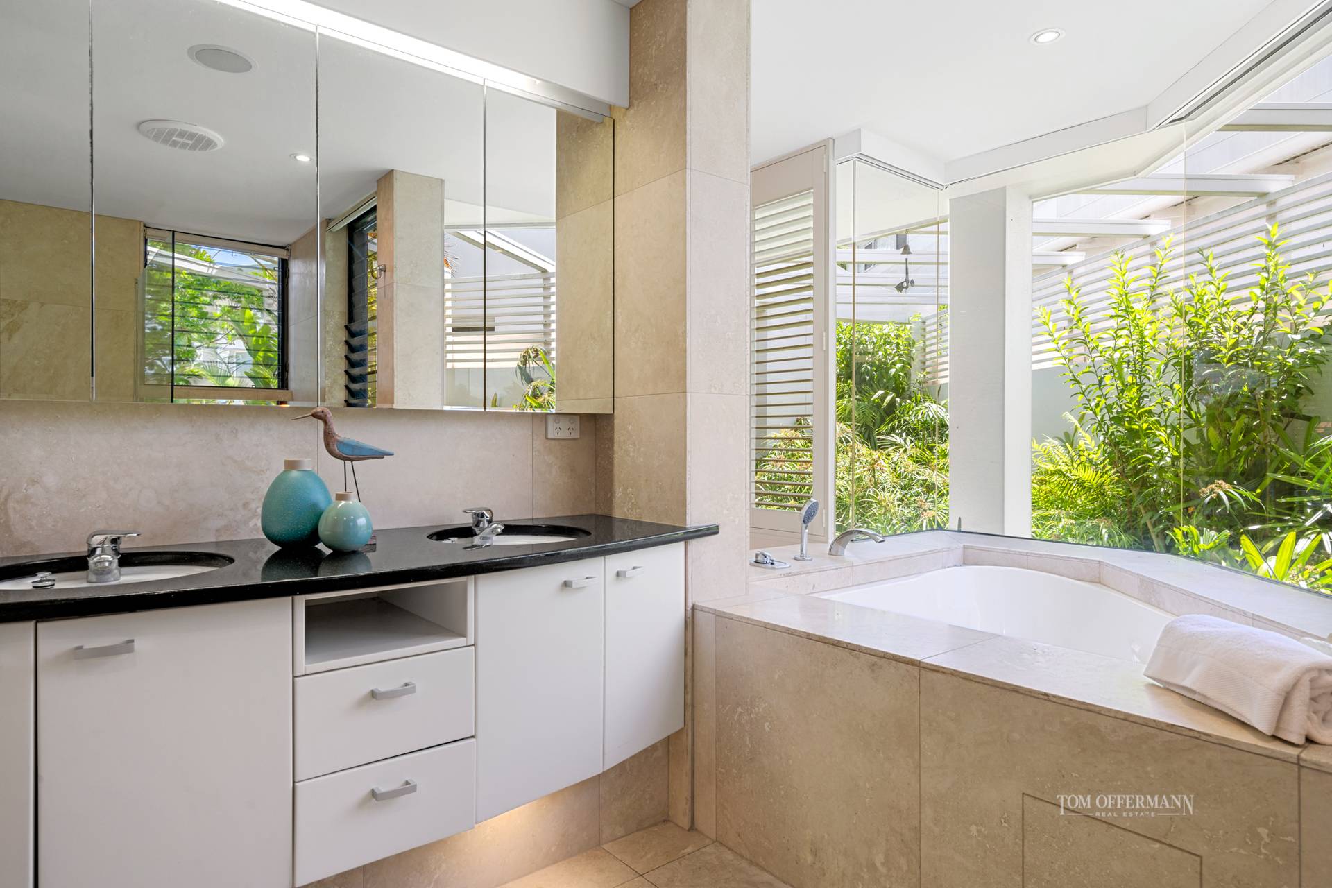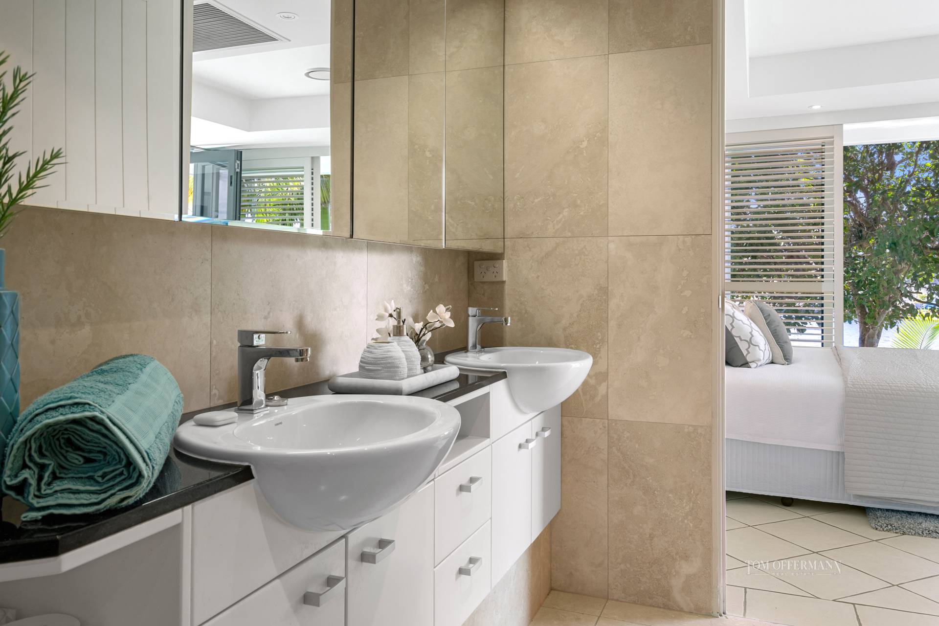 Seemingly floating over the pool and looking out to the wide waterways is a super-size master bedroom with marble-tiled ensuite, black granite-topped double vanity and a walk-in robe. Along the hallway on the south side is a queen-size bedroom with built-in robes plus a bathroom.
