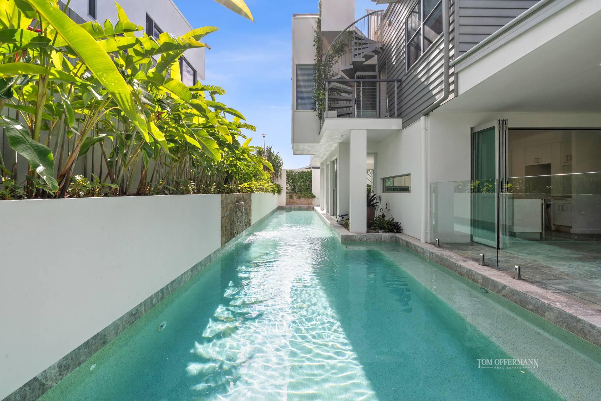 - About: cul-de-sac location; brushbox timber floors; 4 x floor-to-ceiling windows; granite tiled terrace around pool + off living area; aircon/fans; upstairs lounge w 2m x 8.3m terrace; master bed w louvres, WIR, travertine ensuite w spa bath; laundry w storage & chute; dedicated storage under stairs; dble garage w internal access & racks for surfboards + kayaks