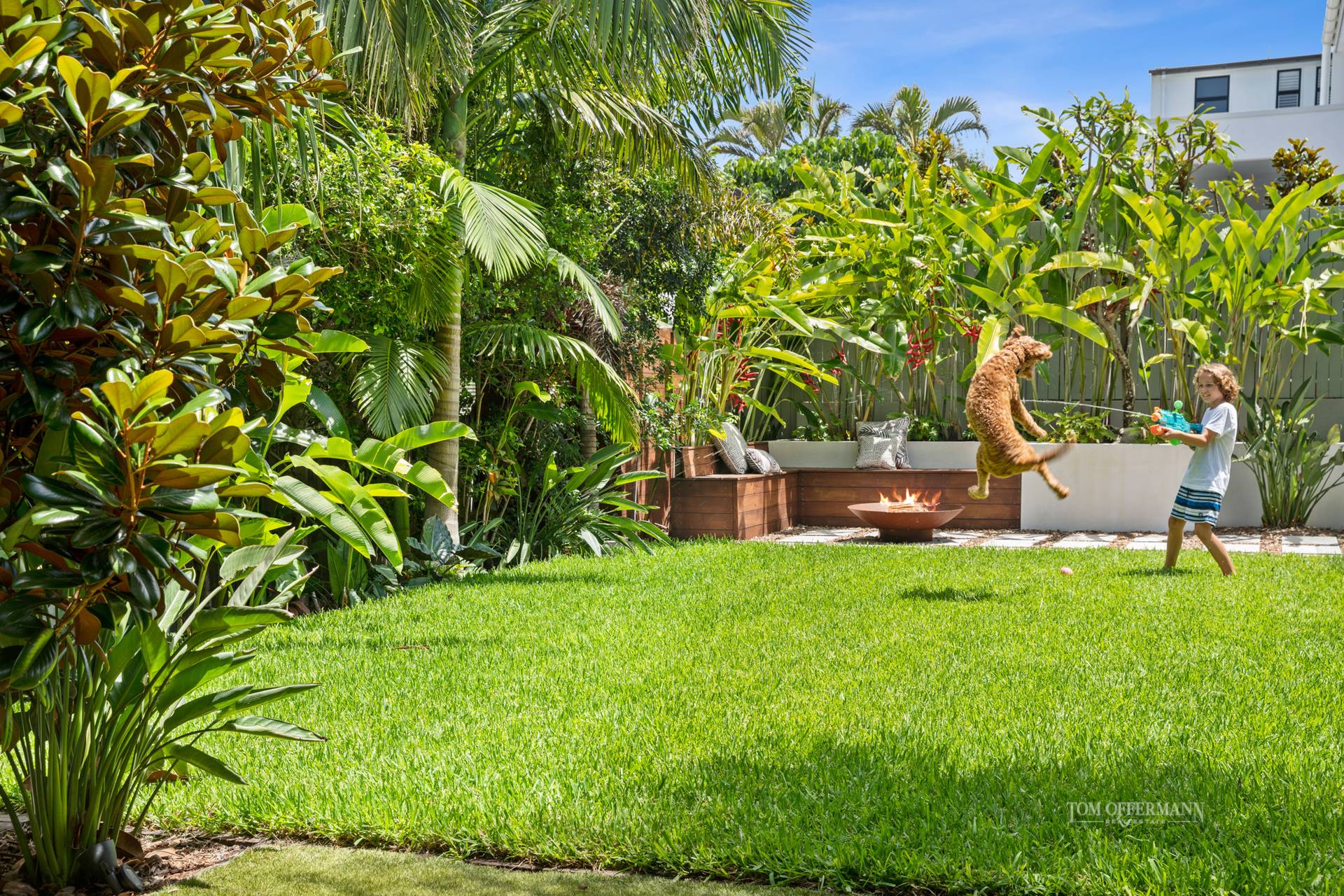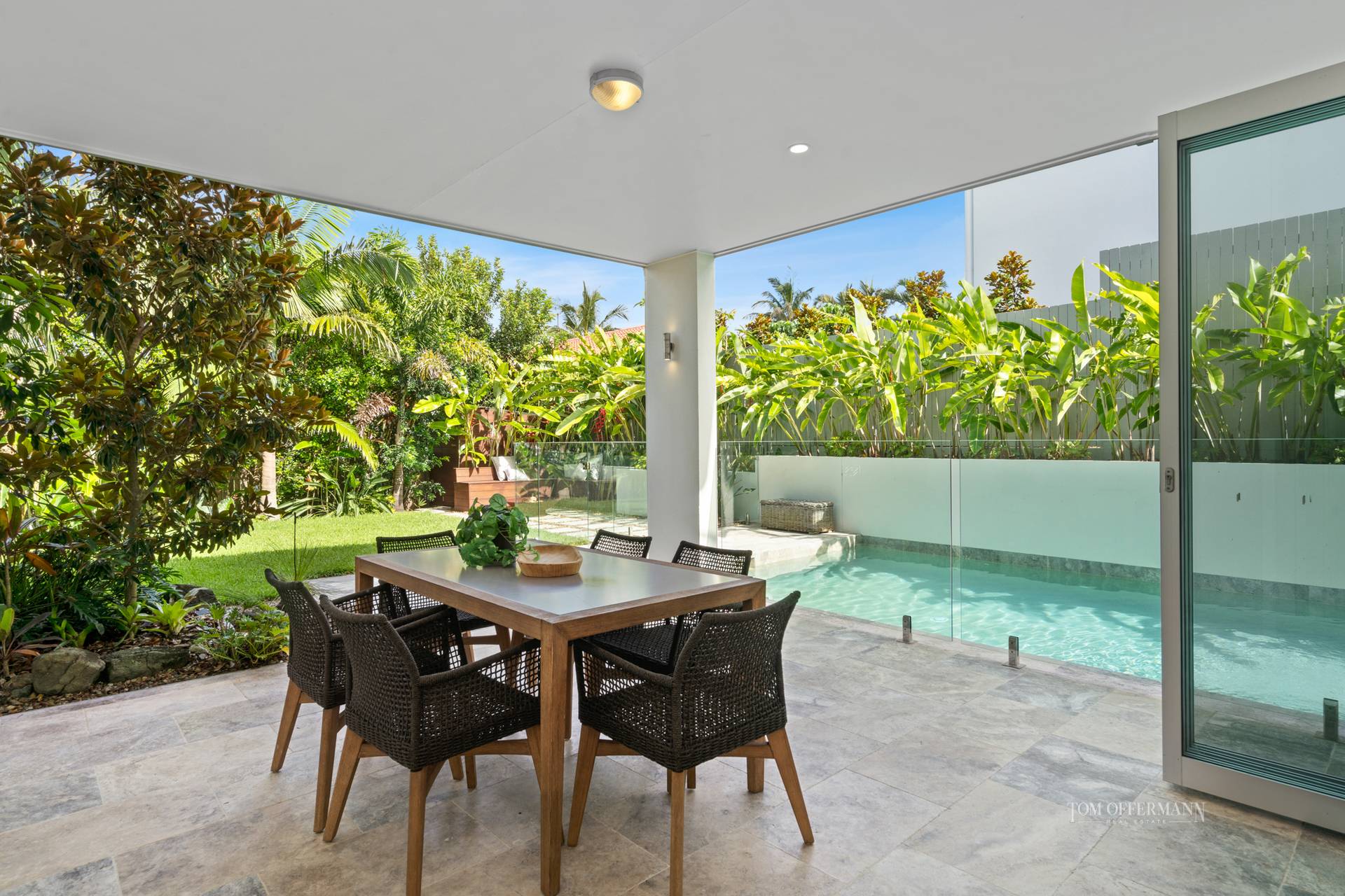 On the north-side, the pool's back drop is a high wall with a water feature, and 'topped' with heliconia, bromeliads and tropical magnolias. The pool terrace suggests sun-worshipping and a significant lush rear garden tells more surprises. A flat manicured lawn for pets, kids and cricket, has frangipani, pandanus, olive tree, fan palm, tropical magnolias and grass tree plus a rainwater tank and a serious shed.