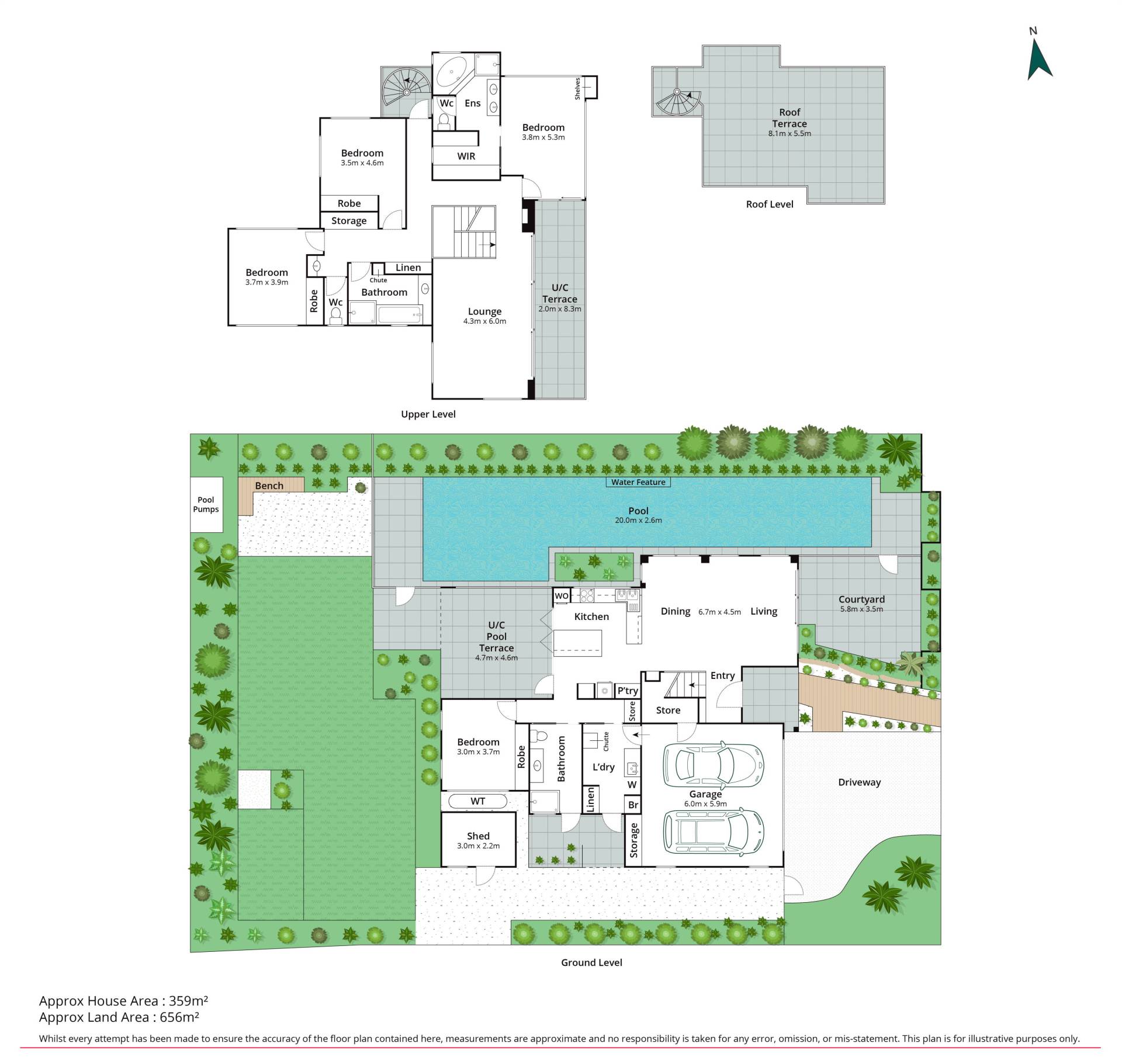 - Pool: 20m x 2x6m w swim-out; water feature + heating points