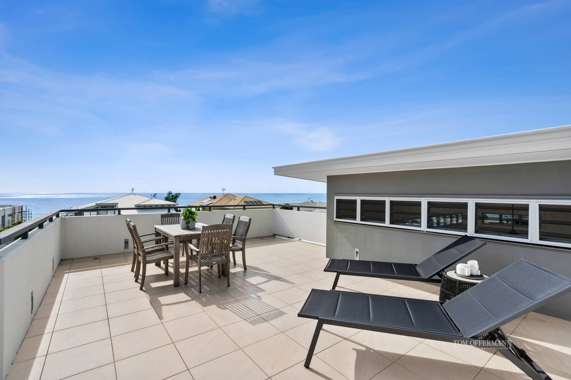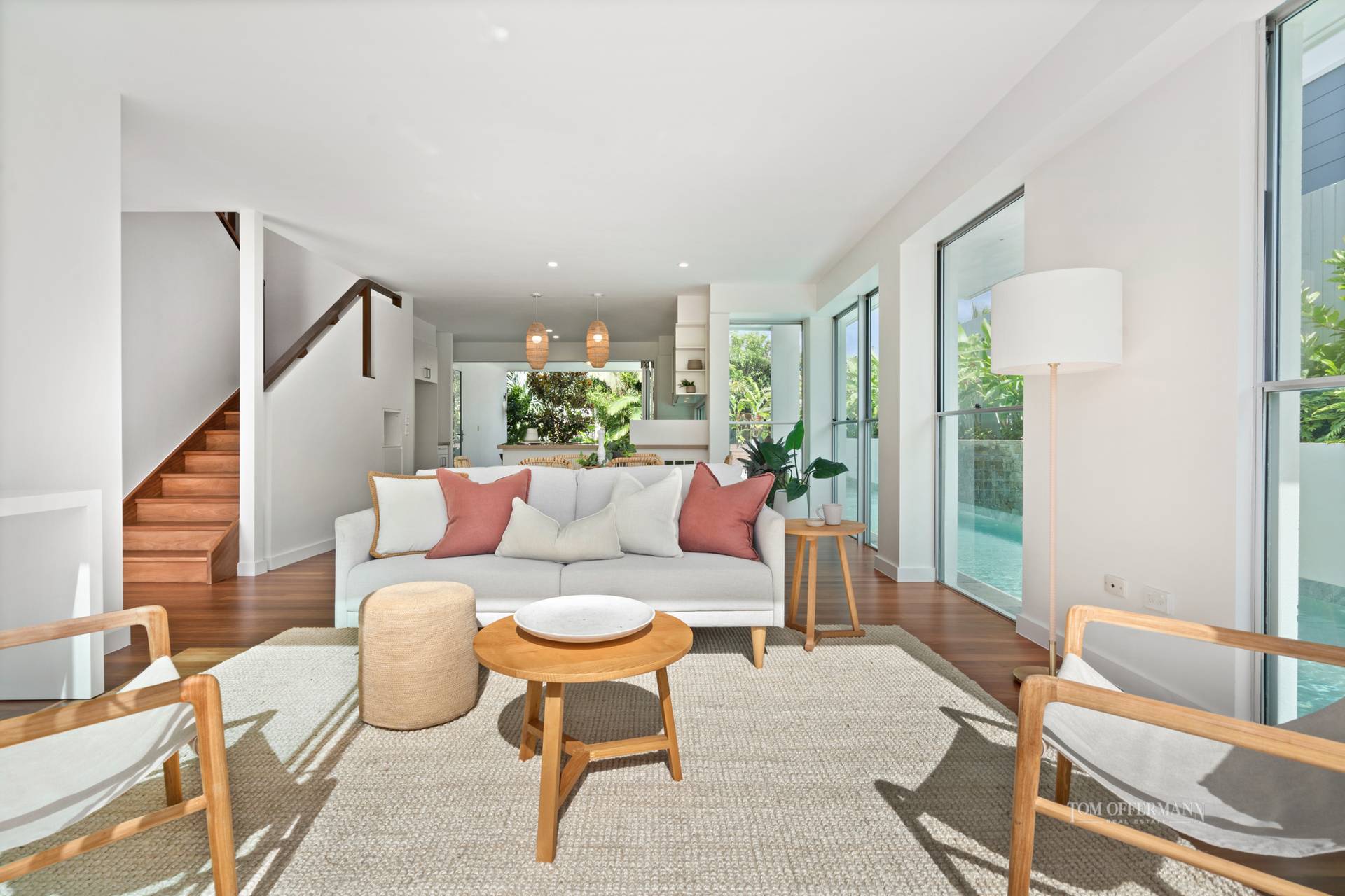The contemporary beachy aesthetic begins at the timber-framed glass statement front door into the lobby, followed by the reveal of over-generous living and dining spaces offering obvious functionality and versatility.
