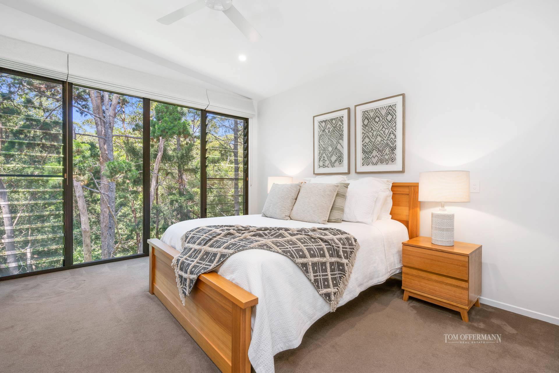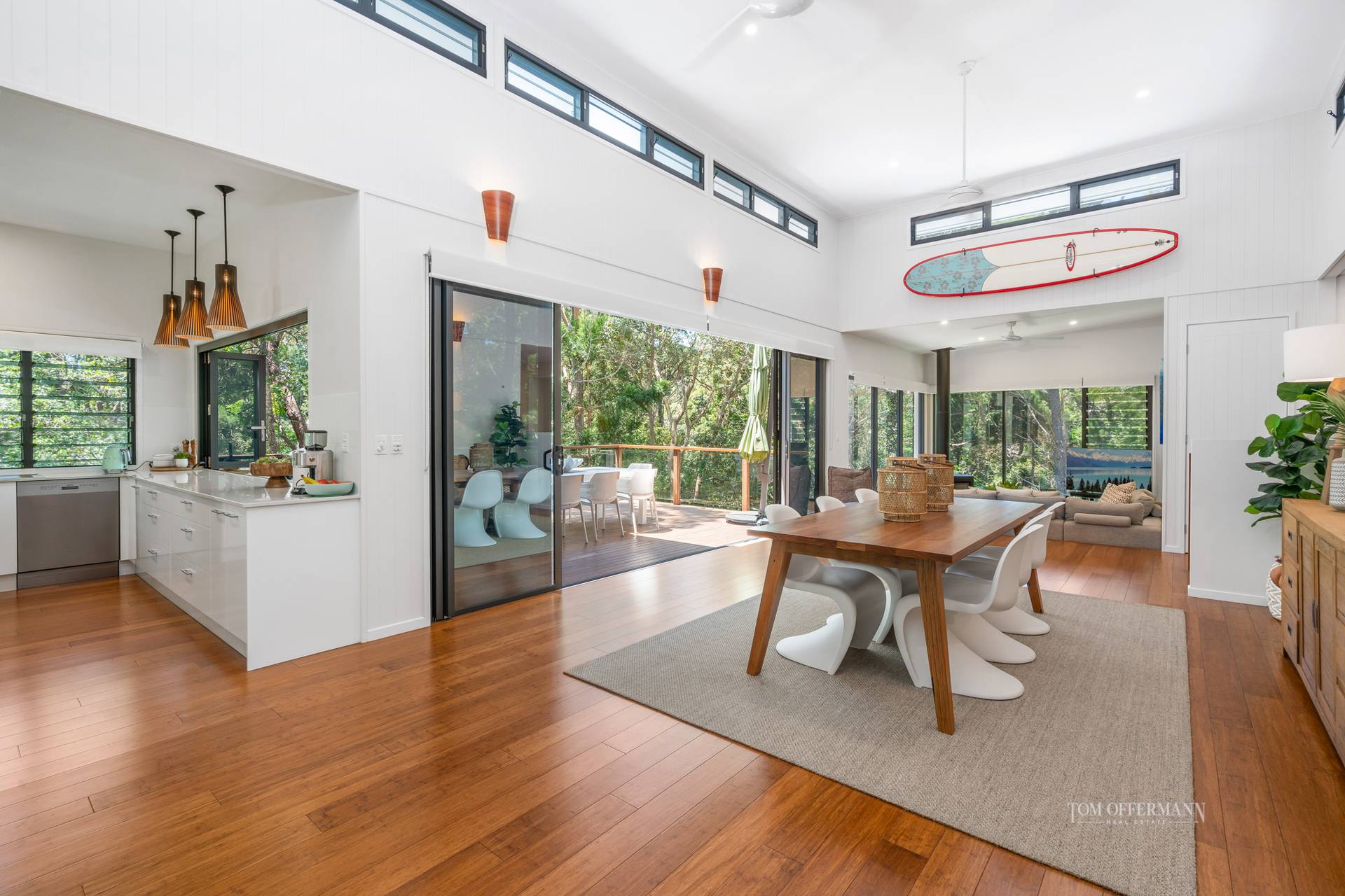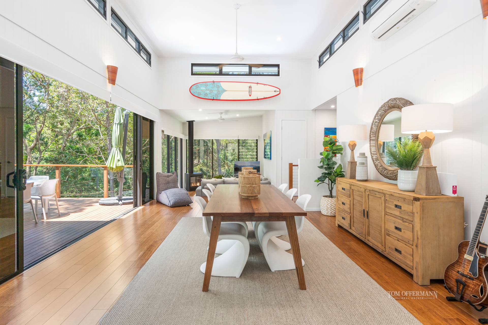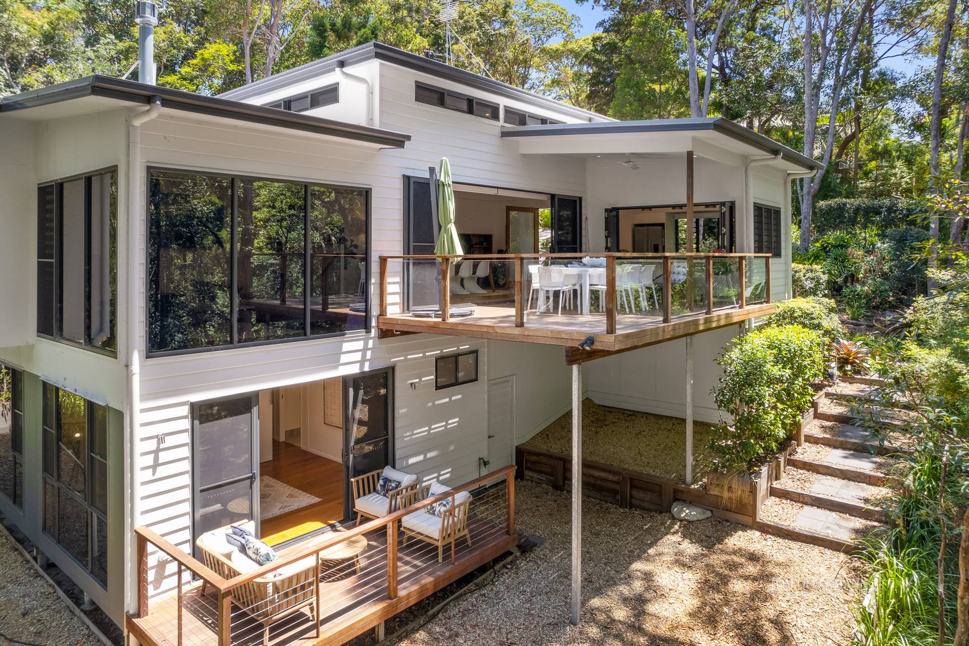 - About: gentle sloping site nestled into Noosa National Park; 4.2m ceiling height/raked ceilings; VJ-profile wall; bamboo floors/carpeted bedrooms; aircon/fans; gas log fireplace; dble garage with store area