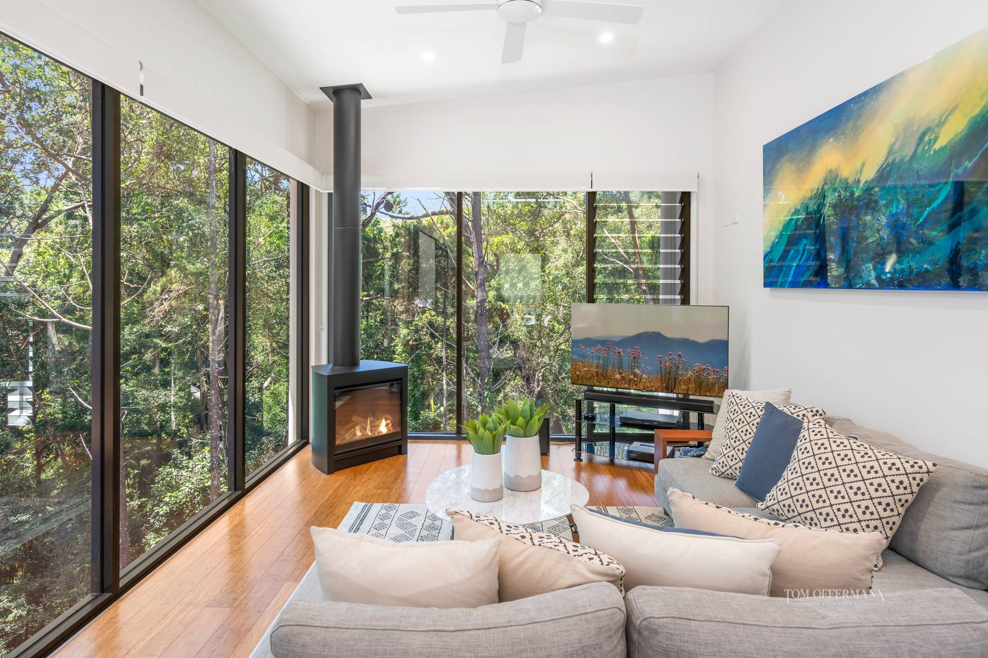 Beyond is a split-level lounge area with raked ceiling, gas 'log' fireplace, and a floor to ceiling picture window, giving the impression of being perched in the rainforest canopy.
