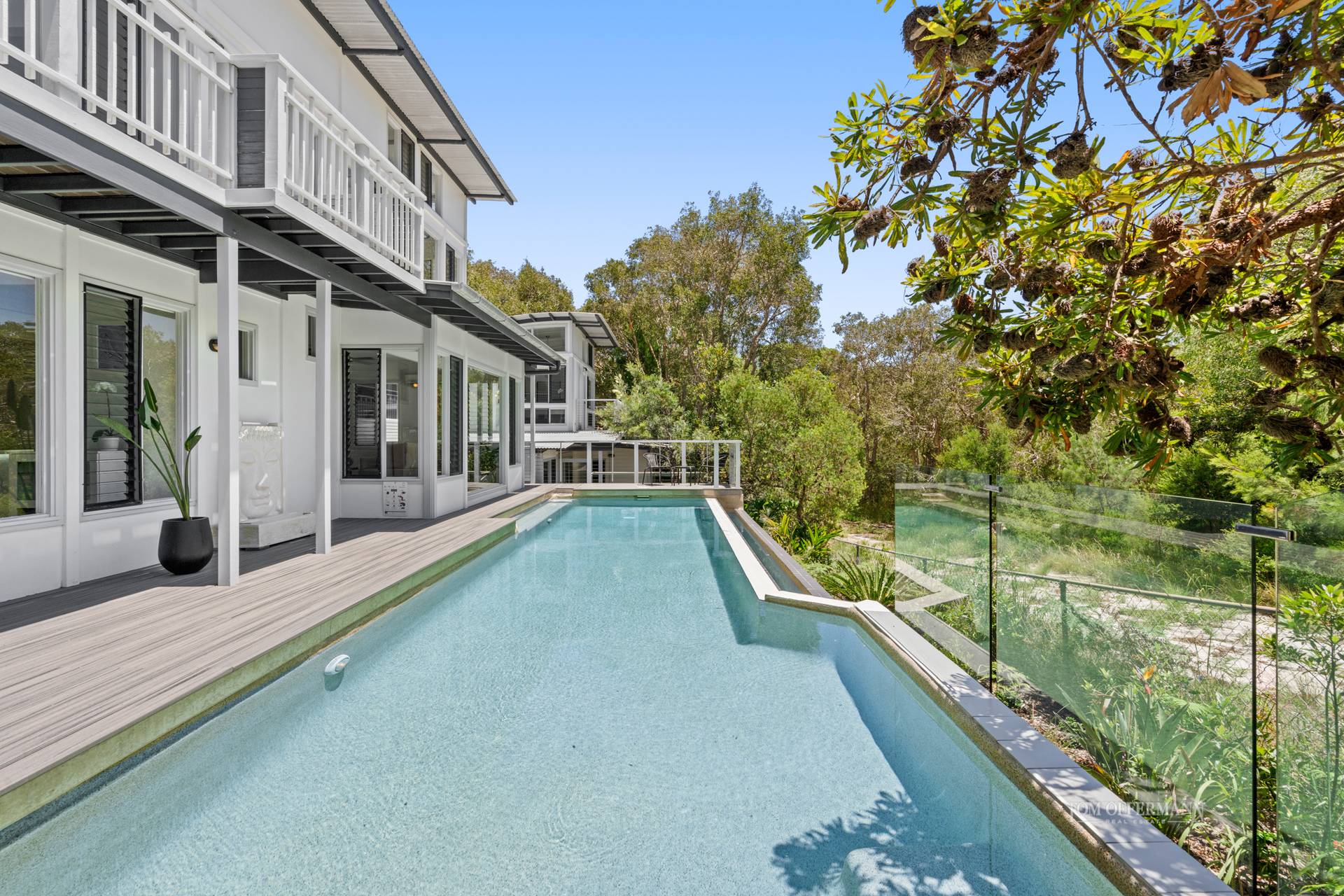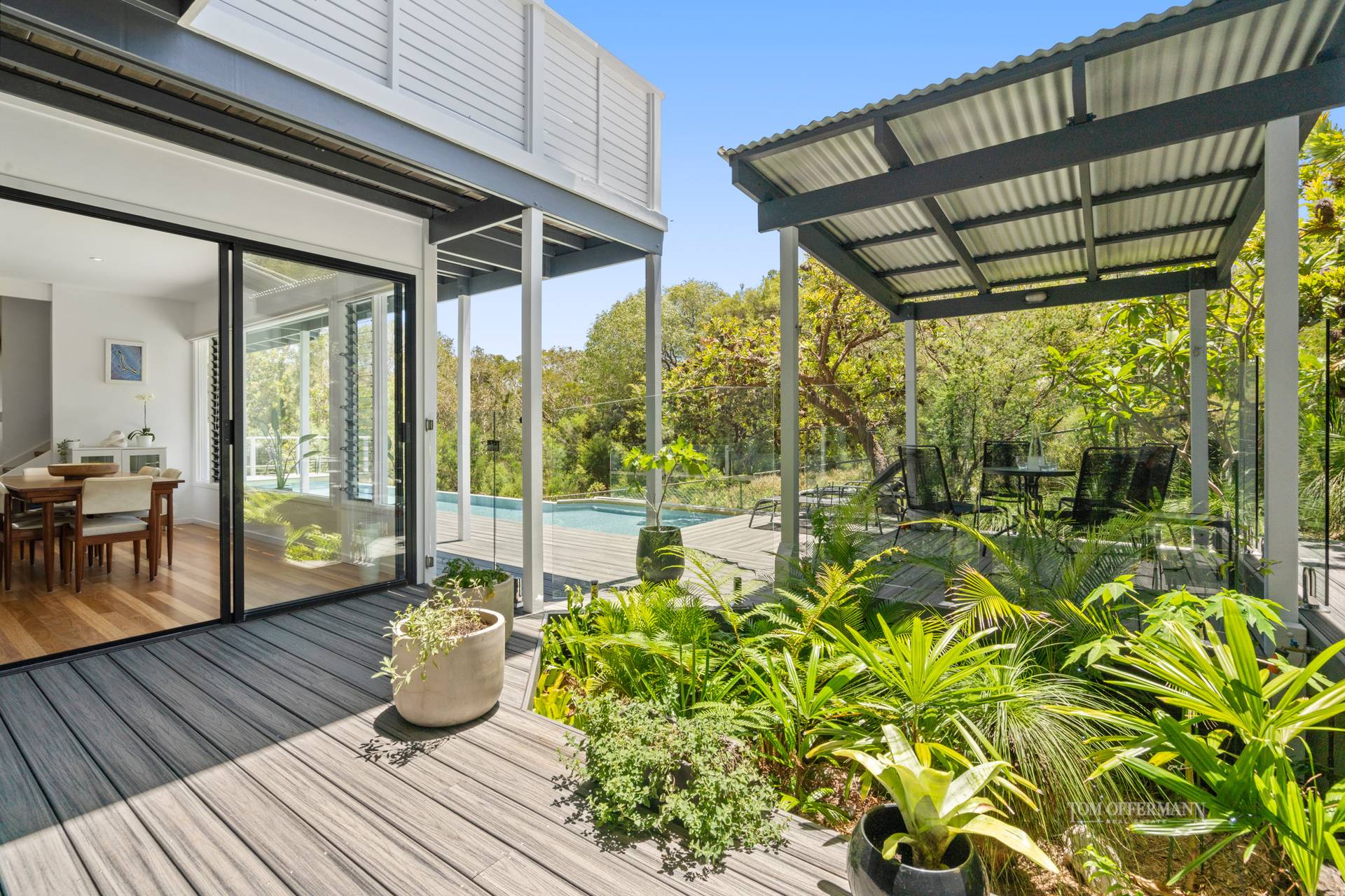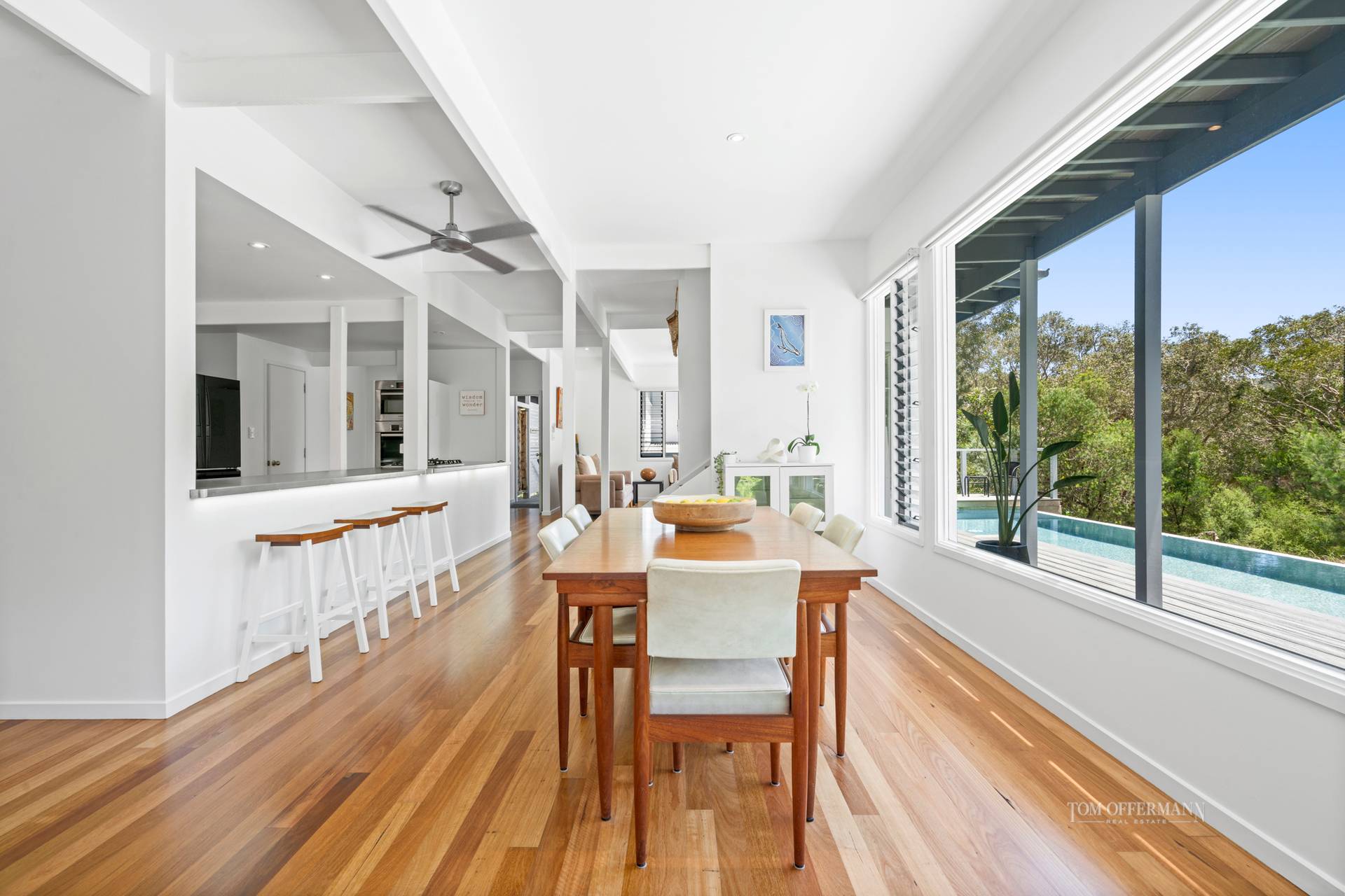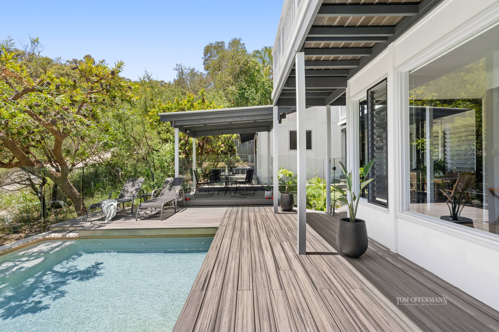 "With a large parcel of land plus a versatile floor plan with possibly three living options," comment Tom Offermann Real Estate agents Roark Walsh and Tiffany Wilson, "clever use of terraces bringing the outside in, plus plenty of room to entertain, this residence is the essence of an extremely laid-back beachy lifestyle, and it's peaceful, private location is perfection, especially when the 'back garden' is the spectacular Noosa National Park.