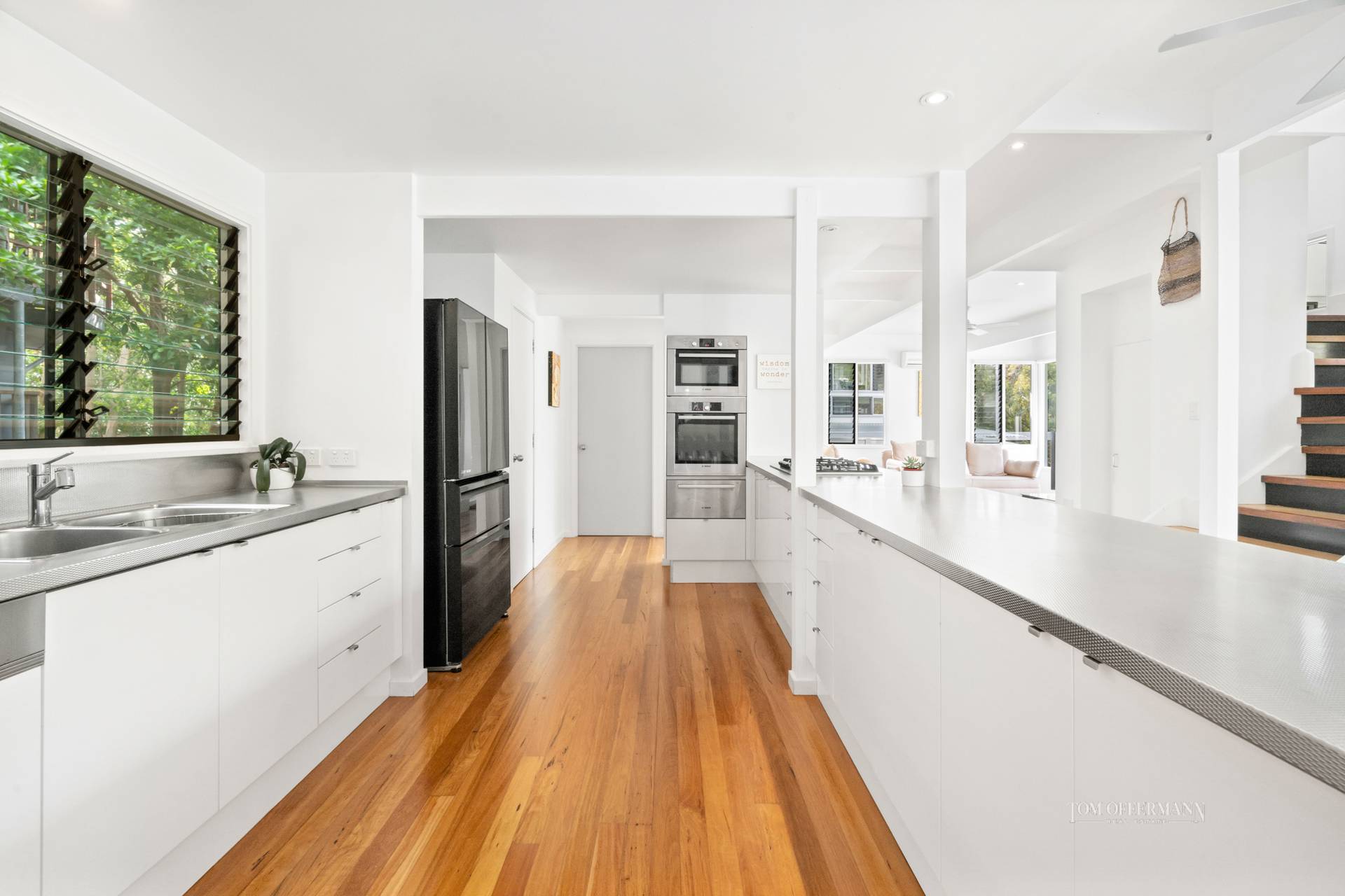 The interior neutral palette harmonises naturally with the exterior. The main living and dining areas open northward to the pool terrace with its backdrop of the National Park. The super-sized galley-style kitchen with stainless steel bench tops, is commensurate with the 'everything and more' theme throughout the residence.