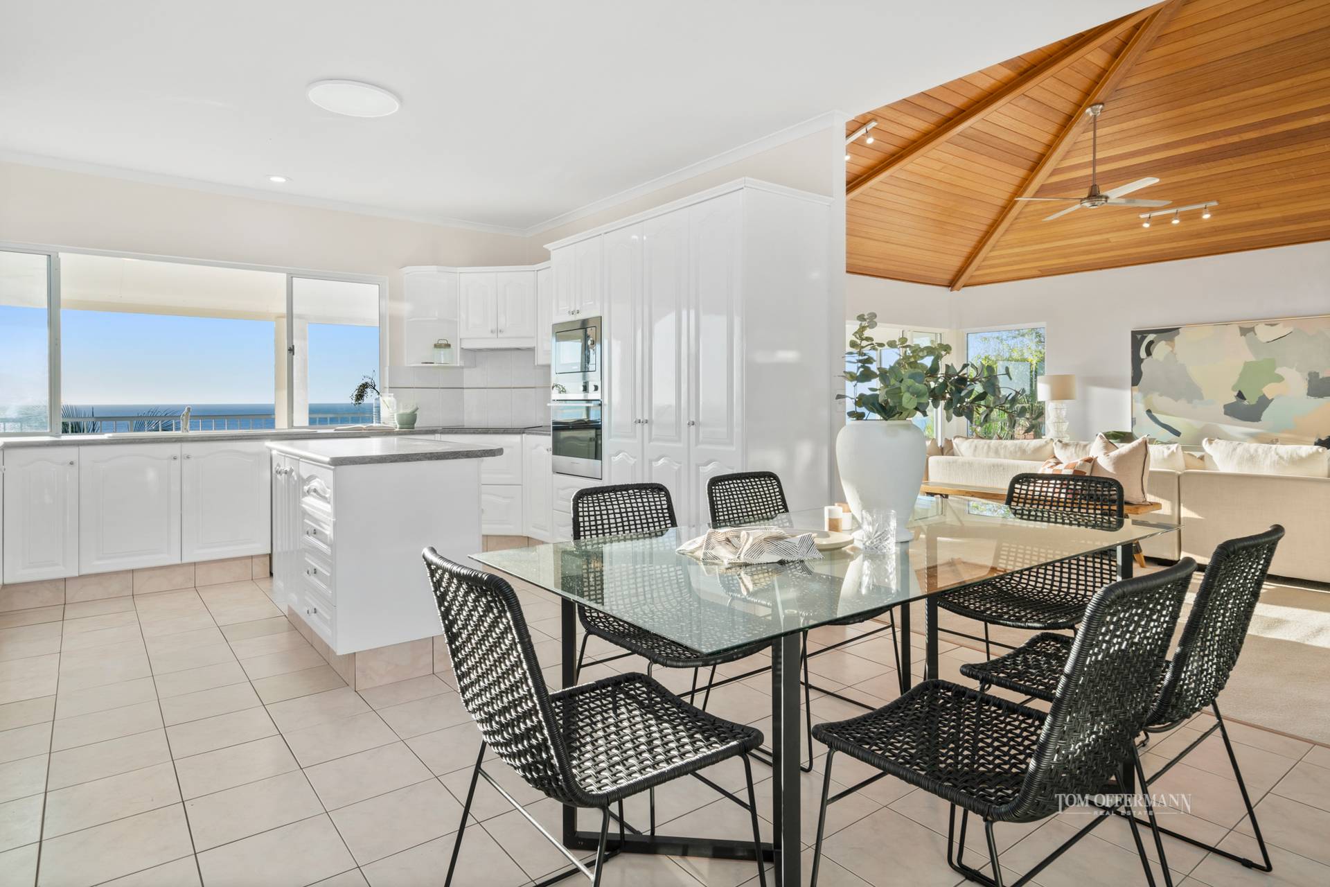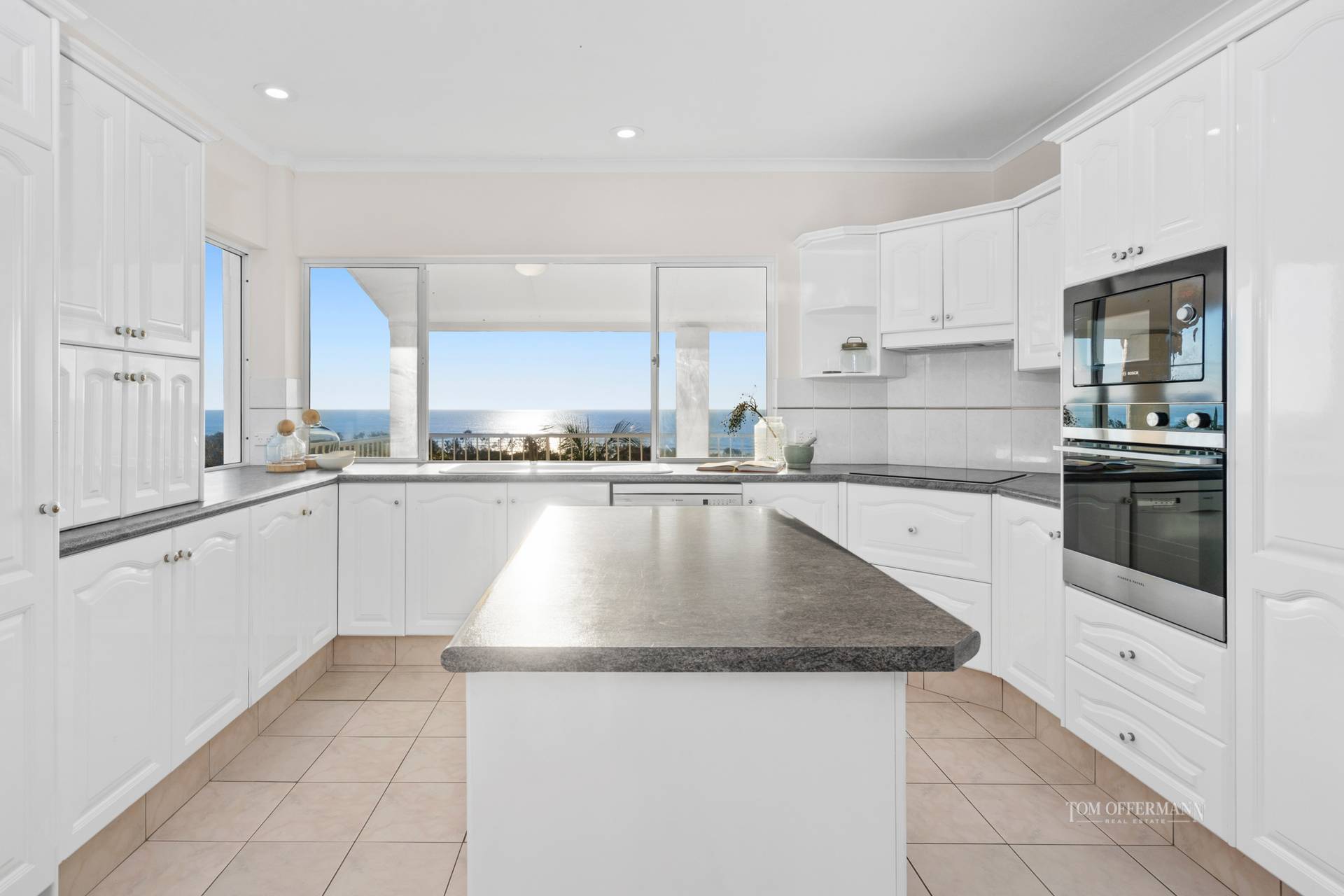 The hub of the home is undoubtedly the large kitchen with all-white cabinetry, extension servery, island bench and all the accoutrements needed by any culinary wizard who just might be inspired by the sea out front.