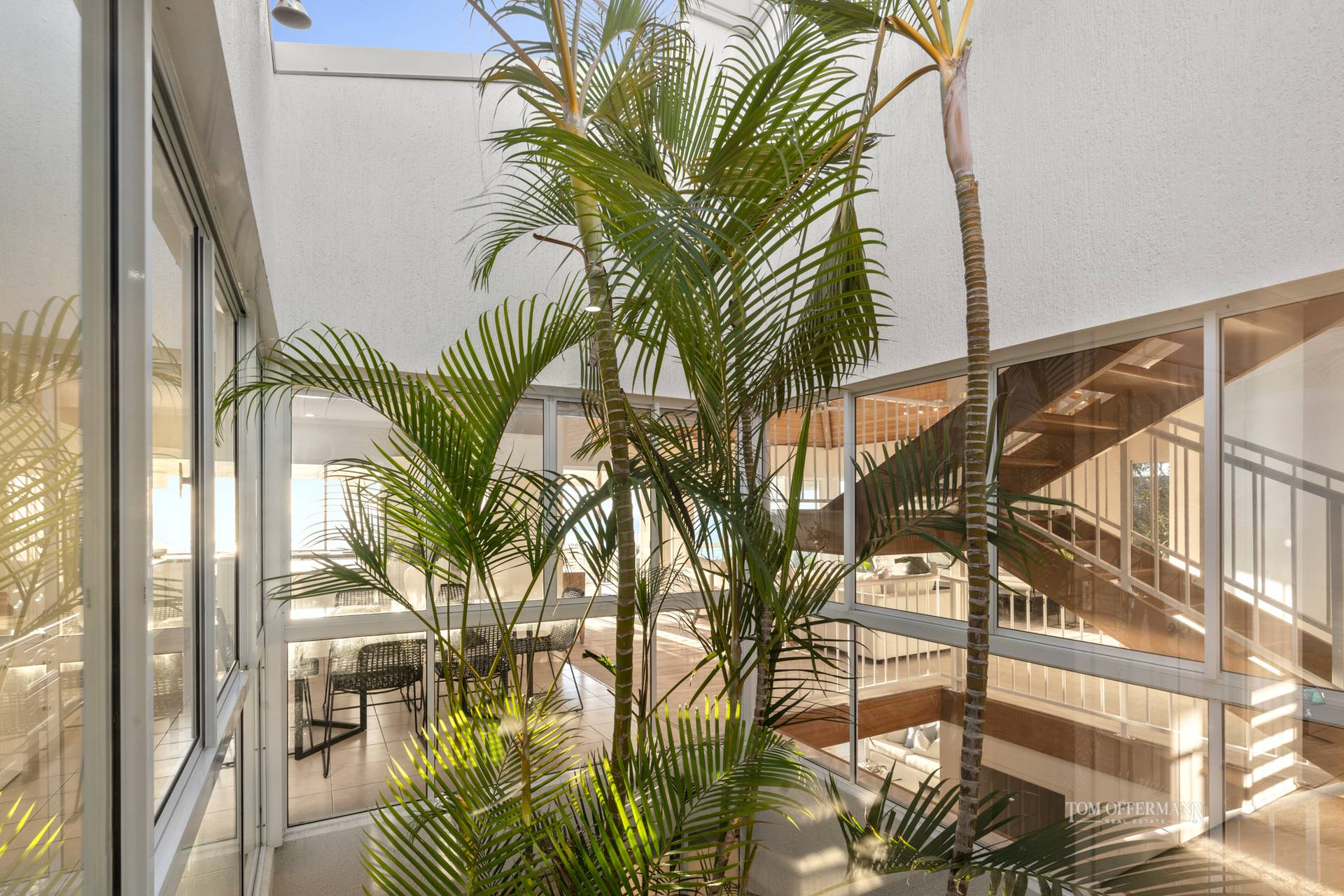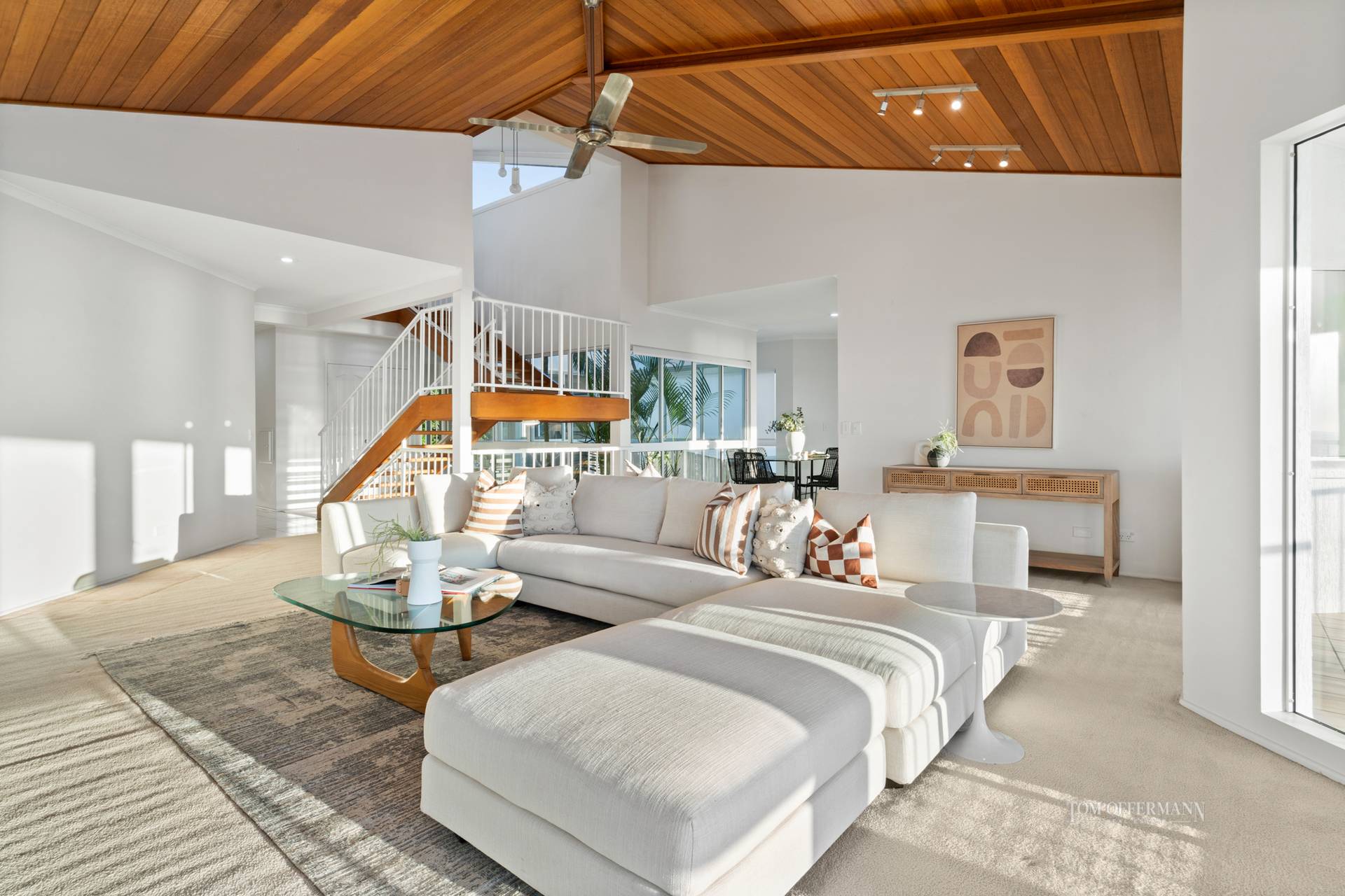 Inspired by late 20th century modern architecture, it has been maintained in the fashion by its current owners for over 25 years. There are vaulted cedar ceilings, classic detailing, a neutral palette (with a splash of pink and blue in the bathrooms), and light naturally shadow-dancing across flooring in the multiple over-generous spaces with several living, dining and entertaining options. An atrium with tips of palms peeking through from the floor below, takes centre stage.