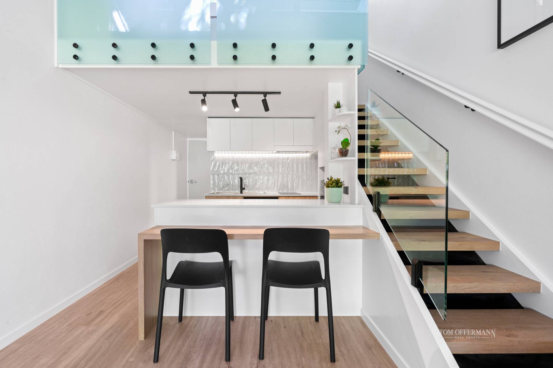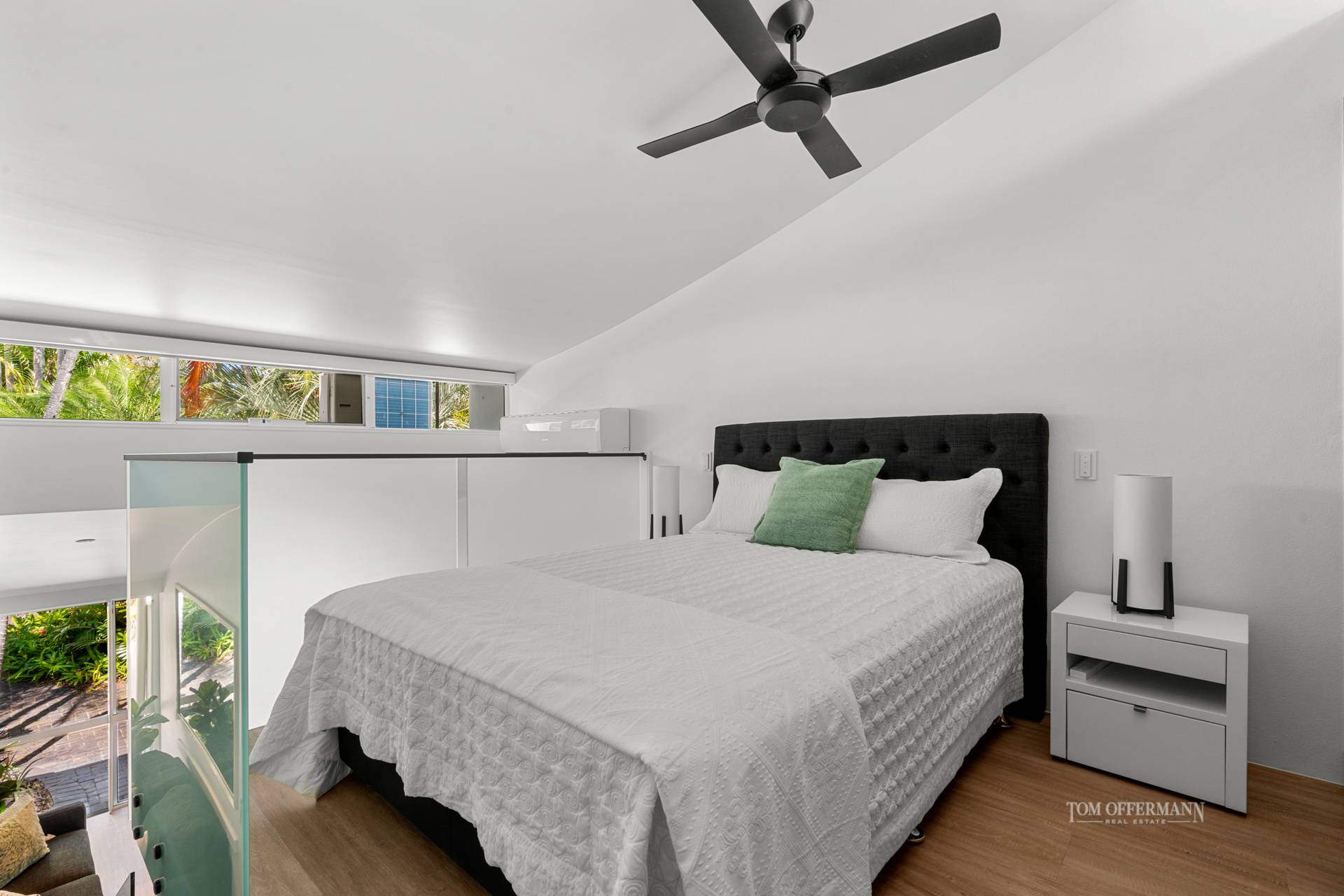 The mezzanine level bedroom with a wall of built-in robes, has a glass half wall so admiring the serene green outlook from bed spells relaxation.