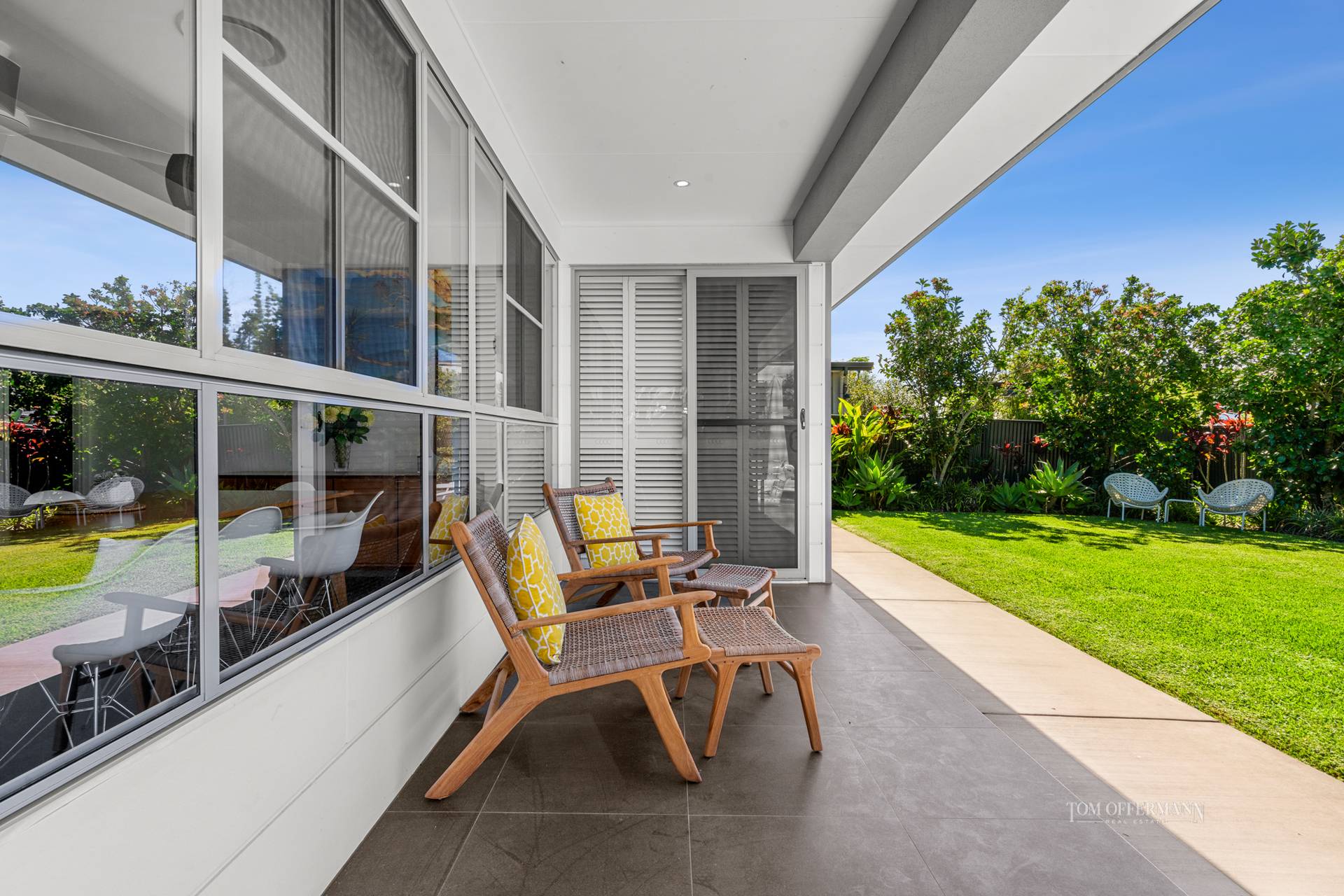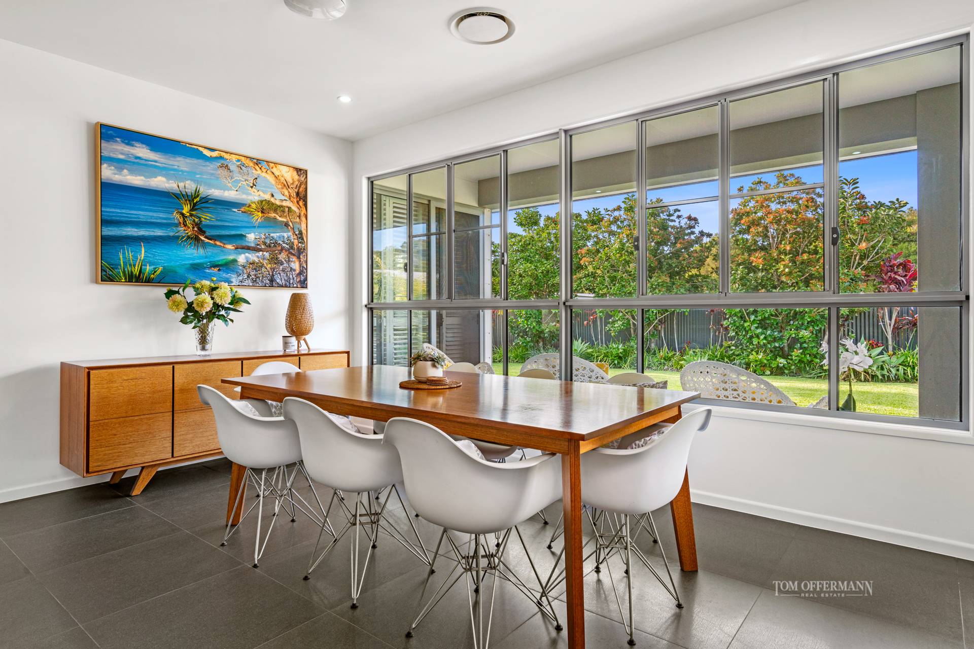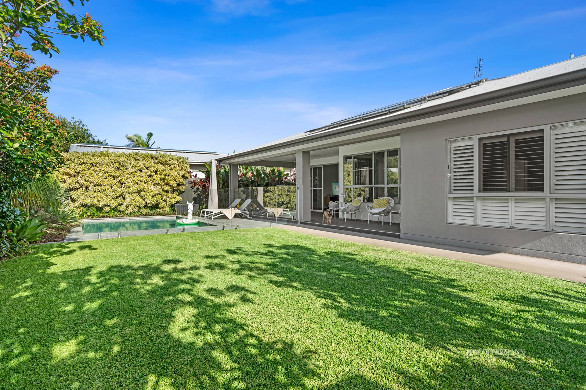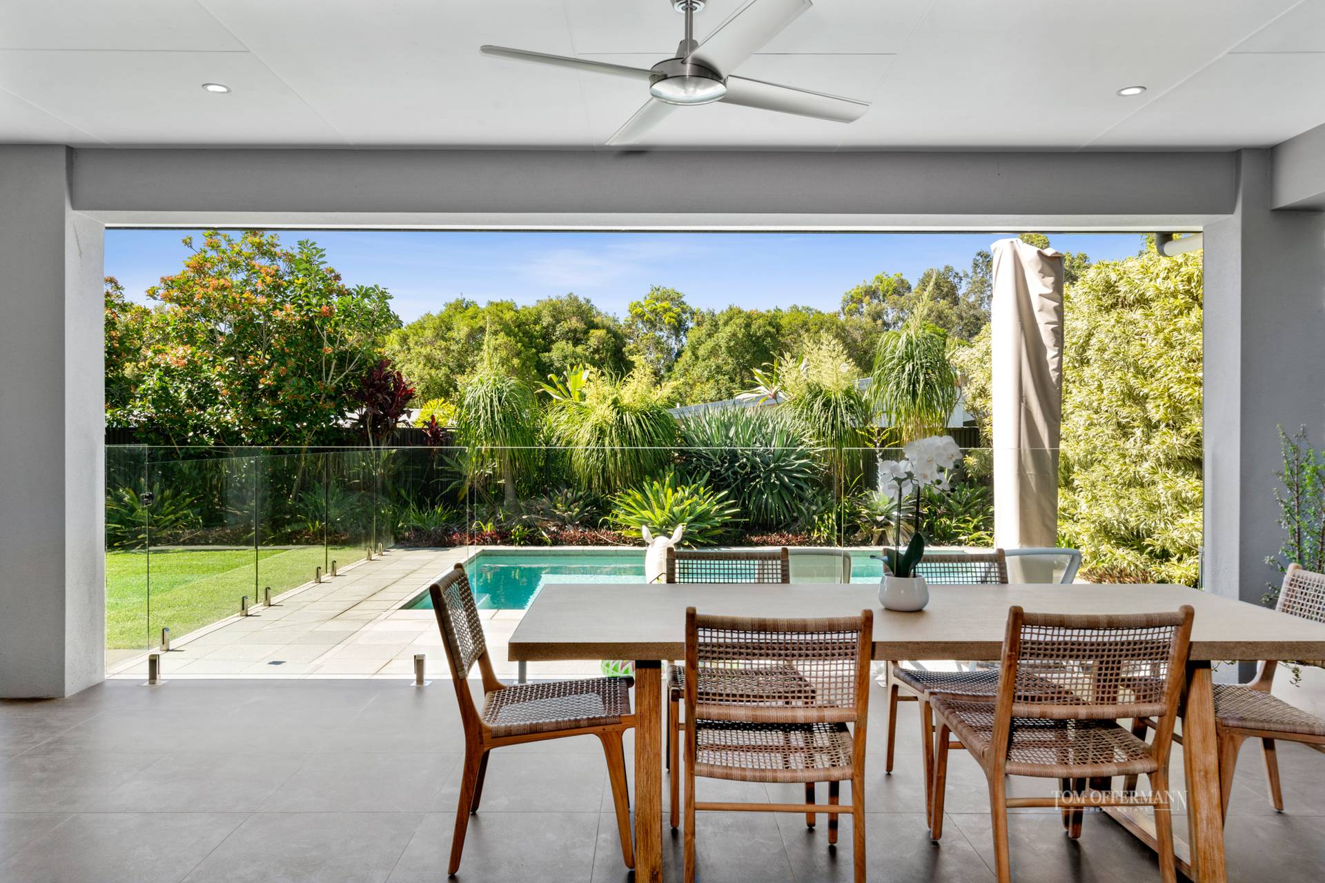 Be instantly impressed as indoors coalesces with outdoors thanks to the 'disappearing' doors revealing a lush lawn and a wide green backdrop to the fence line, fringed by sub-tropical dracaenas and brilliant orange/red heliconias.