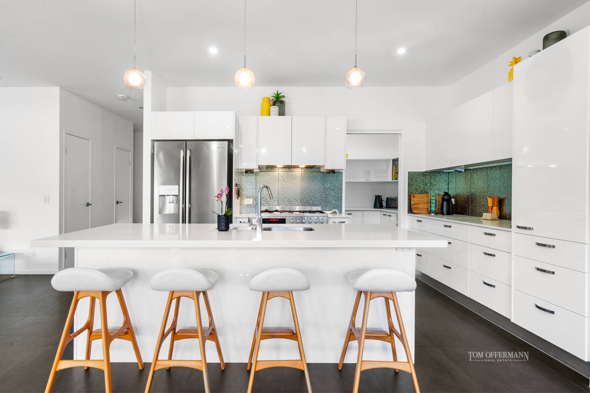 Design functionality is very evident in the kitchen with its stone-topped island bench, latest appliances, multi-burner gas cooktop, lustre-tiled splashback, white 2-pac cabinetry, and a walk-in pantry indicating storage is plentiful.