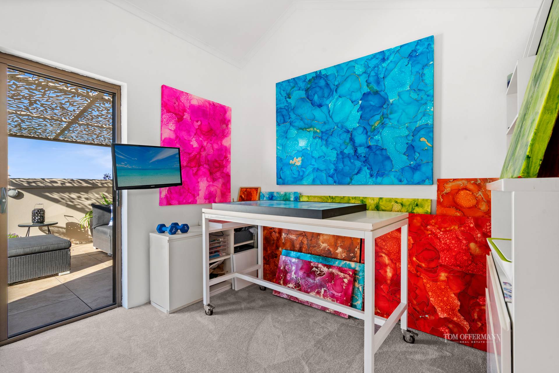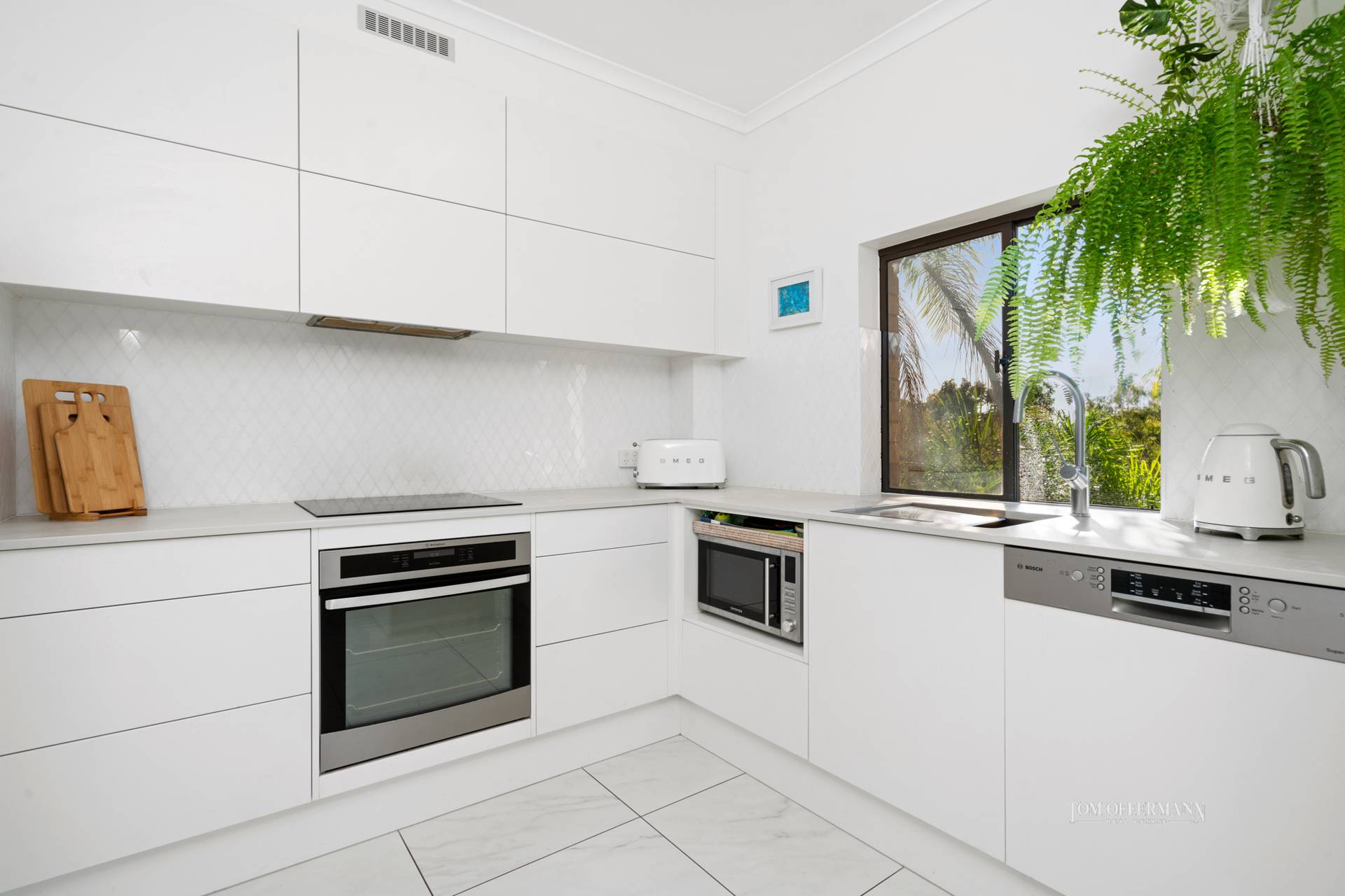 The crisp white C-shaped 2-pac kitchen with stone bench tops and the latest appliances, is everything a passionate cook would expect.