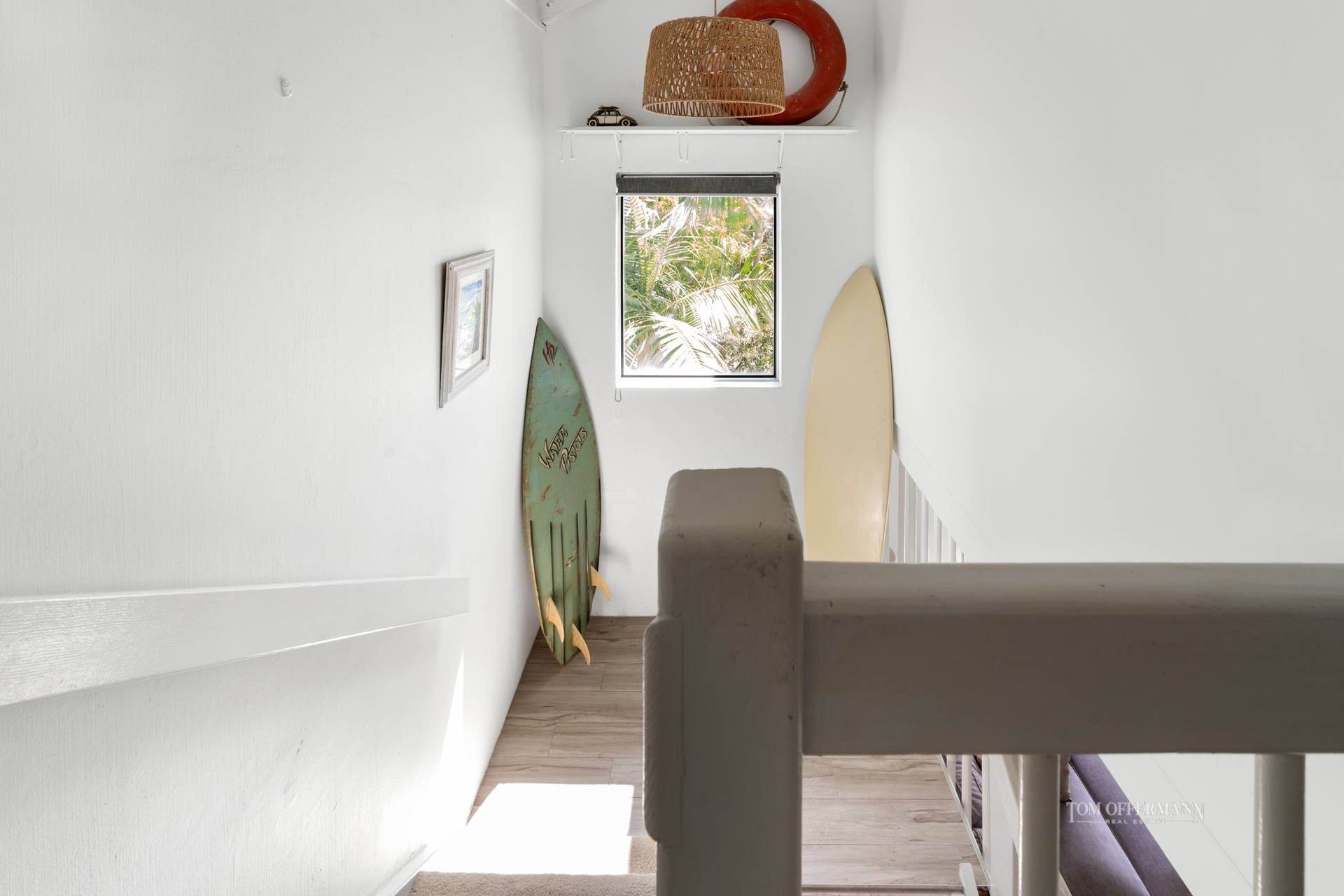 Upstairs, the delightful master bedroom showcases a beautiful ocean view plus a spacious built-in robe, air-conditioner, fan and soaring pitched ceilings. The light filled second bedroom connects to a versatile airconditioned loft room space, perfect for two additional beds.