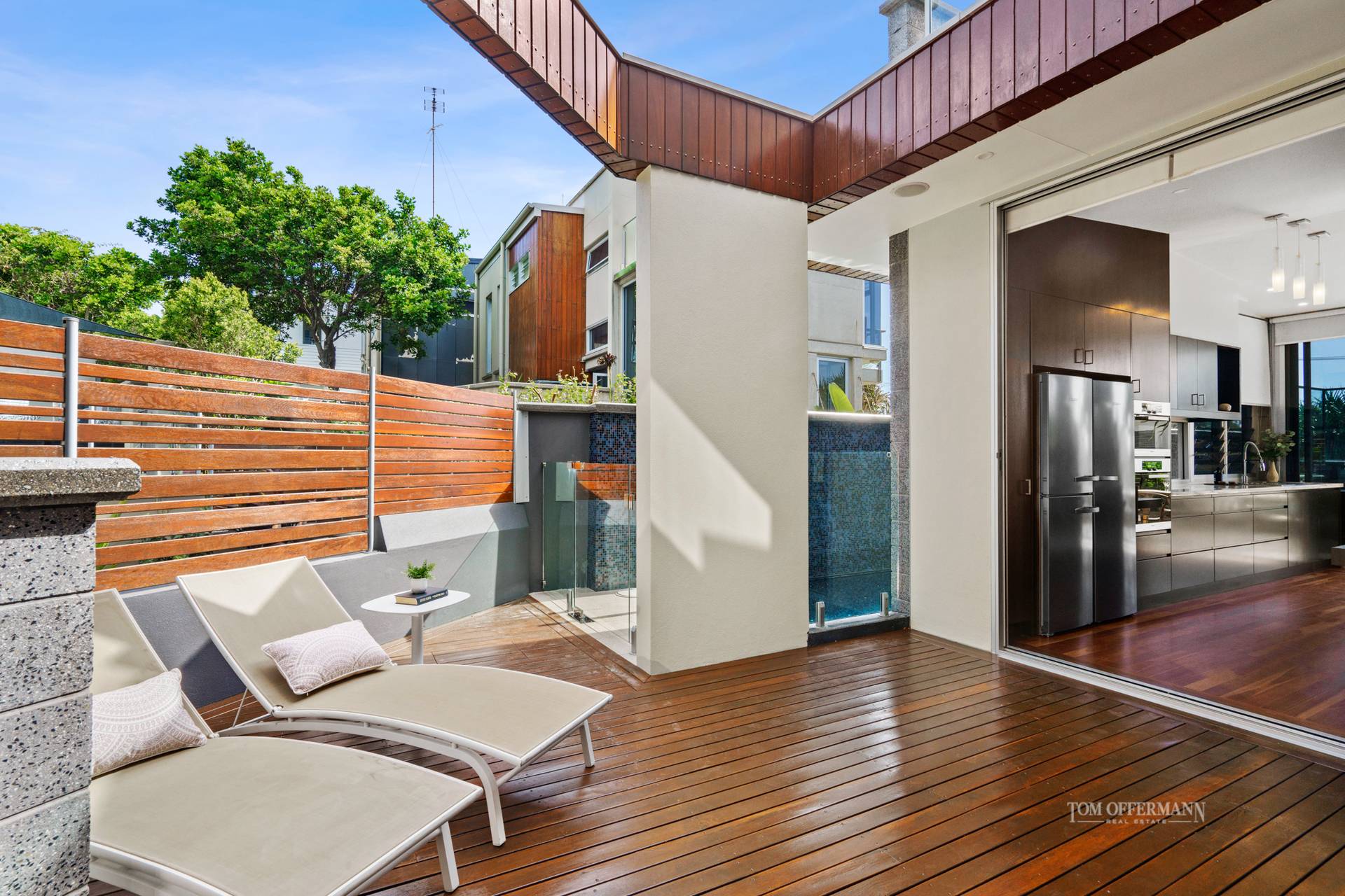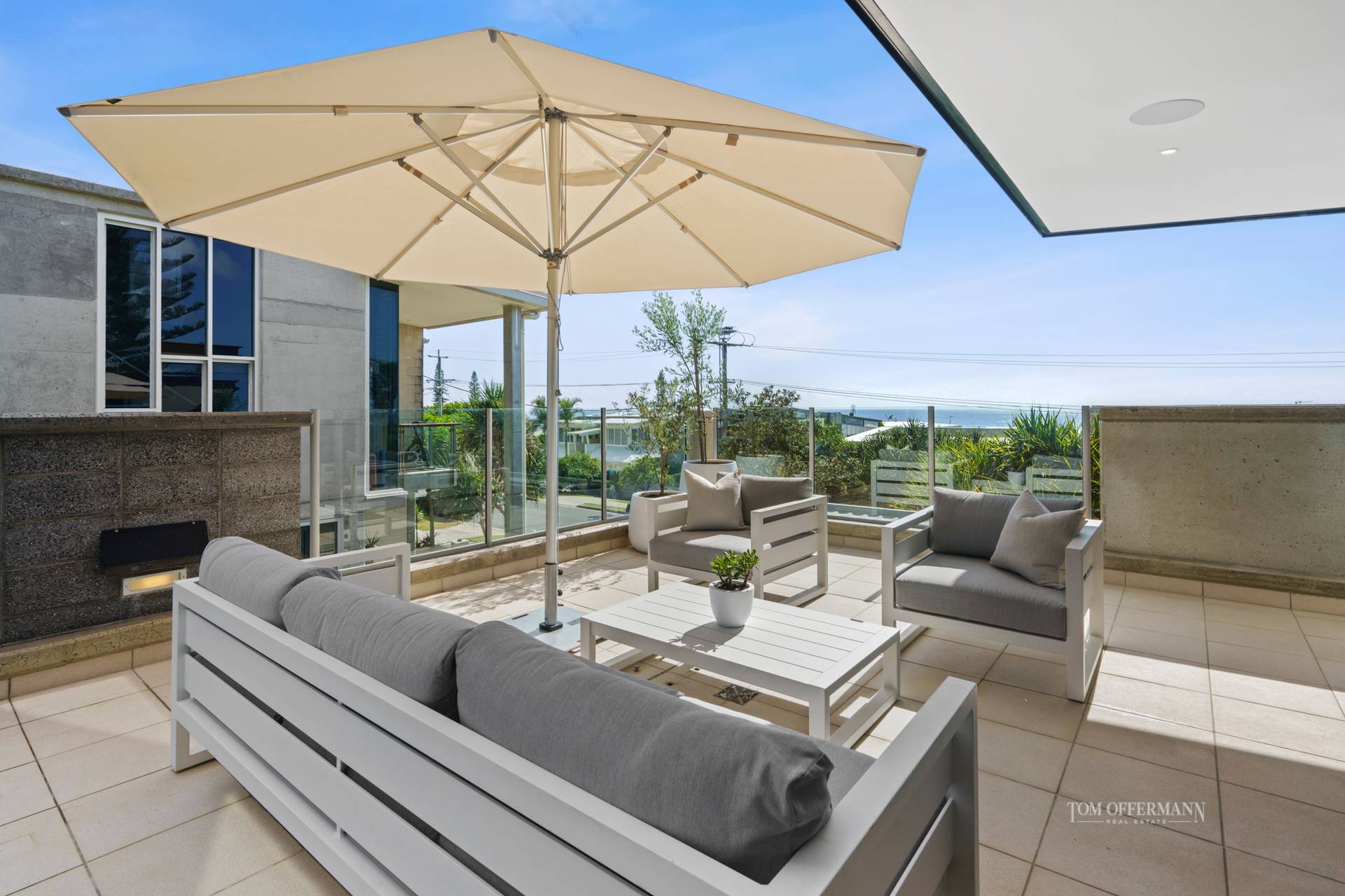 Continuing the sense of drama in the variation of spaces is a lavish dining plus living area with custom-built wood-hued cabinetry and glass framed spiral staircase. Head up stairs and once again, the residence keeps on giving, Coral Sea views from the ample roof terrace with the added condiments of salty breezes and the sound of the Coral Sea breaking onshore.