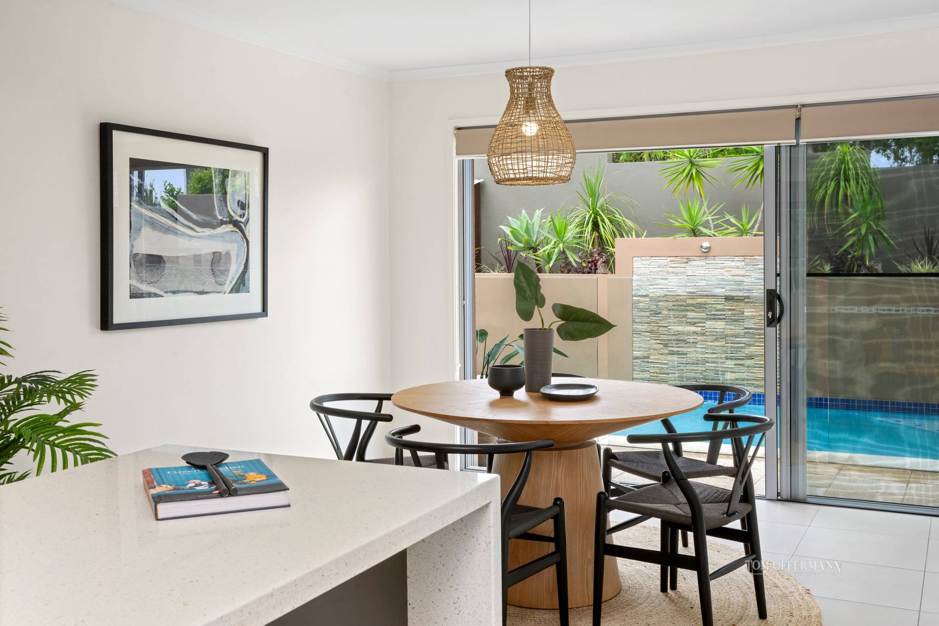 Enjoying the verdant outlook is a queen-sized bedroom with built-in robes, plus a bathroom and toilet cleverly designed to be 2-way, so guests and pool users can access it via the laundry door.